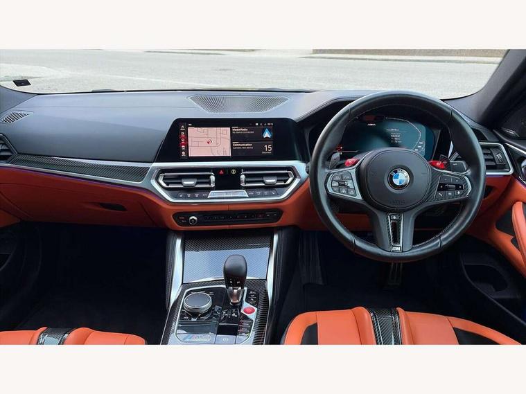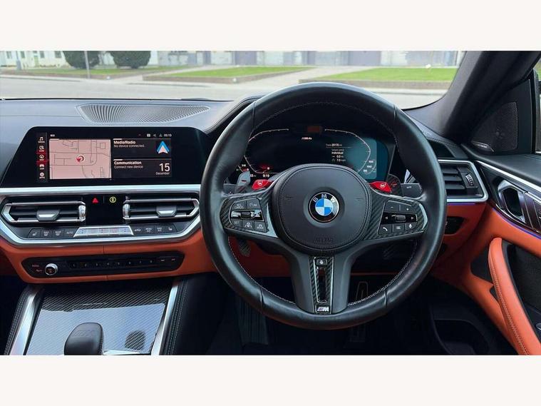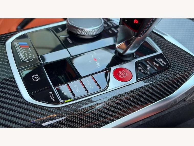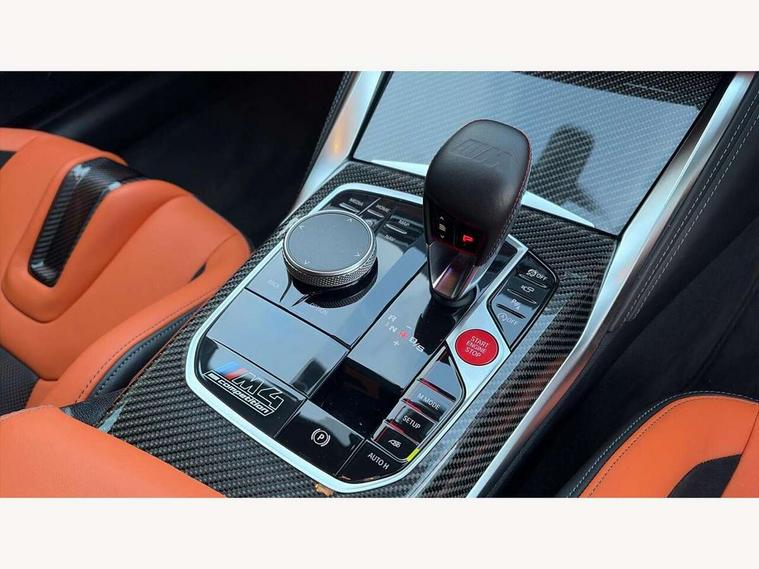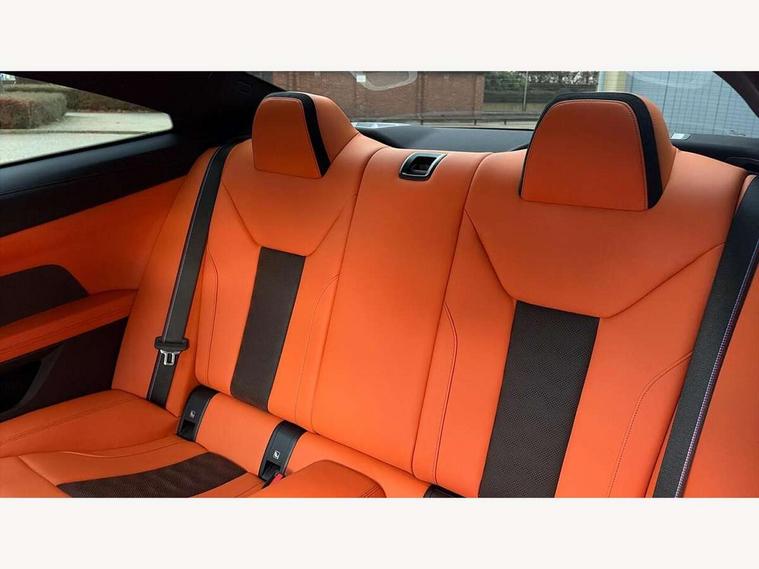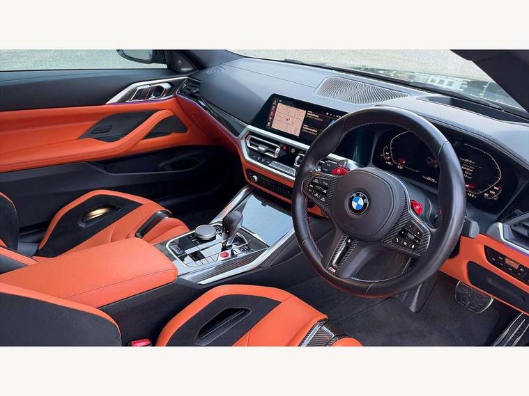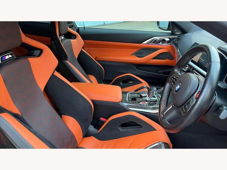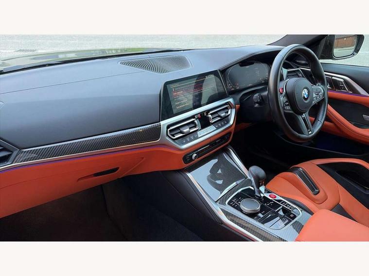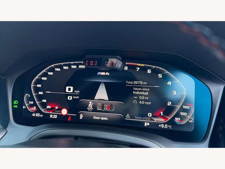 Automatic start/stop system, Bluetooth with USB, BMW gesture control, BMW iDrive controller on centre console, BMW legal emergency call, BMW Live Cockpit Professional sat nav system with 12.3" instrument display and high resolution control display, BMW Online services, BMW Teleservices, Brake pad wear indicator warning light, Door/boot open warning light, Electric Power Steering (EPS) with Servotronic, Head up Display, Instrument cluster with extended contents, Lights on warning, Oil sensor for level and grade, warning by check control system, Oil temperature gauge, On board computer, On board diagnostics, Optimum shift indicator, Outside temperature display, Pull away assistant, Run flat indicator, Service interval indicator, Speed limiter, Adaptive M Sport suspension, M Drive Professional including track mode, laptimer, traction control & Drift analyser, M Sport differential, M steptronic sport transmission with drivelogic, 8 programmable favourite buttons, Auxiliary point for auxiliary devices, BMW professional radio/CD/MP3, DAB Digital radio, Harman/Kardon loudspeaker system, Auto dimming driver's door mirror, Auto dimming rear view mirror, Automatic headlights + automatic windscreen wipers, Black chrome exhaust tailpipes, Black model designation badges, BMW high gloss shadow line with extended contents, BMW Individual shadowline lights, Body colour bumpers, Body colour door handles, Carbon fibre reinforced plastic (CFRP) roof, Day time running light, Door mirror integrated indicators, Door sill finishers with aluminium inserts, Dynamic brake lights, Electric adjustable heated door mirrors, Electric folding door mirrors, Follow me home headlights, Front and rear bumper system, Front electric windows with open and close fingertip control, anti trap facility and comfort closing, Heat protection, sun protection glazing, Heated rear window with automatic switch off, High beam assistant, High gloss black frameless kidney grille with M badge, LED number plate light, LED tail lights with 3D L-shaped LED light design, M designation, Mirror glass aspheric on driver's side, convex on passenger side, Rear fog lights, Rear reflectors, Shark fin roof aerial, Visible VIN plate, Welcome lighting, Windscreen wipers with integrated washing jets, 12V power socket in front centre console with blanking plug, 2 cupholders in front centre console, 2 rear head restraints, 40:20:40 manually split folding rear seat with two tilt positions for backrest, Ambient lighting, Anthracite headlining, Carbon fibre centre console incl. cover for cupholders, Carbon fibre decorative steering wheel finishers, Carbon fibre shift paddles, Carbon fibre strip in instrument panel on front passenger side, Compartment in front of cupholder, Driver/passenger sunvisors with illuminated vanity mirrors + covers, Electric front seats + driver memory, English handbook, Footwell lighting, Front and rear door exit lights, Front door storage bins with bottle holder, Front interior light, Front isofix attachment + airbag deactivation, Front seat backrest width adjustment, Front seats lumbar support, Front/rear door armrests, Gearshift lever with embossed M badge, Heated front seats, Height adjustable front headrests, Interior mirror lighting, Isofix on 2nd row outer seats, Lockable/illuminated glovebox, Luggage compartment lighting, Rake/reach adjustable steering wheel, Storage compartment in rear doors, Storage tray and compartment with cover in centre console, Three zone automatic air conditioning, Toolkit located in luggage compartment, Additional storage compartment pack - M4, Connected package professional - M4, High gloss shadowline exterior trim pack - M4, 4 x 3 point seatbelts, ABS/EBD, Automatic Stability Control (ASC), Brake energy regeneration, Brake fade compensation, Compound structure brake discs, Cornering brake control (CBC), Crash sensor, Driver/Front Passenger airbags, Dry braking, Dynamic brake control, Dynamic Stability Control with M Dynamic mode, Dynamic Traction Control - DTC, Electromechanical parking brake, Front and rear head airbags, Front seat side impact airbags, Front seatbelt pretensioners + load limiters, Hill start assist, M Sport seat belts, Seatbelt warning, Side impact protection, Two tone horn, Tyre pressure sensor, Warning triangle and first aid kit, Electronic immobiliser, Remote central locking, Thatcham cat 1 remote alarm, Vehicle Key with 4 buttons including the integrated key, Galvanic finish to control surrounds, High gloss black interior trim, Tyre repair kit,