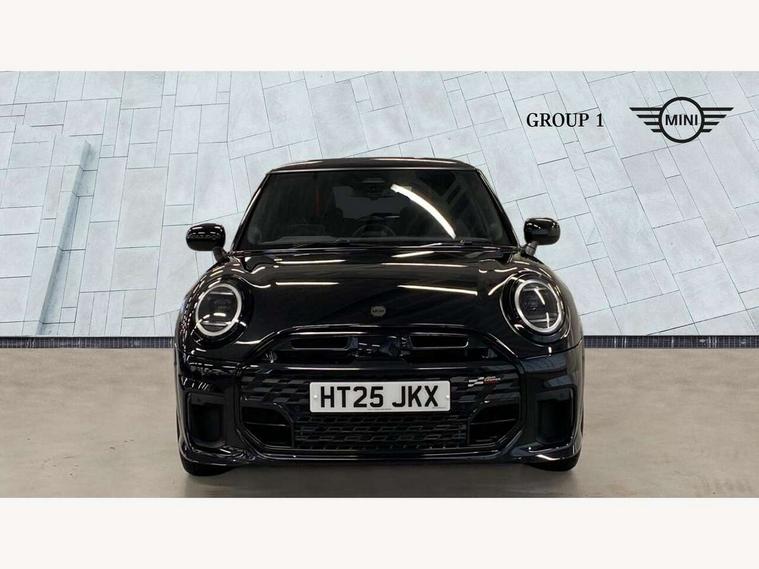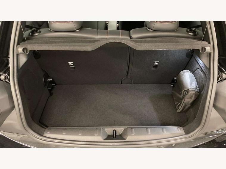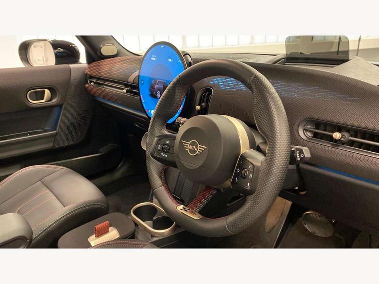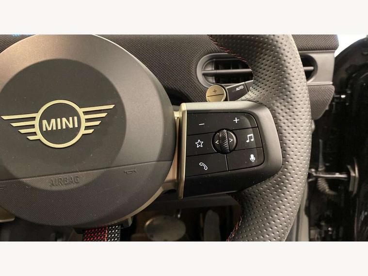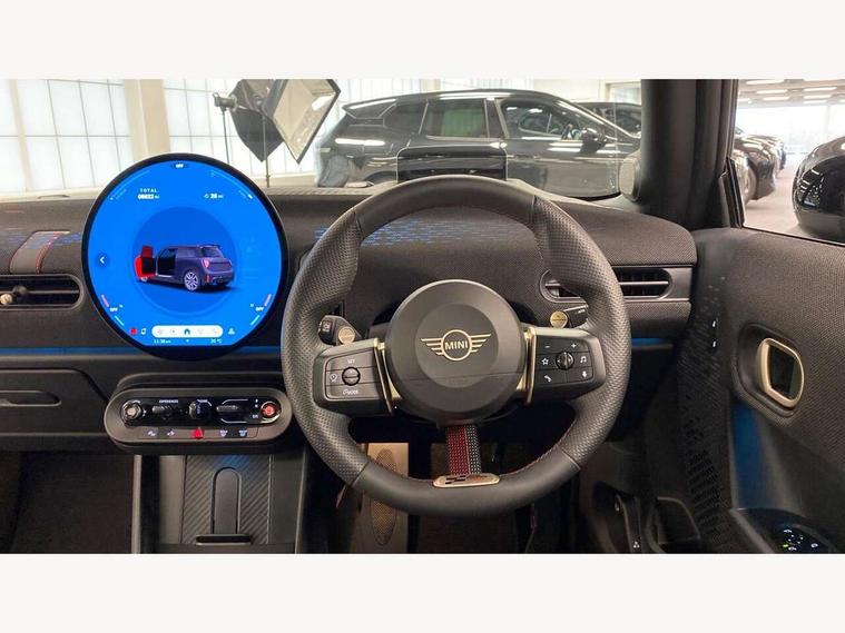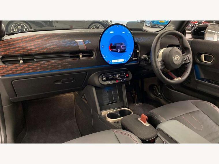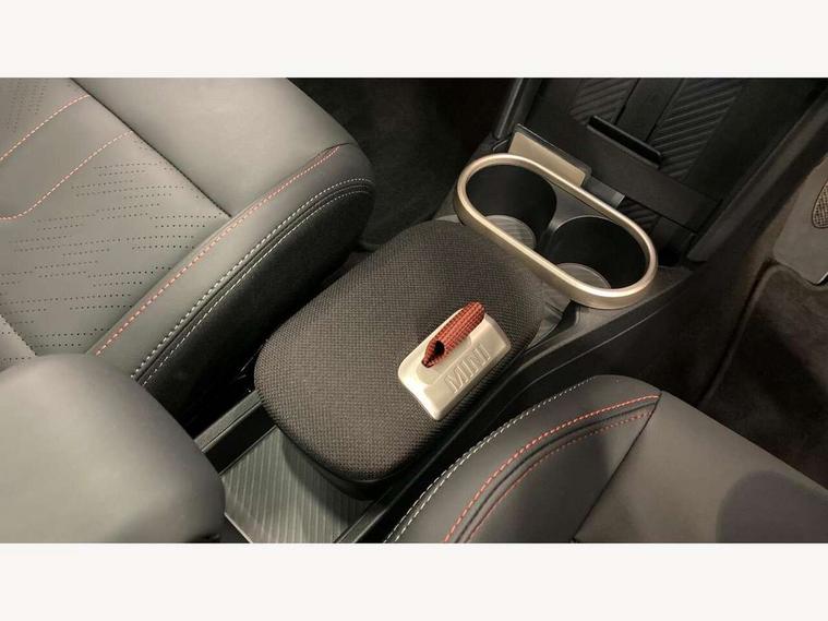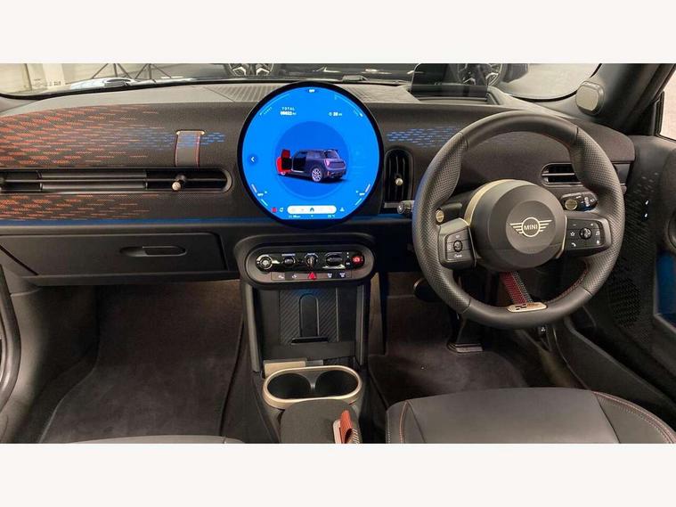 Central toggle bar, Circular OLED Screen, Compatible mobile phone bluetooth with audio streaming, Cruise control, Digital instrument cluster, Electro-mechanical speed dependant steering assistance, Emergency call service, MINI Experience Modes, Mini navigation system, On board computer, Service interval indicator, Tailgate, 7 speed steptronic transmission with double clutch, Adaptive suspension, DAB Digital radio, Personal eSim, Auto headlights, Electric adjustable heated door mirrors, Electric front windows, Front and rear apron, Heated rear window, Heated windscreen washer jets, High gloss black wheel arches, High gloss hexagonal patterned grille surround, JCW body kit, LED 3rd brake light, LED daytime running lights, LED Headlights, LED indicator lights, LED rear lights, Rain sensor window wipers, Rear fog lights, Rear roof spoiler with airblades, Rear window wiper, 2 seat bench in second row, 2 zone automatic air conditioning, 60/40 rear seat bench, Ambient lighting, Black lower band in high gloss, Cupholders, Dark headliner, Front and rear head restraints, Front compact armrest, Front floor mats, Heated steering wheel, Height adjustable passenger seat, Lidded storage box in Black/Red knit, Luggage compartment lighting, Partially perforated vescin steering wheel with red accent, black/red decorative strap, Single front passenger seat, Steering wheel paddle shift, Sunvisors with vanity mirrors, Vescin/Cord combination JCW upholstery includes dash knit in black with red accents, Driving assistant pack - Cooper Hatchback, Park assistant pack - Cooper Hatchback, 3 point seatbelts on all four seats, 6 Airbags - front, side, head and seat belt tensioners, Anti-lock braking system (ABS), Brake caliper in Black with JCW badge, DSC - Dynamic Stability Control, Electronic parking brake, Front and rear disc brakes, Front ISOFIX (iSize), Front passenger airbag deactivation, JCW Sport Brakes, Traction control, Tyre pressure monitoring system, Alarm, Immobiliser, Remote central locking, Black/Red decorative dash strap, Tyre repair kit,