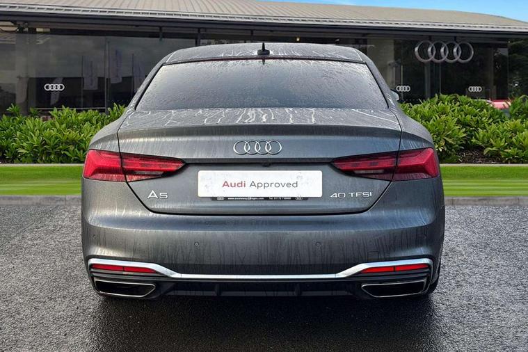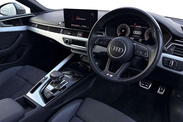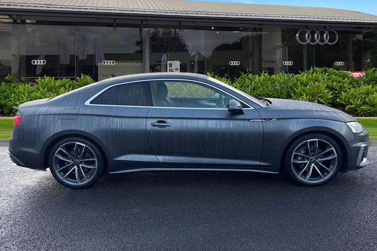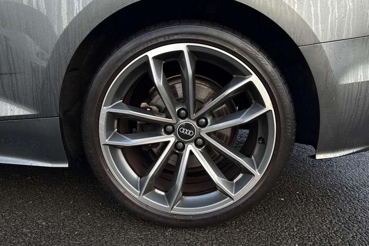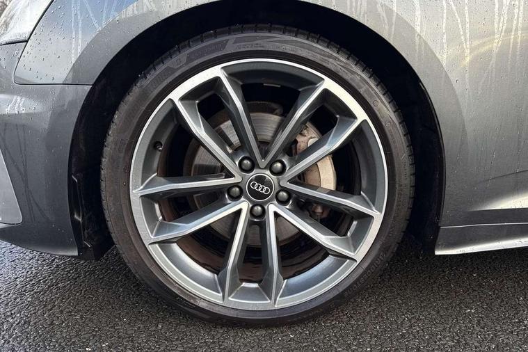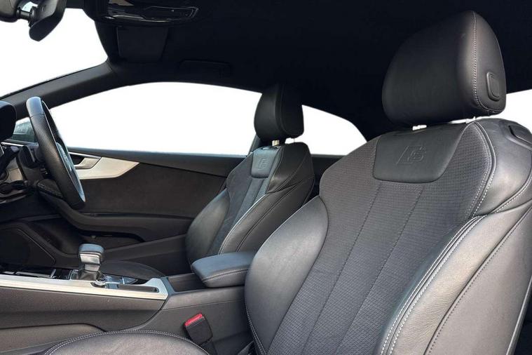 Matt brushed aluminium inlays, LED interior light pack - A5/RS5, Tyre repair kit, Anti theft alarm system, Anti theft wheel bolts, Immobiliser, Keyless Go, Remote central locking, 8 passive loudspeakers, CD player, DAB digital radio reception, Two additional USB ports for rear passenger in rear centre console, Two SDXC card slots, 2 x 3-point rear seat belts, 6 airbags - Driver, front passenger, curtain and side airbags, Electromechanical parking brake, Electronic Stabilisation Control (ESC) including ABS, ASR and EDL, Front passenger airbag deactivation, Height adjustable front seatbelts, Hill hold assist, Multi collision brake assist, Pop-up bonnet for pedestrian protection, Pre sense city, Seatbelt monitoring, Tyre pressure warning, Variable restraint system, Warning triangle and first aid kit, Audi matrix LED headlights with LED rear lights + dynamic front and rear indicators, Auto dimming rear view mirror, Body colour bumpers, Body colour door handles, Body colour front spoiler lip, Body colour side sill trim, Body coloured door mirrors, Electric adjustable heated door mirrors, Electric folding door mirrors, Electric front windows, Front fog lights, Honeycomb structure radiator grille in grained matt black, LED daytime running lights, LED third brake light, Matt aluminium silver tailpipe trim, Privacy glass, Rain and light sensors, Rear side wing doors, S line badges on front wings, S line front and rear bumpers with side skirts, S Line rear diffuser in matt titanium black with trim strip in matt aluminium silver, Side air inlets in grained matt black with matt aluminium silver inlay, Variable front intermittent wipers, Windscreen with acoustic glazing, 4 way electric lumbar support for driver and front passenger, 40/20/40 split folding 2 seater rear seat bench with rear centre armrest, Adjustable steering column, Black cloth headlining, Black perforated leather gearknob, Contrast stitching on seats, steering wheel and gear lever gaiter, Deluxe 3 zone electronic climate control, Front centre armrest, Front head restraints, Front/rear floor mats, Heated front seats, Illuminated door sill trim with S logo, ISOFIX child seat mounting and top tether, Luggage compartment mat, Manual seat adjustment, Rear headrests, Single front passenger seat, Stainless steel pedals, Sunvisors with vanity mirrors, Tool kit, Audi connect safety and service (e-call), Audi connect with Amazon Alexa Integration, Audi drive select (Auto, Comfort, Dynamic, Efficiency and Individual), Audi parking system plus with front and rear sensors, Audi smartphone interface, Audi virtual cockpit - 12.3" full colour digital instrument cluster, vehicle/engine speed, 3D navi map, Radio/media information+Driver assistance systems, Automatic start-stop system with coasting functionality and efficiency programme, Bluetooth interface, Electric boot lid release, Electro-mechanical power steering, Email, calendar and text messages displayed via MMI, MMI nav+ with MMI touch - 10.1" high resolution MMI display, touch sensitive, 3D map, route/country info, dynamic route guide, personal route assist, Rear view camera, Service interval indicator, Voice control system, Sports suspension lowered by 23mm,