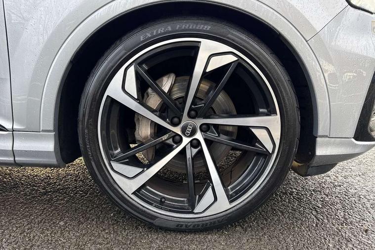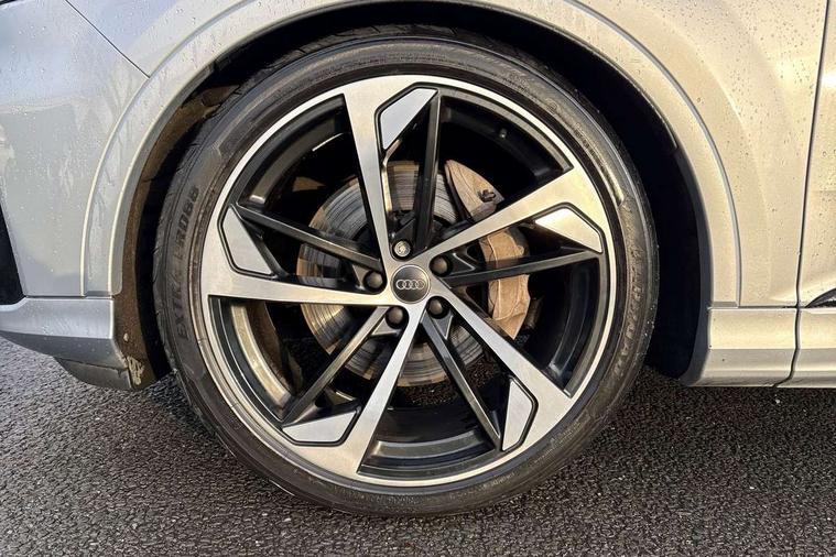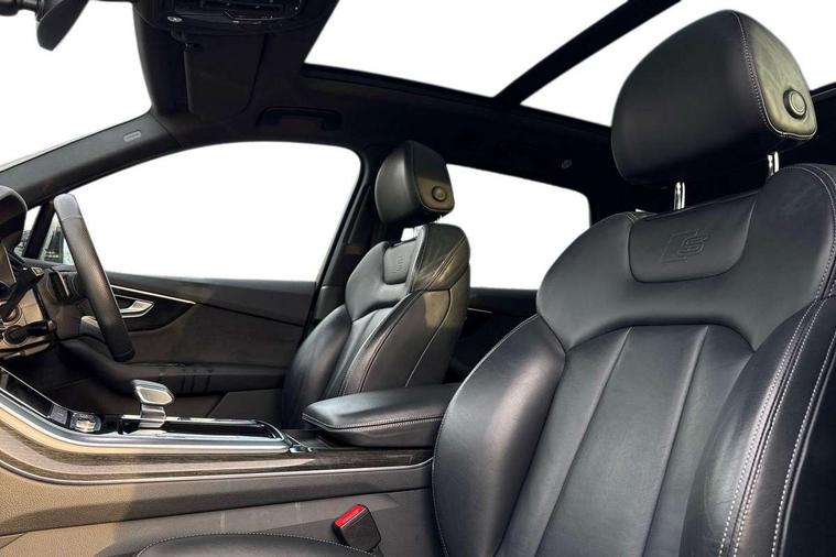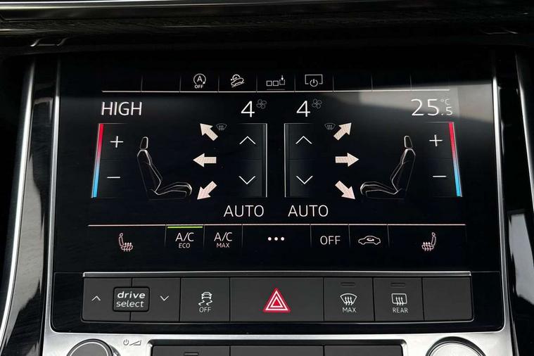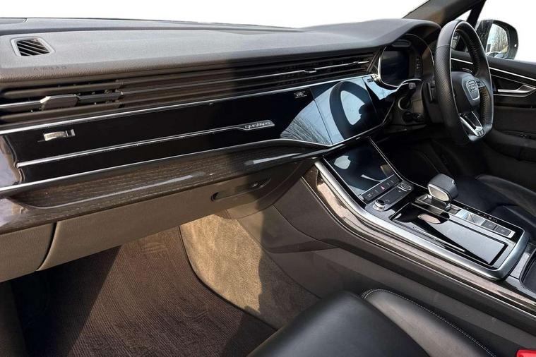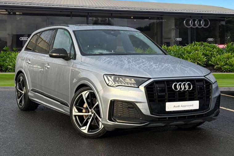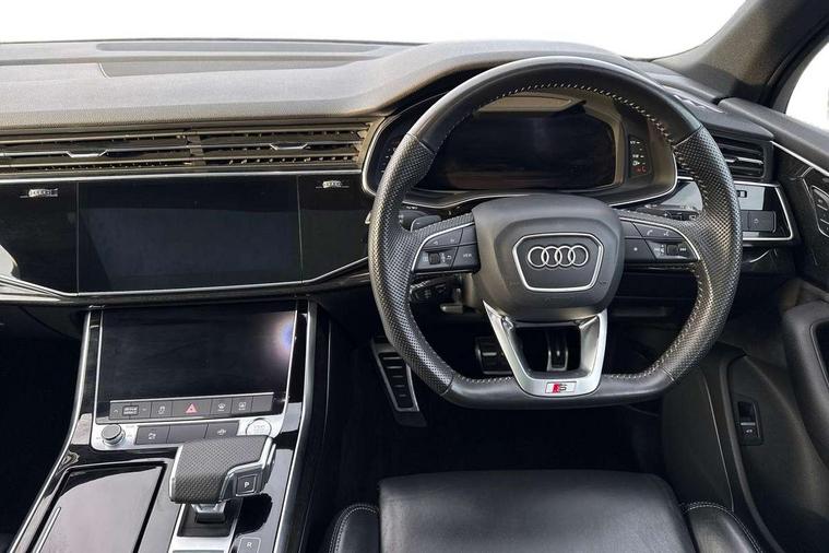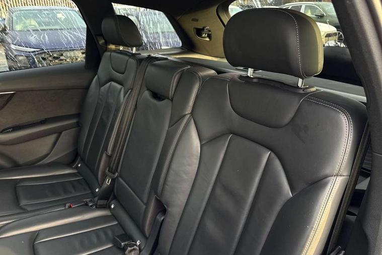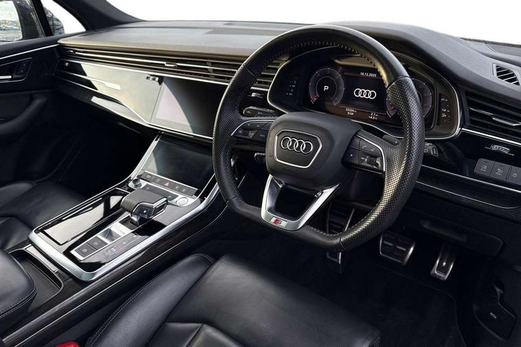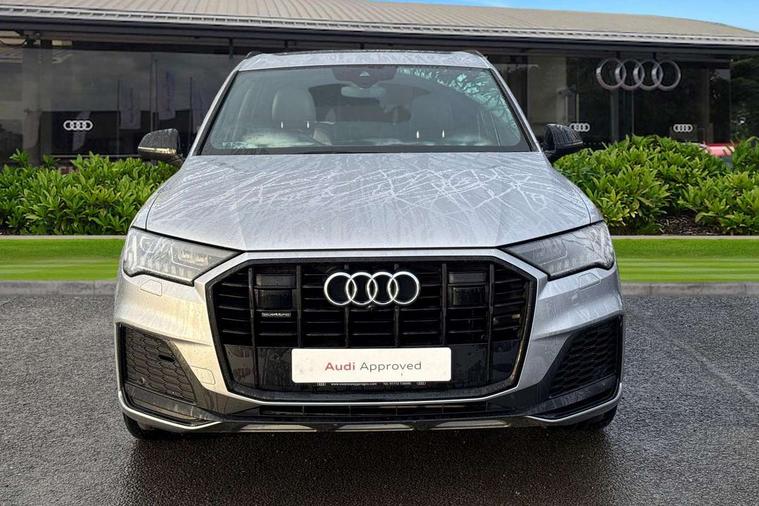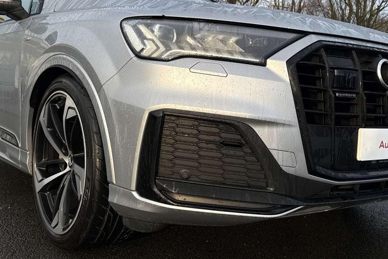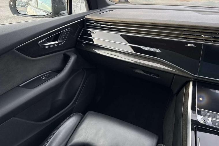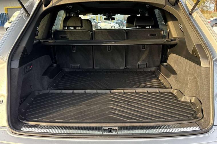 Audi connect safety and service (e-call), Audi drive select (Auto, Comfort, Dynamic, Efficiency, Individual, Off-road and All road), Audi phone box with wireless charging, Audi smartphone interface includes wireless Apple carplay/Android Auto, Camera based traffic sign recognition, Electromechanical steering, MMI navigation plus with MMI touch screens includes 10.1" and 8.6" screens with haptic feedback, Natural voice recognition, Parking system plus - front + rear sensors, Power operated tailgate, Rear view camera, Start/stop system, 48V Mild hybrid technology, Adaptive air sports suspension, Quattro all wheel drive with self locking centre differential, Audi music interface - front 2 USB-C ports with charger and data functions, Audi sound system with 6 channel amplifier, 180 watt amplifying capacity and 10 loudspeakers including subwoofer, DAB digital radio module, Audi matrix LED headlights with dynamic front and rear indicators, Auto dimming frameless rear view mirror, Black roof rails, Bumpers in contrast paint scandium grey finish includes door trim and wheel arch trim strips, inlays in door strip contain quattro embossing, Electrically adj heated/folding + automatically dimming exterior mirrors with memory + automatic kerb side function for passenger side exterior mirror, Heat insulating glass in windshield, Integrated LED indications in door mirrors, LED daytime running lights, LED rear tail lights, Privacy glass - dark tinted rear and rear side windows from B-pillar backwards, 4 zone deluxe automatic climate control, 7 seat layout with ISOFIX points for the front passenger seat and rear passenger seat, Comfort front centre armrest, Folding rear seats, Front head restraints, Front/rear floor mats, Heated front seats, LED interior ambient lighting, Luggage compartment cover, Luggage compartment sill protection in stainless steel, Rear head restraints, Stainless steel pedals, Tool kit, Titanium black styling pack - Q7/SQ7, 3 point seatbelts on all rear seats, Audi pre sense front, Driver and front passenger, front side and curtain airbags, Electromechanical parking brake, Electronic Stabilisation Control (ESC) including ABS, ASR and EDL, Extended pedestrian protection measures, Hill hold assist, Seatbelt monitoring, Tyre pressure loss indicator, Warning triangle and first aid kit, Anti theft alarm, Anti-theft wheel bolts and wheel loosening detection, Keyless go with remote central locking, Polished oak trim with grey finished, Tyre repair kit,