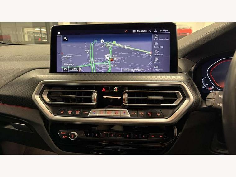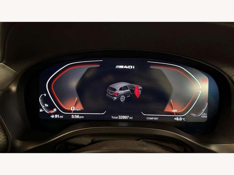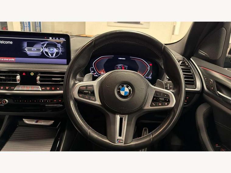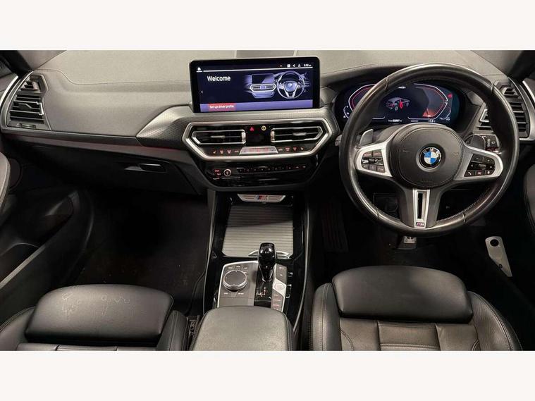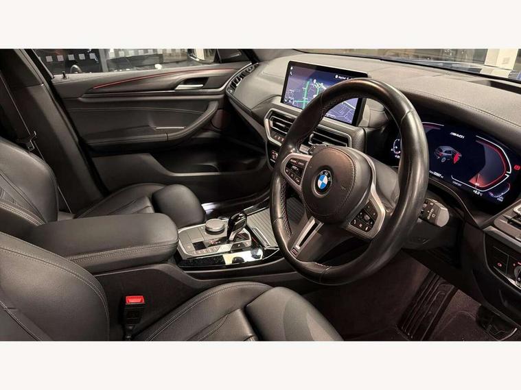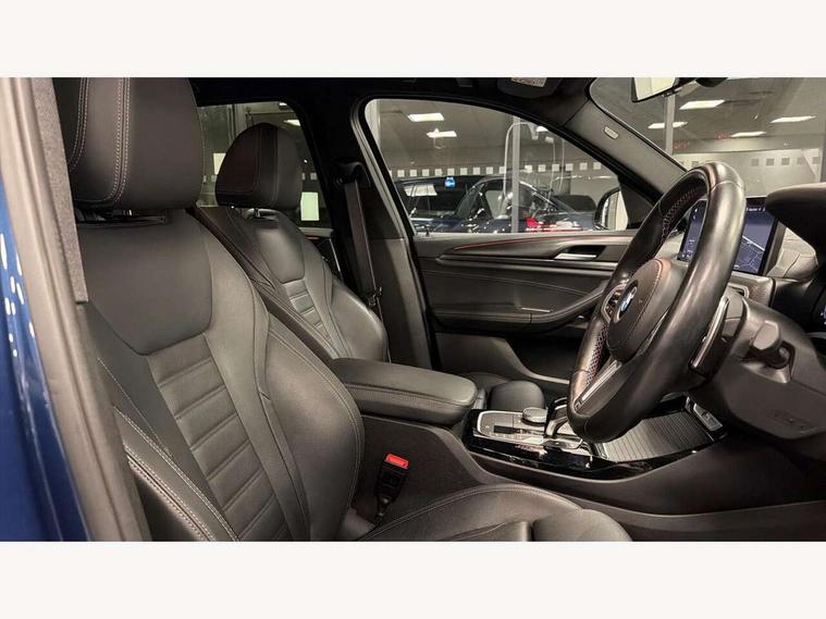 Active Guard, Attentiveness assist, BMW Live Cockpit Professional nav system including 12.3" instrument display + 12.3 high resolution control display, BMW Online services, BMW Teleservices, Brake pad wear indicator in front and rear, Check Control warning system for monitoring of lights and door/luggage compartment open warning, Condition based service - BMW service history, electronic service booklet, integrated owner's handbook, Connected drive services, Deletion of driving assistant professional, Electric boot lid, Front/rear Parking distance control, iDrive Controller with 8 favourite buttons, Instrument cluster with speedometer with mph readout, tachometer, fuel gauge and oil temperature gauge, Lights on warning by audio warning signal when ignition is switched off, Oil sensor for level and grade, warning by check control system, On board computer - average speed+fuel consumption, service interval, clock/date, odometer/trip meter, outside temperature display and ice warning, Optimum shift indicator, Personal Profile - automatic lock when driving away selectable, Run flat indicator, Stop/start system, Variable sports power steering with drive performance control Sport+ mode, Incorrect fuelling protection, M Adaptive suspension, M Sport differential, Multi-link rear suspension, Performance Control, Sport automatic transmission with gearshift paddles, BMW professional radio/CD/MP3, DAB tuner, Acoustic glazing, Automatic windscreen wipers and automatic headlight, Black finish on B pillars, BMW individual high gloss shadow line with extended content, Body colour door handles, Body colour roof mouldings, Body coloured bumpers, Direction indicator, side repeaters, integrated in exterior mirrors, Dynamic brake lights, Electric adjust heated aspherical door mirrors, Exhaust tailpipes - dual, round, split left and right with chrome finisher, Fingertip control / anti-trap function on electric window, Folding wing mirrors with auto dimming, Follow me home headlights, Front and rear bumper system with replaceable deformation elements, Front and rear electric windows, Green tinted heat insulating glass, Heated windscreen washer jets, High beam assistant, High gloss black shadow line roof rails, High gloss shadowline exterior trim in decorative moulding side frame/recess cover/guide rail/B, C pillars/mirror frame and triangle with mirror base, High level 3rd brake light incorporating LED Technology, Interior rear view electrochromatic mirror with automatic anti dazzle function, Kidney frame and struts painted in high gloss black, LED tail lights, Lightweight engineering, M aerodynamic bodystyling, M black mirror caps, M Sport entry door sill strips, Model designation, Rain sensor, Rear side wing doors, Rear wing door, Rear wiper, Shark fin antenna, Side exterior M designation badges, Sun protection glass, Visible VIN plate, Welcome lighting, Windscreen wipers with adjustable interval, 12V power point in luggage area, 12V power socket in front centre console, 3 rear headrests, 3 seat bench in 2nd row, 3 zone automatic air conditioning, 4 lashing points to secure luggage, 40:20:40 split folding rear seat with loading system, Ambient lighting, Anthracite headlining, Automatic interior light when door is opened/ignition switched off or via remote key, Electric adjustable seats with memory function, Floor mats in velour, Foldable storage floor with compartment, Four grab handles integrated in roof lining, Front and rear bottle holders integrated into door trim storage compartments, Front and rear side armrests integrated into door trim, Front centre armrest with storage compartment, Front footwell lights, Front head restraints, Front passenger seat, Front/rear courtesy lights with soft on/off dimming, Front/rear reading lights, Heated front seats, Isofix rear child seat preparation, Leather gear knob, Luggage area underfloor compartment, Luggage compartment lighting, M sport leather steering wheel, Multifunction steering wheel, Parcel shelf removeable and storable under boot floor, Reach and rake adjustable steering column, Rear centre armrest with 2 cupholders, Removable / retractable luggage cover, Slope adjustable rear seats, Storage compartment in rear centre console and front/rear door trims, Sun visors with vanity mirrors and ticket pocket, Toolkit located in luggage compartment, Two front cupholders with removable oddments tray/lid, Vernasca leather upholstery, Connected pro pack - X3, Active protection, ADB - Automatic Differential Brake, Anti-lock braking system (ABS) with brake assist, Automatic Stability Control (ASC), Battery safety cut-off, BMW emergency call, Brake drying, Brake energy regeneration, Braking pre-tensioning, Child locks on rear doors, Cornering brake control (CBC), Crash Sensor - activation of central locking release, hazard warning light and interior lighting, Deactivation of fuel pump in the event of a crash, Driver and front passenger front and side airbags with passenger deactivation and ITS front and rear head airbags, Driver and front passenger knee airbag, DSC+, Dynamic brake control, Dynamic Traction Control - DTC, Electromechanical parking brake, Hill descent control, Hill start assist, M sport seatbelt, Seatbelt security check for front seats, Side impact protection, Three point seatbelts to all seats with front and outer rear pyrotechnic belt tensioners and seat belt force limiters, Two tone horn, Tyre pressure sensor, Ventilated front and rear disc brakes, Warning triangle and first aid kit, Central locking switch for all doors, fuel filler cap and luggage compartment, Electronic engine immobiliser, Locking wheel nuts, Remote control including two integrated key - one button for open/close all lockable content, windows and separate button for open luggage compartment, Remote control Thatcham category 1 alarm, Start/stop button with Comfort Go keyless engine start and auto Start/stop deactivation button, Sensatec dashboard, Low rolling resistance tyres,