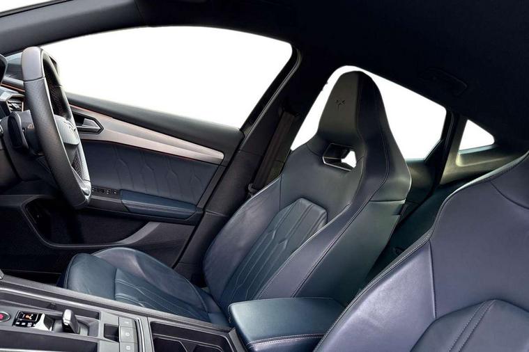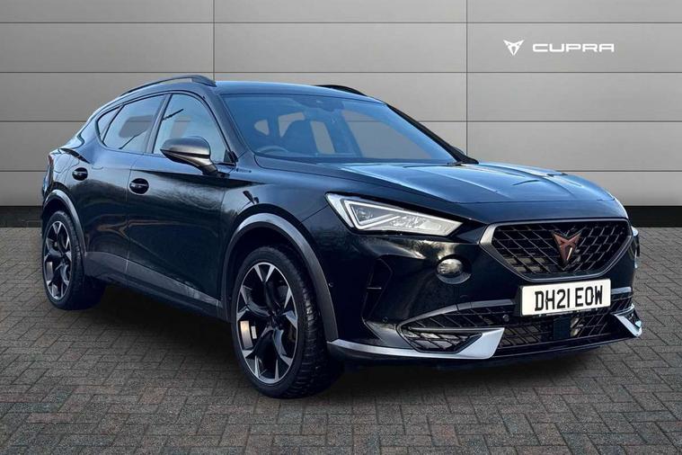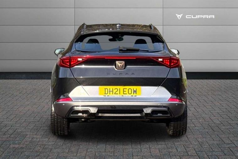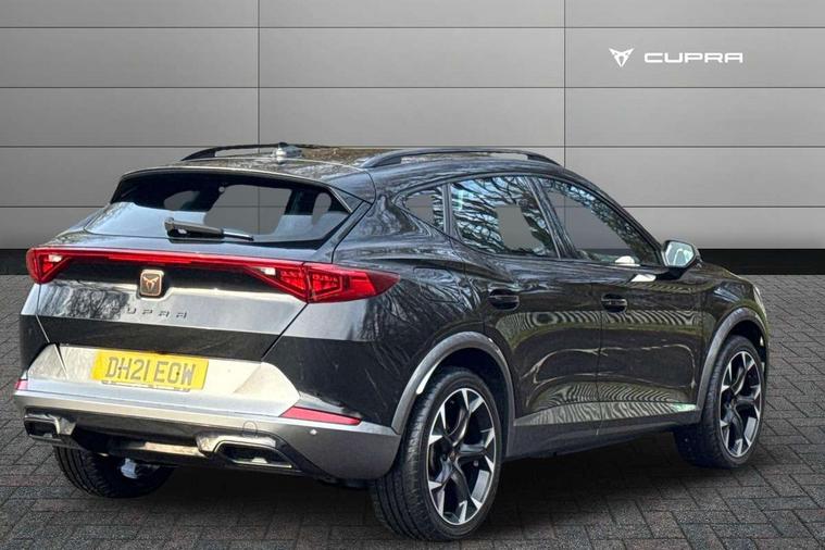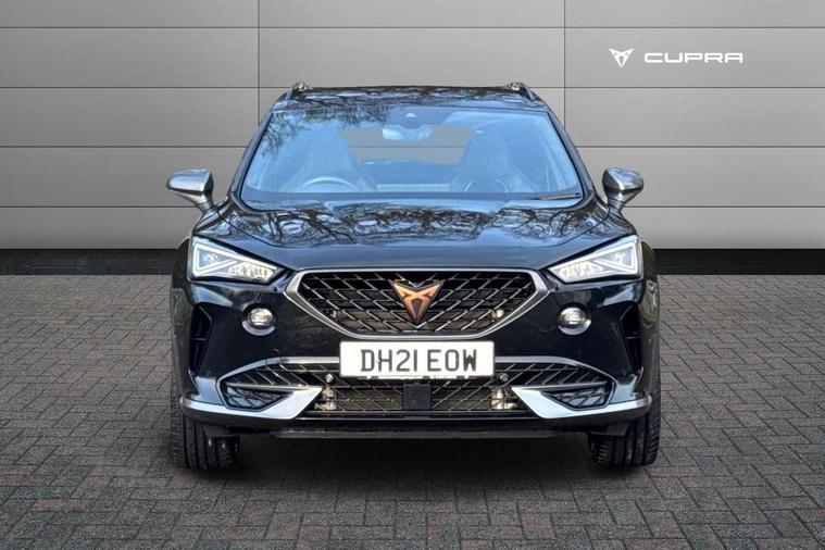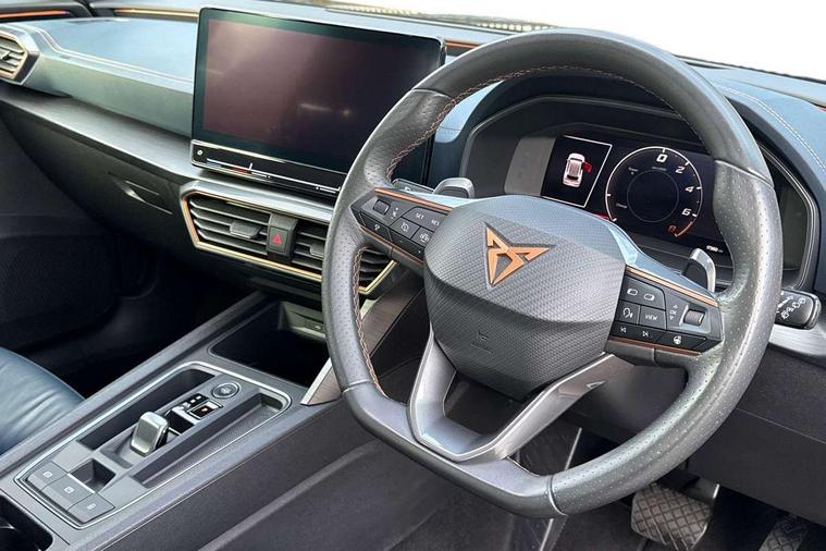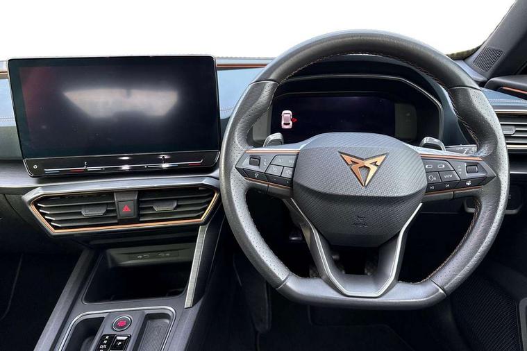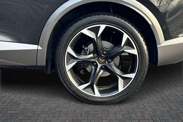 Digital cockpit and configurable dashboard, Driver alert system, Driving profile selection, Forward collision warning with automatic braking, Lane assist, Park assist (inc front/rear parking sensors), PAS, Predictive adaptive cruise control with speed limiter, Rear view camera, RPM, trip computer, outside temp gauge, instrument light brightness, low fuel warning light, lights on reminder, gearshift indicator, Service interval indicator, Start/stop system with regenerative braking, Wireless apple carplay, Wireless phone charger, 10 amp mode 2 charging cable, 16 amp mode 3 charging cable, Electronic locking differential and dynamic traction support, Standard suspension, 2 front and 2 rear USB type C sockets, 6 speakers, DAB radio, Auto dimming rear view mirror, Body colour door handles, Body coloured bumpers, Dark grey wing mirror, Daytime running light with automatic headlight control and coming home feature, Dynamic headlight range control, Electric front/rear windows, Electrically adjustable heated and folding door mirrors with memory function, Front fog lamps with cornering function, Gloss black roof rails and window surrounds, LED Headlights, LED Taillights with dynamic indicator, Rain sensing wipers, Rear diffuser with black simulated exhaust pipes, Rear wash/wipe, Tinted rear windows, Welcome lights, 12V socket, 2 front and 2 rear reading lights, 60/40 split rear bench seat with armrest and mechanical seat release, Dust/pollen filter, Front and rear head restraints, Front centre armrest, Height/reach adjust steering wheel, Illuminated interior front door sills, Illuminated sunvisor with mirror, Isofix, Leather multi function heated steering wheel with gear shift paddles, Three zone climate control with control panel in rear, Wraparound lighting, Genuine Nappa leather Pack - Cupra, Navigation system pack - Formentor, 3 point seatbelts on all rear seats, ABS, Brake control system - ESC and brake booster, Child proof door locks, Driver and front passenger airbags with front passenger airbag de-activation, Electronic parking brake, Front and rear disc brakes, Front side curtain airbags, Hill hold control, Seat belt reminder for front and rear seats, Tyre pressure monitoring system, Anti theft alarm system, Keyless entry and start system (KESSY), Locking wheel bolts, Copper and aluminium interior detailing, 19" 'Exclusive' machined sport matte black and silver alloy wheels, Tyre repair kit,