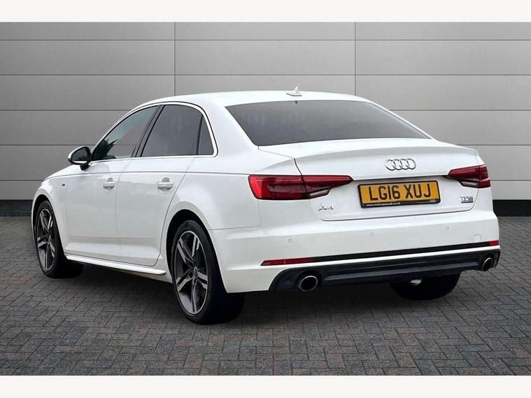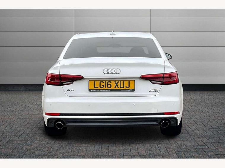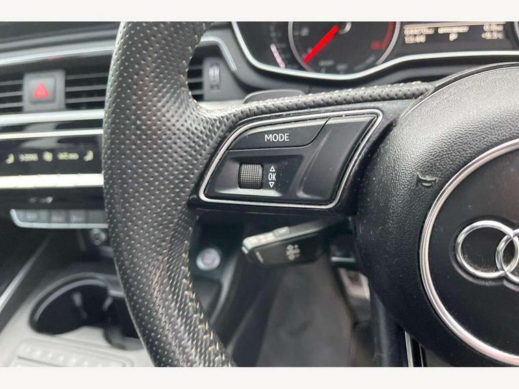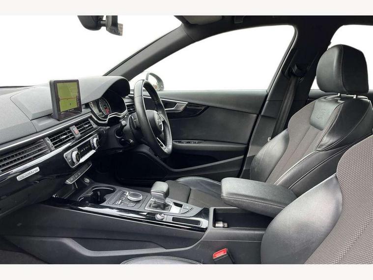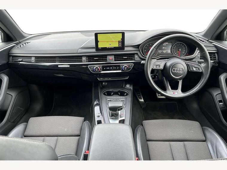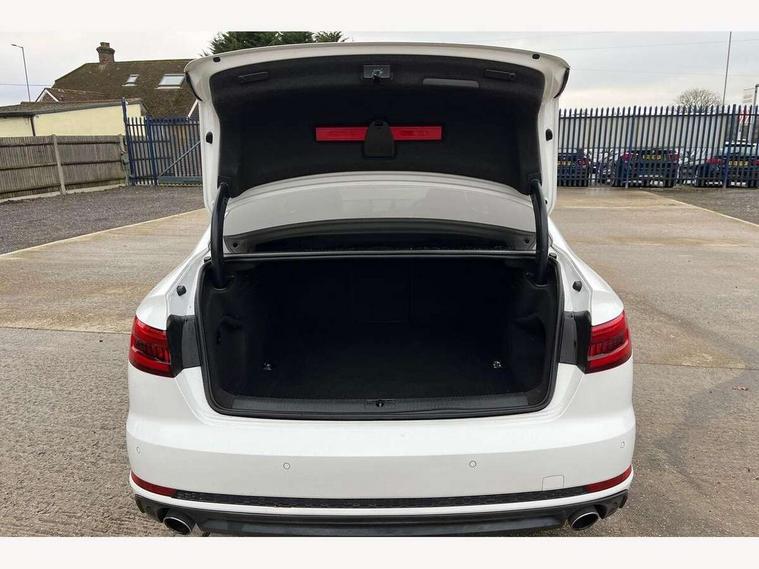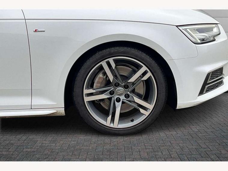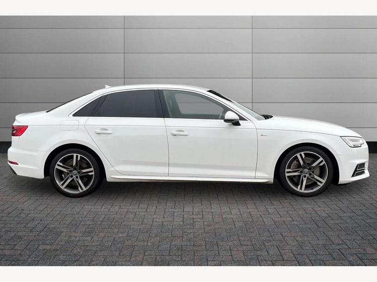 Audi drive select, Audi Pre sense collision avoidance, Auto boot lid opening, Electro-mechanical PAS, Service interval indicator, Stop/start button, Voice control system, 2 USB ports, Aux input, DAB digital radio module, MMI radio plus with CD player, Acoustic windscreen, Auto dimming rear view mirror, Automatic headlights + automatic windscreen wipers, Body colour bumpers, Body colour door mirrors, Chrome rolled exhaust, Electric adjustable heated door mirrors, Electric front windows, Electric rear windows, Headlight range control, LED daytime running lights, Rear diffuser in Twilight grey matt, Twilight grey matt radiator grille with chrome inlay, 3 zone climate control, 4 way electric lumbar support for driver and front passenger, Black cloth headlining, Front centre armrest with 12v socket, Front sport seats, Front/rear floor mats, Gearshift paddles, Illuminated door sill finishers, Isofix child seat preparation for front passenger/outer rear seats inc passenger airbag deactivation, Jack and tool kit, Perforated leather gearknob, Reach + rake adjustable steering column, Rear headrests, Split folding rear seats, Stainless steel pedals, Top tether anchor plate for isofix child seat, Exterior aluminium pack - A4, S line exterior styling pack - A4 Saloon, 3 point seatbelts on all rear seats, ABS/EBD, Adaptive driver and front passenger airbags, Electromechanical parking brake, ESP, First aid kit, Front head airbags, Front seatbelt pretensioners + load limiters, Front side airbags, Seatbelt warning, Traction control, Tyre pressure monitoring system, Warning triangle, Locking wheel bolts, Remote central locking, Thatcham category 1 alarm + immobiliser, Space saver spare wheel,