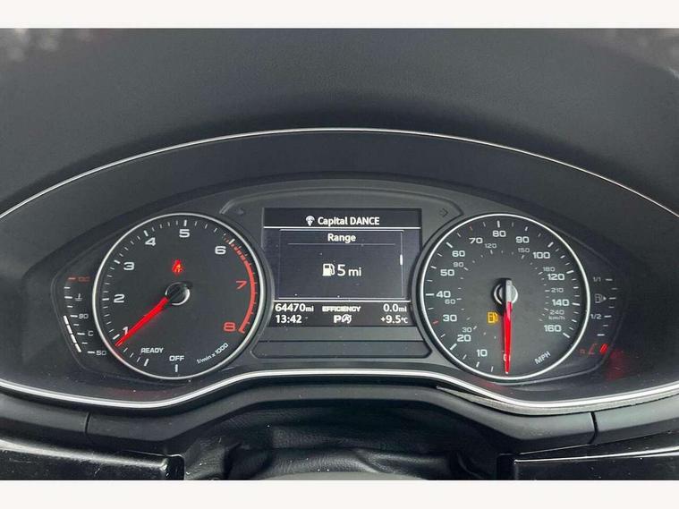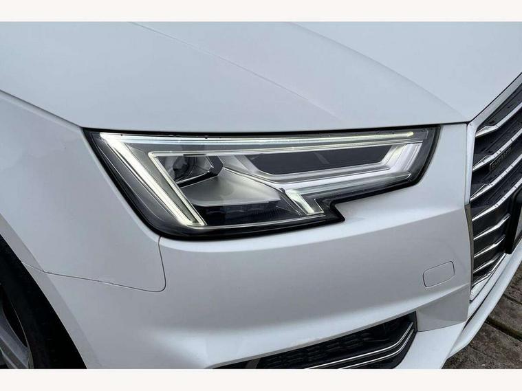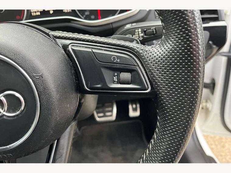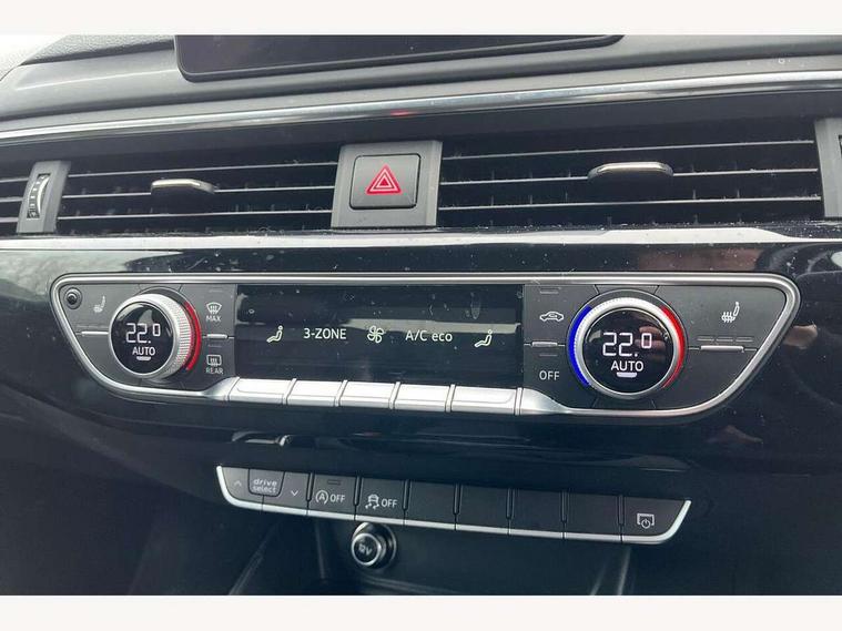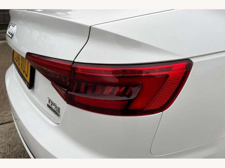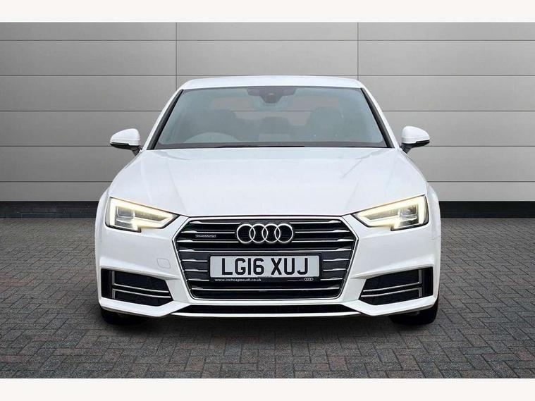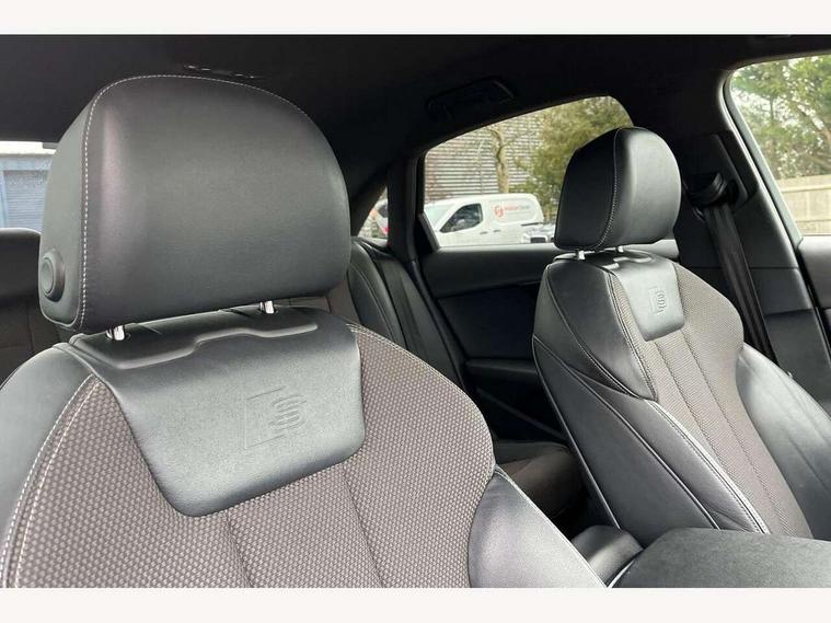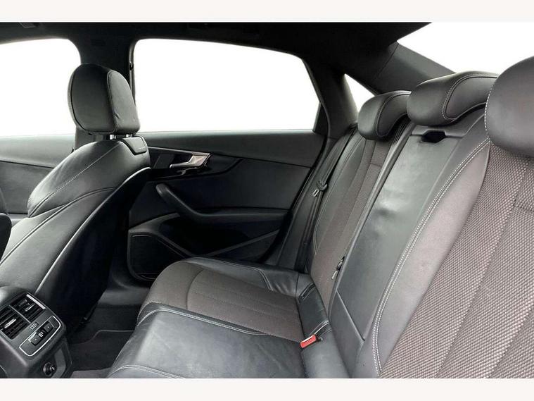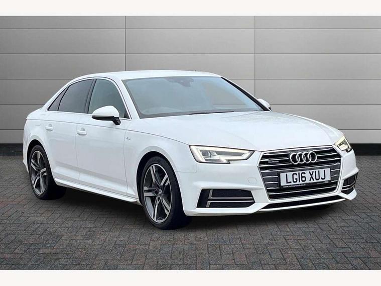 Audi drive select, Audi Pre sense collision avoidance, Auto boot lid opening, Electro-mechanical PAS, Service interval indicator, Stop/start button, Voice control system, 2 USB ports, Aux input, DAB digital radio module, MMI radio plus with CD player, Acoustic windscreen, Auto dimming rear view mirror, Automatic headlights + automatic windscreen wipers, Body colour bumpers, Body colour door mirrors, Chrome rolled exhaust, Electric adjustable heated door mirrors, Electric front windows, Electric rear windows, Headlight range control, LED daytime running lights, Rear diffuser in Twilight grey matt, Twilight grey matt radiator grille with chrome inlay, 3 zone climate control, 4 way electric lumbar support for driver and front passenger, Black cloth headlining, Front centre armrest with 12v socket, Front sport seats, Front/rear floor mats, Gearshift paddles, Illuminated door sill finishers, Isofix child seat preparation for front passenger/outer rear seats inc passenger airbag deactivation, Jack and tool kit, Perforated leather gearknob, Reach + rake adjustable steering column, Rear headrests, Split folding rear seats, Stainless steel pedals, Top tether anchor plate for isofix child seat, Exterior aluminium pack - A4, S line exterior styling pack - A4 Saloon, 3 point seatbelts on all rear seats, ABS/EBD, Adaptive driver and front passenger airbags, Electromechanical parking brake, ESP, First aid kit, Front head airbags, Front seatbelt pretensioners + load limiters, Front side airbags, Seatbelt warning, Traction control, Tyre pressure monitoring system, Warning triangle, Locking wheel bolts, Remote central locking, Thatcham category 1 alarm + immobiliser, Space saver spare wheel,