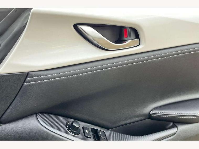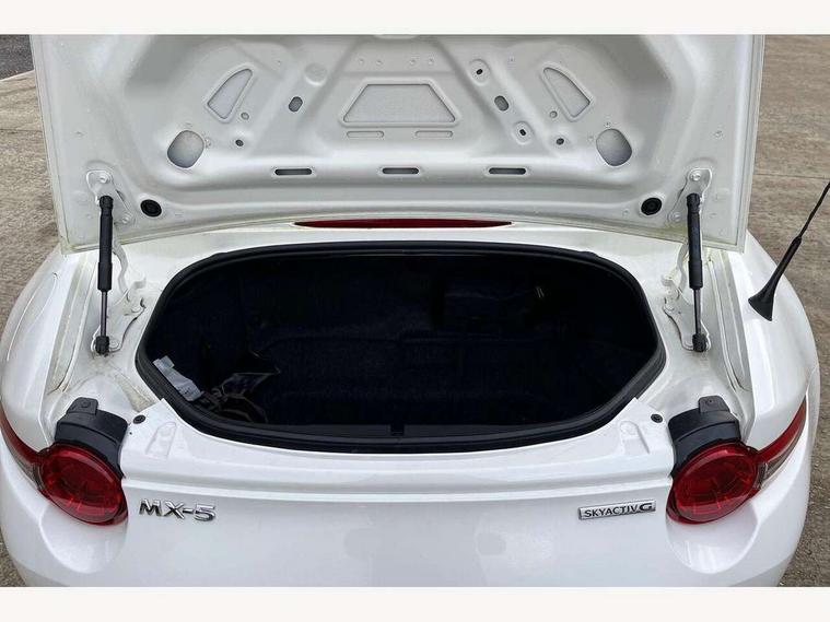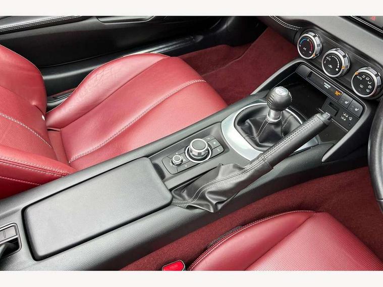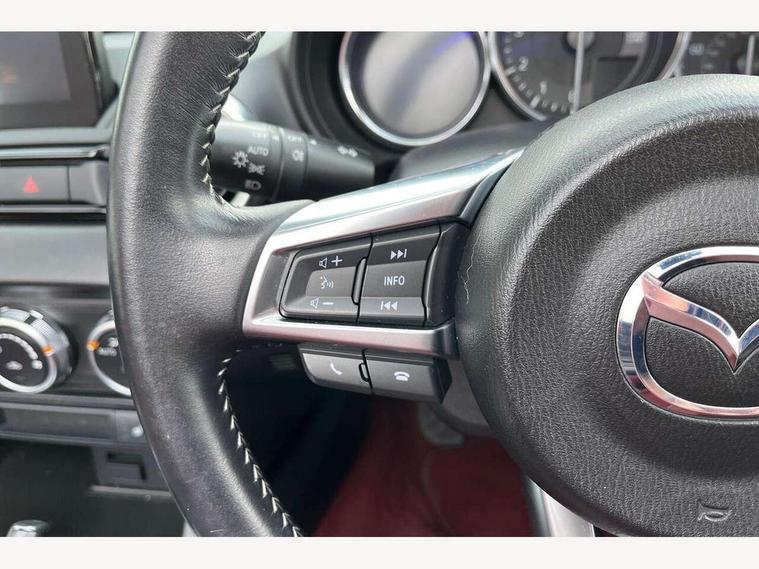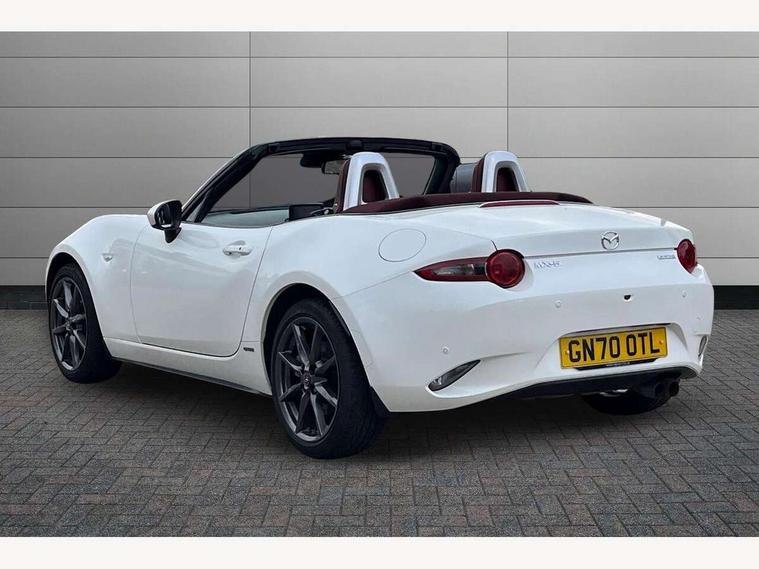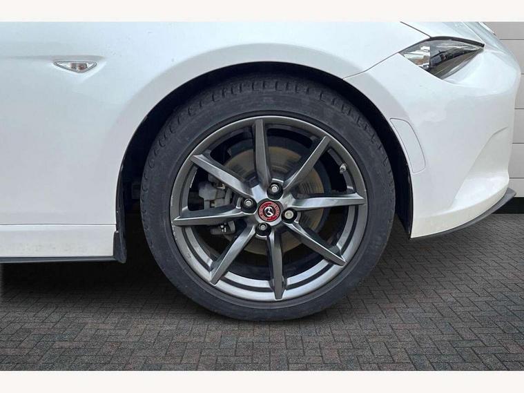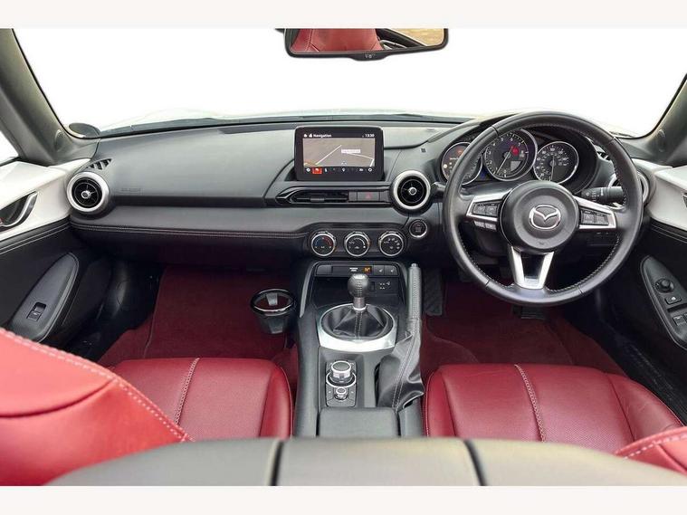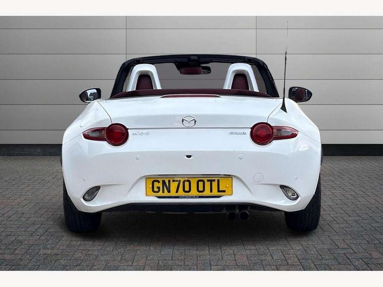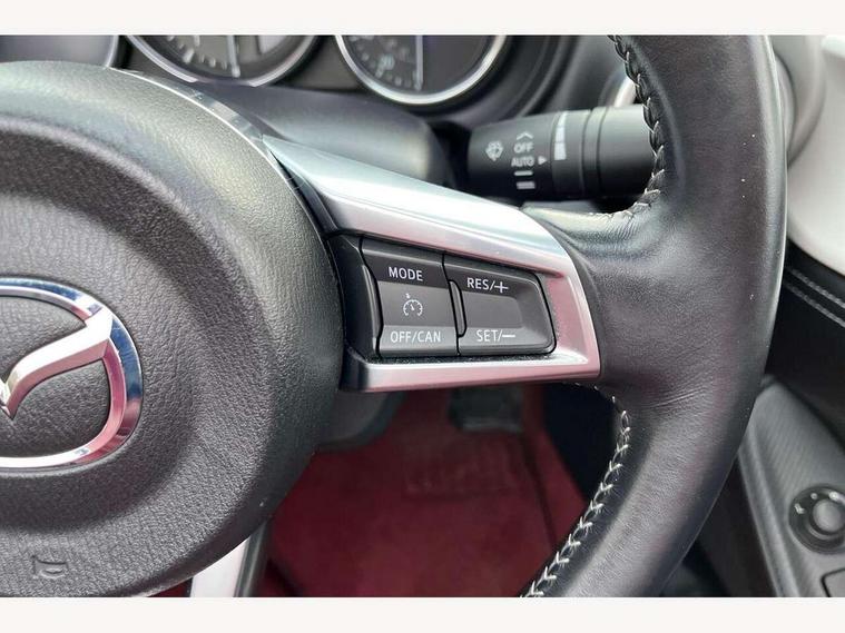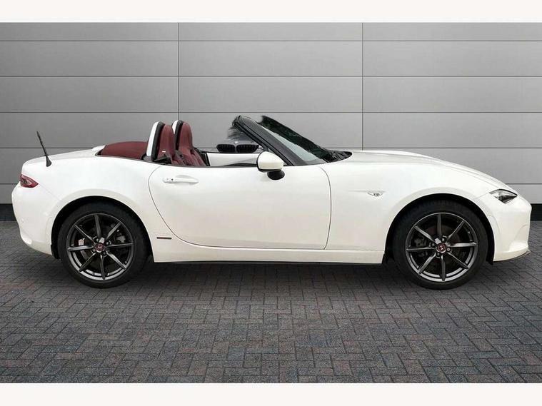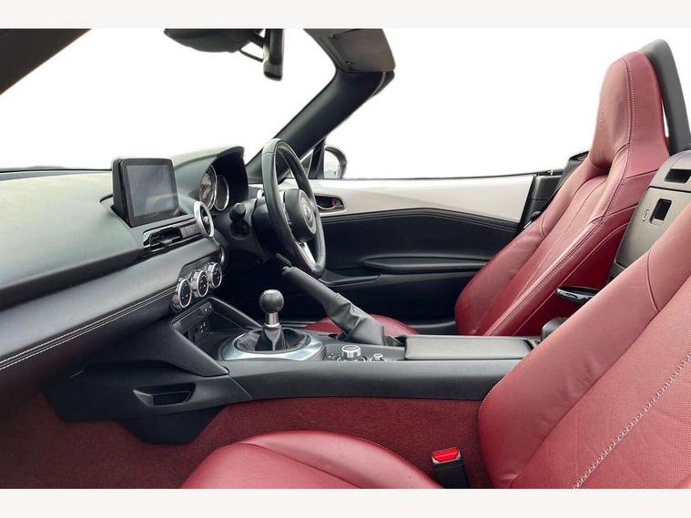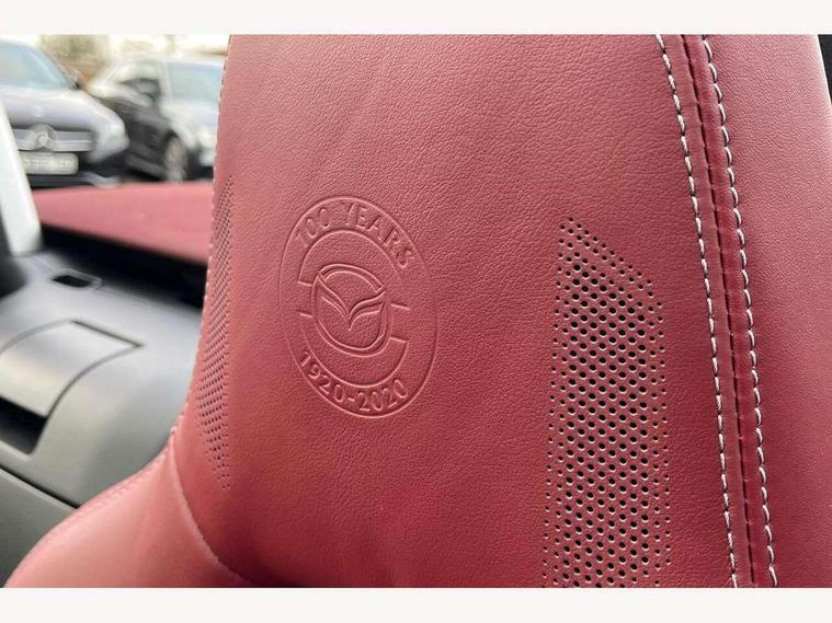 7" colour touch screen with Mazda connect infotainment, Aha and stitcher app, Analogue speedometer, Apple car play/Android Auto, Blind spot monitoring with rear cross traffic alert, Cruise control with manual speed adjustment and adjustable speed limiter, Driver alert system, Electronic odometer, Emergency stop signalling system, Engine start/stop button, Hands free phone preparation, Integrated bluetooth with audio transfer from Bluetooth devices, Lane departure warning system, Multi dot display tachometer and electric odometer, PAS, Rear parking sensor, Remote boot release, Reversing camera, Service indicator, Traffic sign recognition, Trip computer, Water temperature gauge, I-ELOOP, i-stop, Limited slip differential, Sports suspension featuring Bilstein dampers, 2 USB/aux input socket, Integrated Mazda navigation system with 3 years free European map updates, Multimedia Commander including separate volume dial, Premium Bose sound system with 9 speakers with 2 in each front headrest, AM/FM/DAB radio and single CD/MP3, Steering wheel mounted audio/bluetooth controls, 100 Years 1920-2020 exterior badging, Adaptive LED Headlights, Auto dimming rear view mirror, Automated High beam assist, Automatic headlamp levelling, Black scuff plates with stainless steel insert, Body colour bumpers, Body coloured electric/heated door mirrors, Coming/leaving home lighting function, Dual exhaust pipes, Dusk sensitive headlamps, Electric Front windows with one touch up/down facility, Exterior body colour co ordinated upper door panel trim with black vinyl and silver stitching, High mounted rear brake light with Black coloured cover, LED 3rd brake light, LED daytime running lights, Manually operated cherry premium cloth soft top with heated rear glass window, Pearlescent paint, Piano Black fashion bars, Rain sensing front wipers, Rear combination lamp, Rear fog lights, 100 Years logo embossed on the headrests, 12V socket, Black plastic wind blocker, Burgundy interior carpeting, Burgundy luxury floor mats with 100 Years badging, Centre console coin box, Chrome Air conditioning dials, Climate control air conditioning, Driver and front passenger seat manual slide, recline and tilt adjustment, Driver and front passenger sunvisors with covered vanity mirror and driver ticket holder, Front head restraints, Gear shift indicator, Heated front seats, in 3 heat levels, Interior courtesy light, Interior storage located behind seats, ISOFIX front passenger seat child seat compliance, Leather gear knob, Leather handbrake lever, Leather steering wheel, Lockable rear centre box with lid, Luggage compartment light, Perforated nappa leather upholstery, Sports seats, Strut brace, Tilt/height adjustable steering wheel, Two cupholders, 3 point ELR front seatbelts with pretensioners, ABS+Electronic Brake force Distribution, Collision avoidance braking, Deployable Hood System (DHS), Driver and front passenger airbags, Driver and passenger seatbelt reminder audible warning, DSTC-Dynamic Stability and Traction Control, Front side airbags, Hill hold assist, Manual passenger airbag deactivation function, Smart City Brake Support - SCBS, Tyre pressure monitor, Remote central locking with deadlocking and 100 Years branded Smart keyless entry key fob, Thatcham category 1 alarm + immobiliser, Black vinyl with silver stitching dashboard panel, Chrome meter rings, Chrome with white insert circular air vent surrounds, 17" Bright alloy wheels, Tyre puncture repair kit,