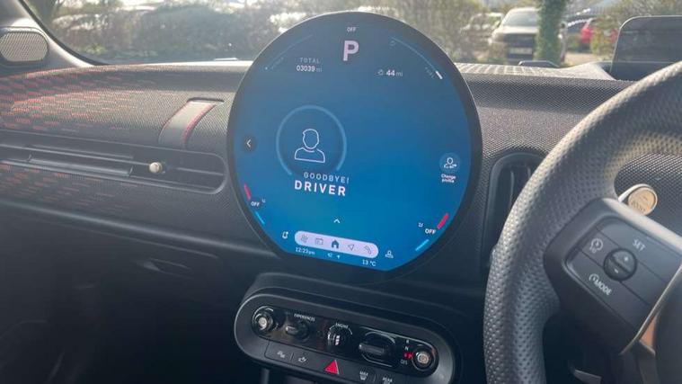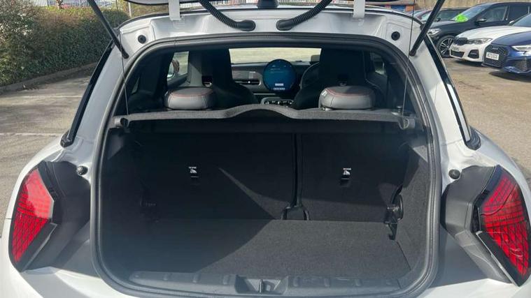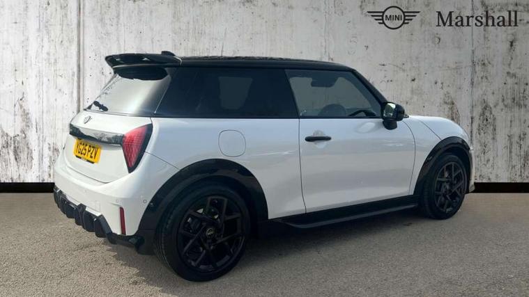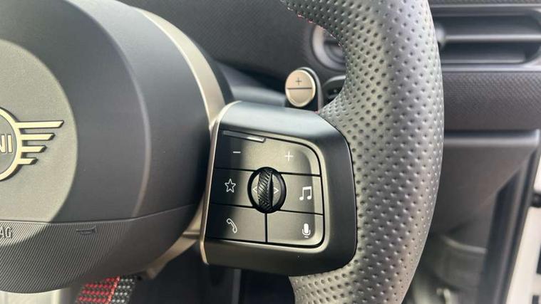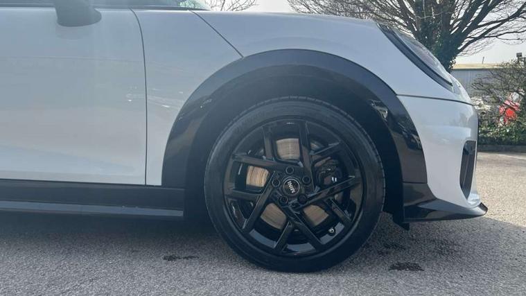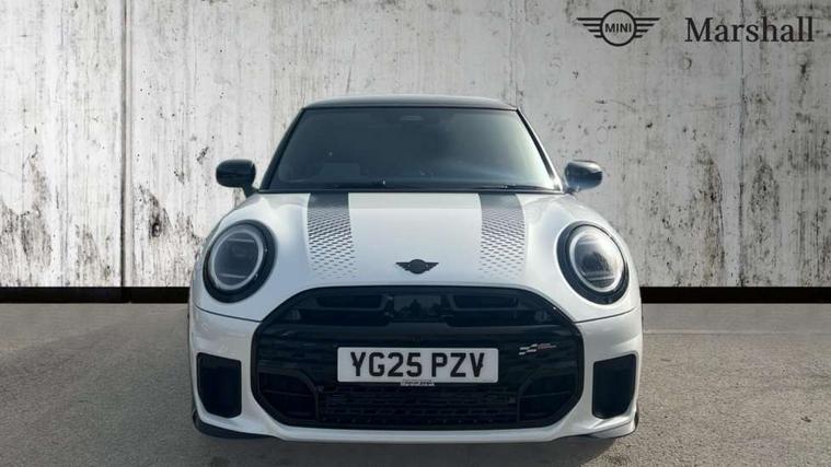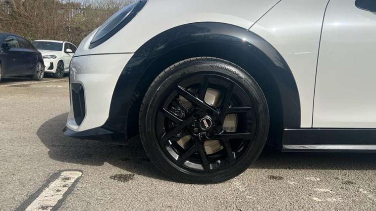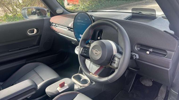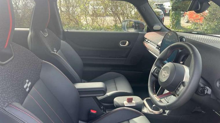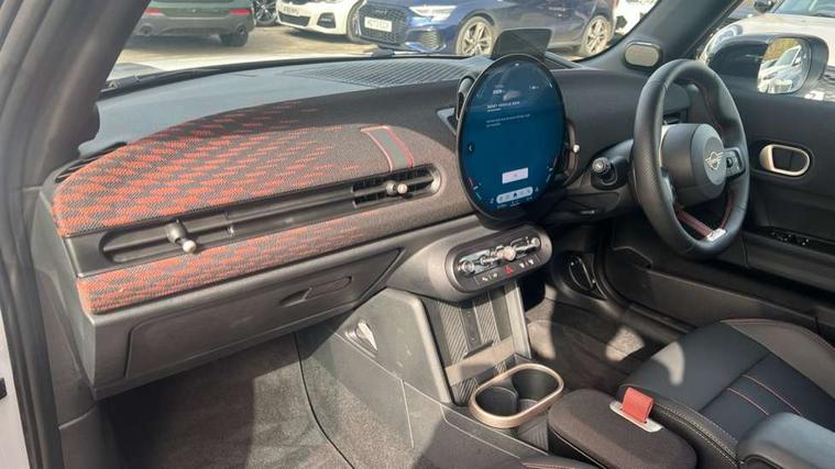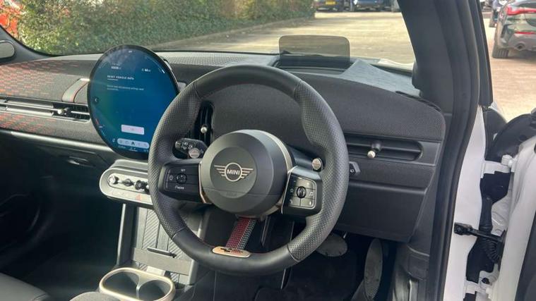 Central toggle bar, Circular OLED Screen, Compatible mobile phone bluetooth with audio streaming, Cruise control, Digital instrument cluster, Electro-mechanical speed dependant steering assistance, Emergency call service, MINI Experience Modes, Mini navigation system, On board computer, Service interval indicator, Tailgate, 7 speed steptronic transmission with double clutch, Adaptive suspension, DAB Digital radio, Personal eSim, Auto headlights, Electric adjustable heated door mirrors, Electric front windows, Front and rear apron, Heated rear window, Heated windscreen washer jets, High gloss black wheel arches, High gloss hexagonal patterned grille surround, JCW body kit, LED 3rd brake light, LED daytime running lights, LED Headlights, LED indicator lights, LED rear lights, Rain sensor window wipers, Rear fog lights, Rear roof spoiler with airblades, Rear window wiper, 2 seat bench in second row, 2 zone automatic air conditioning, 60/40 rear seat bench, Ambient lighting, Black lower band in high gloss, Cupholders, Dark headliner, Front and rear head restraints, Front compact armrest, Front floor mats, Heated steering wheel, Height adjustable passenger seat, Lidded storage box in Black/Red knit, Luggage compartment lighting, Partially perforated vescin steering wheel with red accent, black/red decorative strap, Single front passenger seat, Steering wheel paddle shift, Sunvisors with vanity mirrors, Vescin/Cord combination JCW upholstery includes dash knit in black with red accents, Driving assistant pack - Cooper Hatchback, Park assistant pack - Cooper Hatchback, 3 point seatbelts on all four seats, 6 Airbags - front, side, head and seat belt tensioners, Anti-lock braking system (ABS), Brake caliper in Black with JCW badge, DSC - Dynamic Stability Control, Electronic parking brake, Front and rear disc brakes, Front ISOFIX (iSize), Front passenger airbag deactivation, JCW Sport Brakes, Traction control, Tyre pressure monitoring system, Alarm, Immobiliser, Remote central locking, Black/Red decorative dash strap, Tyre repair kit,