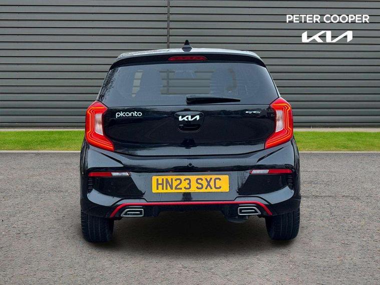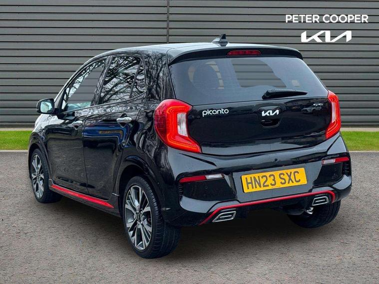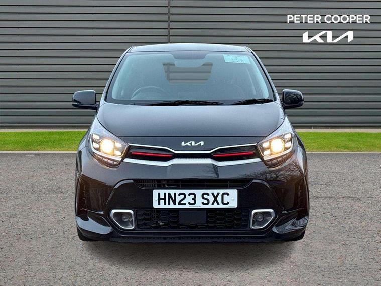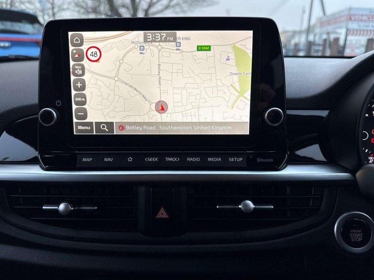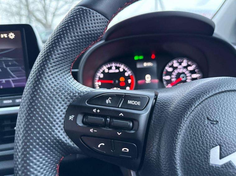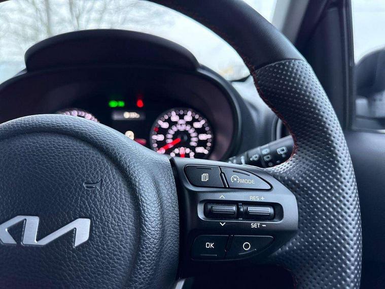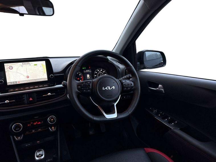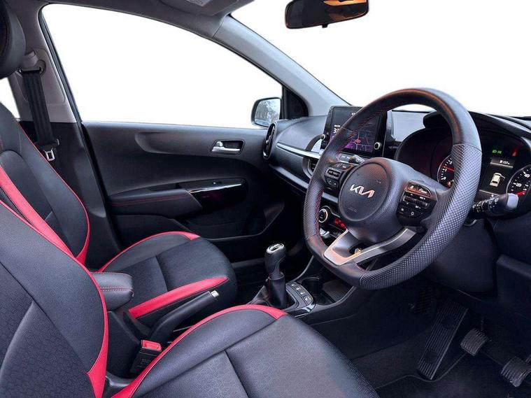 8" touch screen satellite naviagtion with RDS and DAB with telematics, Apple car play/Android Auto with voice control, Cruise control + speed limiter, Emergency call service, Emergency stop signalling system, External temperature gauge, Kia Connect (UVO), Motor driven power steering, Rear parking sensors, Reversing camera system with dynamic guidelines (Integrated into centre fascia screen), Tachometer, Trip computer, Wireless Smartphone charger, 6 speaker audio system, Bluetooth with music streaming, Steering wheel mounted controls, USB ports for connection of a media device, Automatic headlight control system, Bi-function projection headlights, Black beltline mouldings, Black grille with silver surround, Body colour B pillars, Body colour bumpers, Body colour side sill mouldings, Body coloured mirrors and chrome exterior handles, Day/night rear view mirror, Electric adjustable/heated/folding door mirrors with LED indicators lights, Front and rear electric windows with drivers's auto up/down function, Front fog lights, Headlamp levelling, Heated rear window, High mount brake light, LED daytime running lights, LED rear fog lights, Privacy glass - Rear windows and tailgate, Rain sensor, Rear side wing doors, Rear wash/wipe, Speed variable front wipers, Sports front and rear bumpers with gloss black skid plates twin exhaust, Tinted glass, Visible VIN plate, Welcome and follow-me home light functionality, 1 x rear coat hook, 12V power point front, 2 seat bench in 2nd row, 3 x passenger assist grips, 60/40 split/folding 2nd row of seats, All round height adjustable headrests, Automatic air conditioning, Black and red accents front door armrest, Centre Console with Storage Box and Sliding Armrest, Cupholders in centre console, D-cut steering wheel with red stitching, Driver and front passenger sunvisors with driver's side illuminated vanity mirrors, Driver seat height adjust, Faux leather upholstery, Front cabin lights, Glovebox, Heated front seats, Heated steering wheel, High gloss lower centre fascia trim, door armrest and air vents, ISOFIX Child seat top tethers and anchor fixings, Leather trimmed steering wheel and gearshift, Luggage area light, Luggage area parcel shelf, Passenger front seatback pockets, Satin chrome interior door handles, Single front passenger seat, Slide/reclining front seats, Tilt adjustable steering wheel, Advanced Driver Assistance Pack - Picanto, 2 x 3-point rear seatbelts, ABS/EBD, Automatic unlocking of doors in case of impact, Dual front airbags, ESC + BAS + VSM + HAC, Front passenger airbag cut-off switch, Front seatbelt height adjusters, Front seatbelt pretensioners + load limiters, Hill hold control, Knee airbags, Rear child proof door locks, Seatbelt warning, Side impact protection, Torque vectoring brake based and straight line stability (SLS), Traction control, Twin curtain airbags, Twin front side airbags, Tyre pressure monitoring system, Anti theft alarm, Engine immobiliser, Locking wheel nuts, Smart key with engine start/stop button, 16" alloy GT-Line wheels, Tyre mobility kit,