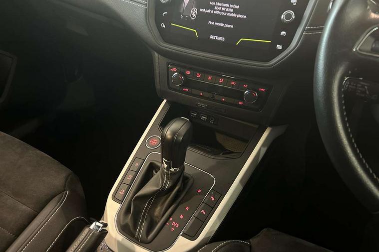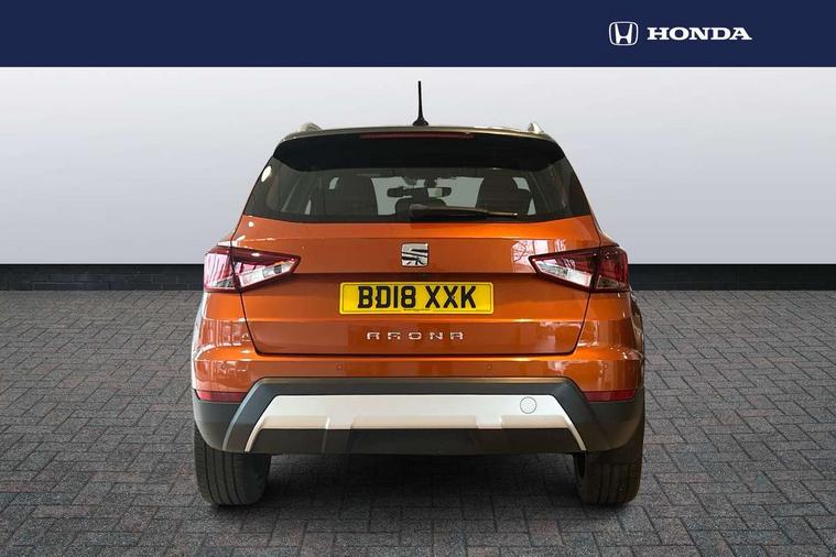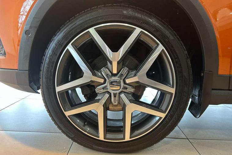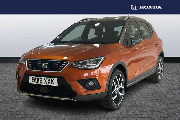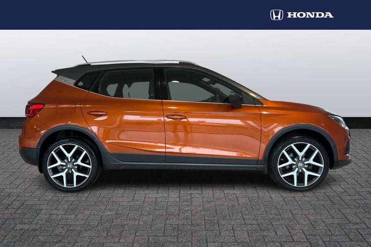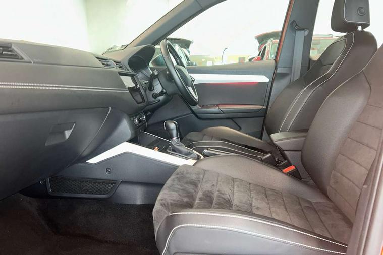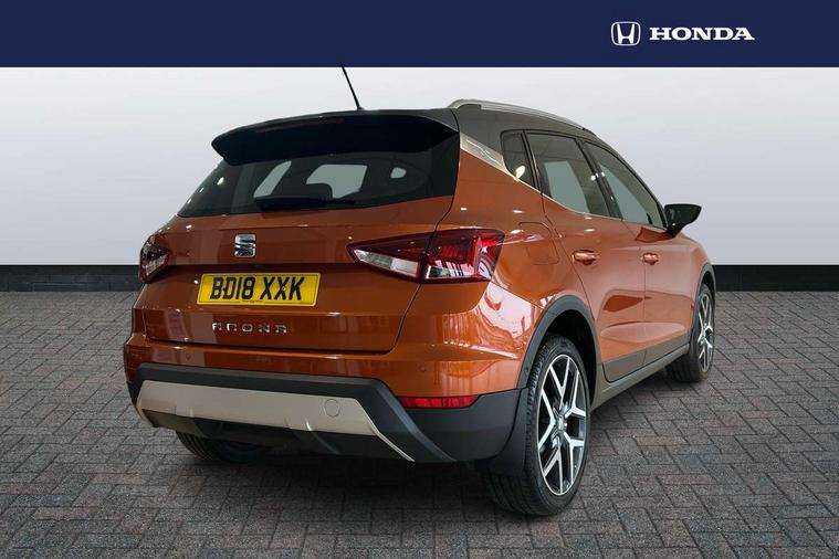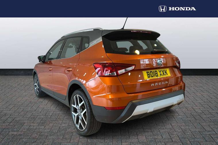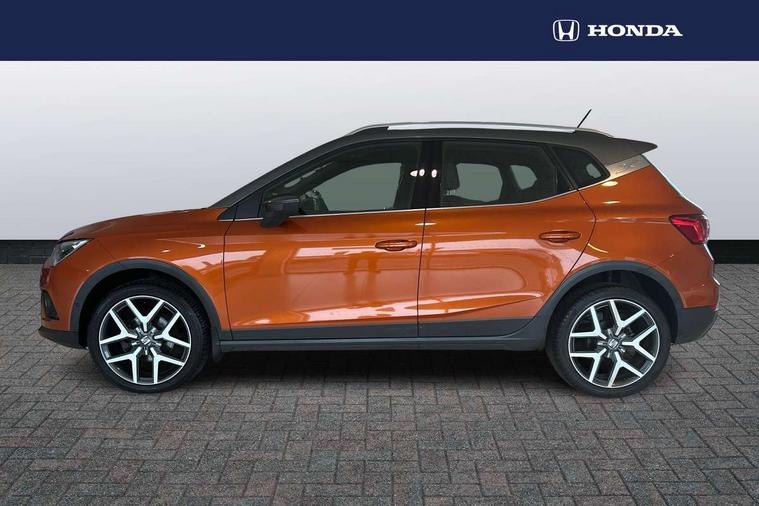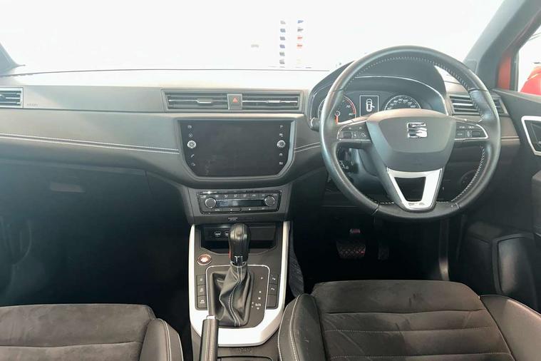 'Lights On' Reminder warning buzzer, Adaptive cruise control, Blind spot monitor, Electric speed sensitive power steering, Front assistant collision mitigation, Front parking sensor, Outside temperature display, Park assist system, Rear cross traffic alert, Rear parking sensor, Rear view camera, SEAT Drive profile, Trip computer, Comfort suspension, 6 speakers, Beats audio system, Bluetooth interface for hands free and audio streaming, DAB Digital radio, Steering wheel mounted audio controls, Auto dimming interior mirror, Automatic activation of hazard warning lights, Automatic headlights, Body coloured bumpers, Body coloured door handle inserts, Chrome grille bars, Chrome grille surround, Chrome roof rails, Chrome window surround, Coming/leaving home lighting function, Electric front/rear windows with one touch/auto up/down, Electrically adjustable and heated door mirrors, Electrically folding wing mirrors, Front fog lights with static cornering function, Full LED headlights, LED daytime running lights, LED tail lights, Rain sensor windscreen wipers, Rear window wash/wipe, Roof colour door mirrors, 2 cupholders, 3 rear height adjustable headrests, 60/40 split folding rear seat, Ambient interior lighting, Cloth upholstery, Double boot floor, Driver and passenger sunvisors, Driver/front passenger seat height adjustment, Dual zone climate control, Dust/pollen filter, Footwell ambient lighting, Front courtesy lights, Front reading light, Front seat and rear pockets, Height/reach adjustable steering column, Illuminated boot, Isofix attachments on outer rear seats, Leather handbrake, Leather steering wheel and gear knob, Multi-colour ambient interior lighting, Connectivity pack plus - Arona, Storage pack - Arona, Winter pack - Arona, 3 point seatbelts on all rear seats, ABS+EBA, Child locks on rear doors, Driver/Front Passenger airbags, Electronic stability control, Front and rear seatbelt reminder, Front side/curtain airbags, Height adjustable active front headrests, Hill hold control + Tyre Pressure monitor, Multi-Collision braking, Passenger airbag deactivate switch, Tiredness recognition system, Traction control, 2 folding remote keys with window open/close function, Alarm with interior monitoring, Immobiliser, Keyless entry and start, Locking wheel bolts, Remote central locking + deadlocks, Interior chrome line trim, 18" Performance alloy wheels,