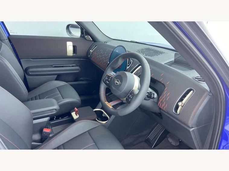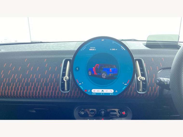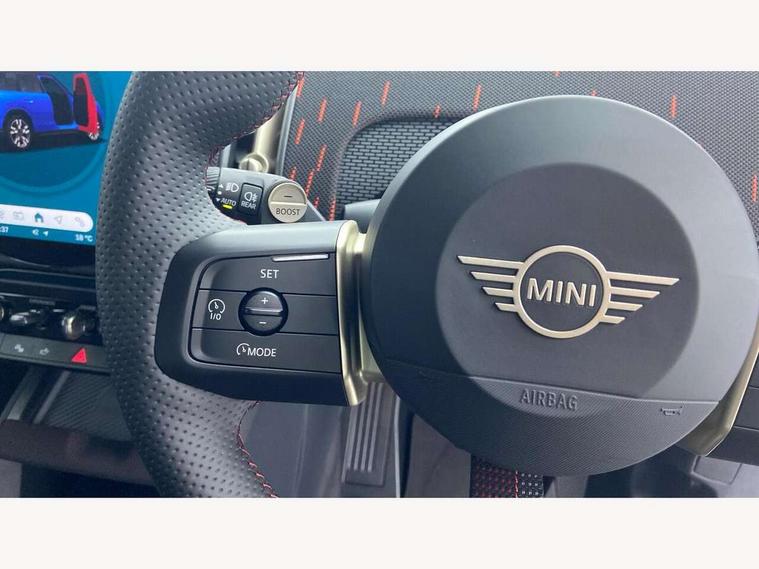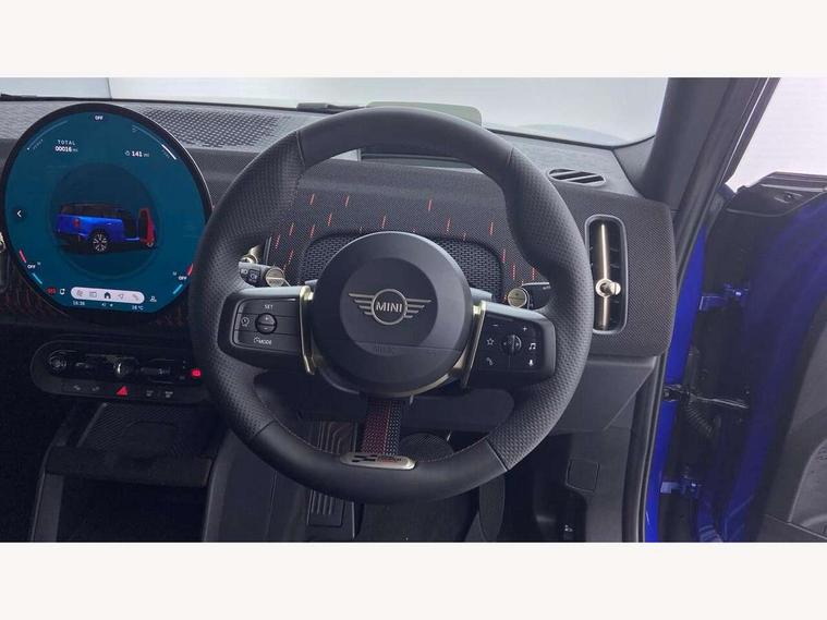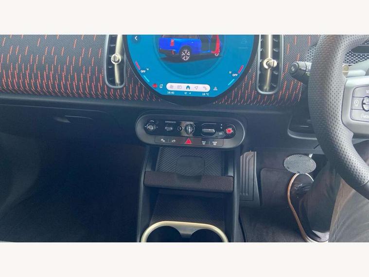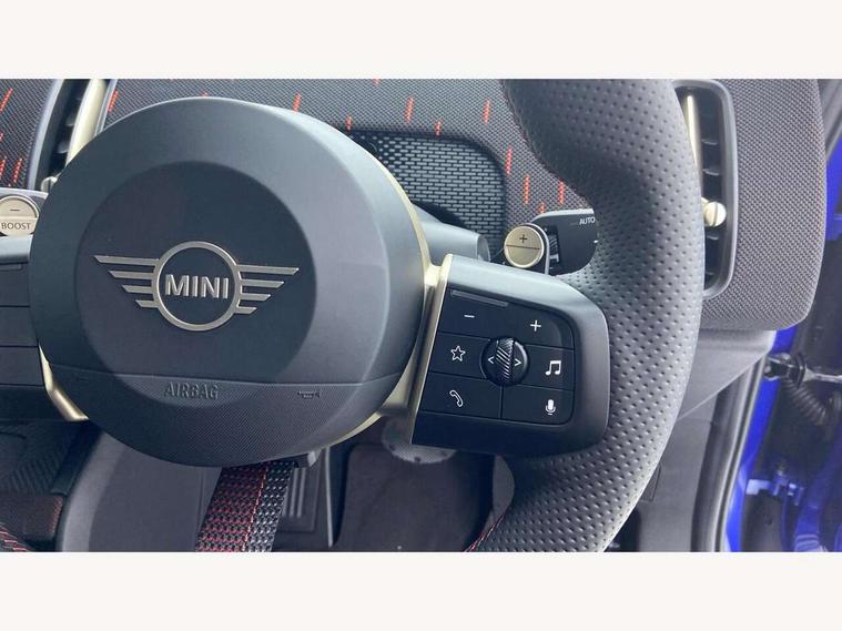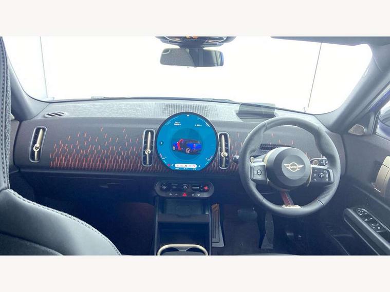 Bluetooth connection, Circular OLED Screen, Compatible mobile phone bluetooth with audio streaming, Cruise Control (DCC), Digital dashboard display, Driving assistant, Driving Assistant Plus Preparation, E-call, Electro-mechanical speed dependant steering assistance, MINI Experience Modes, MINI Head up display, Mini navigation system, MINI TeleServices, Parking assistant in camera and ultrasound based assistance system, rear view camera, parking aid and distance control, Adaptive suspension, Double clutch sports transmission, Larger capacity fuel tank, 6 speakers, DAB Digital radio, Personal eSim, Auto tailgate, Electric adjustable heated door mirrors, Front and rear apron, Front and rear electric windows, Heated rear window, High beam assistant, High gloss hexagonal patterned grille surround, Interior rear-view mirror with automatic anti-dazzle function, LED daytime running lights, LED headlights with extended contents including Adaptable light signatures, LED rear lights, LED third brake light, Rain sensor with auto headlights, Rear roof spoiler with airblades, Rear side wing doors, Rear window wiper, Roof rails, 3 Seat sliding rear bench in 2nd row, Anthracite headliner, Auto air conditioning, Driver and front passenger seat heating, Floor mats, Front armrest, Front headrests, Heated steering wheel, Height and length steering column adjustment, JCW Front sports seats, Lidded storage box in Black/Red knit, Luggage compartment separating net, Perforated Vescin steering wheel, Rear headrests, Seat adjustment for rear seats, Single front passenger seat, Sunvisors with vanity mirrors, Vescin/Cloth upholstery, Wireless charging tray, Interior and exterior mirror package - Mini Countryman, 3x3 point rear seat belts, 6 Airbags - front, side, head and seat belt tensioners, ABS, Brake calipers in Black with JCW badge, DSC - Dynamic Stability Control, Electronic handbrake, Electronic Stability Programme (ESP), Front ISOFIX (iSize), Hill descent control, Hill hold assist, Hill start assist, JCW Sport Brakes, Manual rear child locks, Traction control, Tyre pressure monitoring system, Warning triangle, Alarm system with tilt sensor, monitoring doors, bonnet interior and tailgate, Auto drive away locking, Comfort access system, Deadlocking function, Electronic vehicle immobiliser, Locking wheel bolts, Remote control locking, Start/stop toggle with keyless go, JCW Black/Red dashboard knit, MINI Mobility Kit,