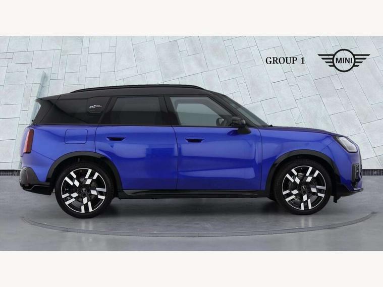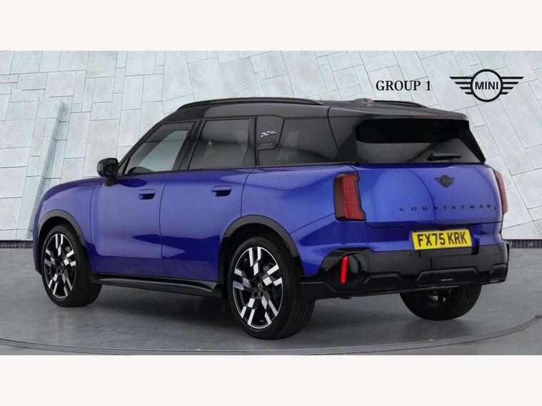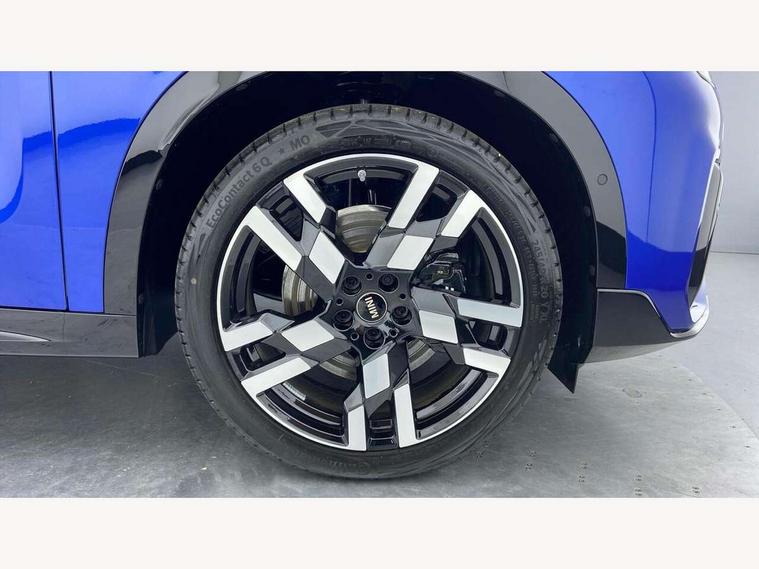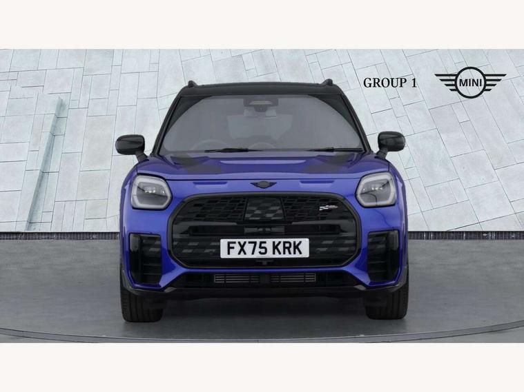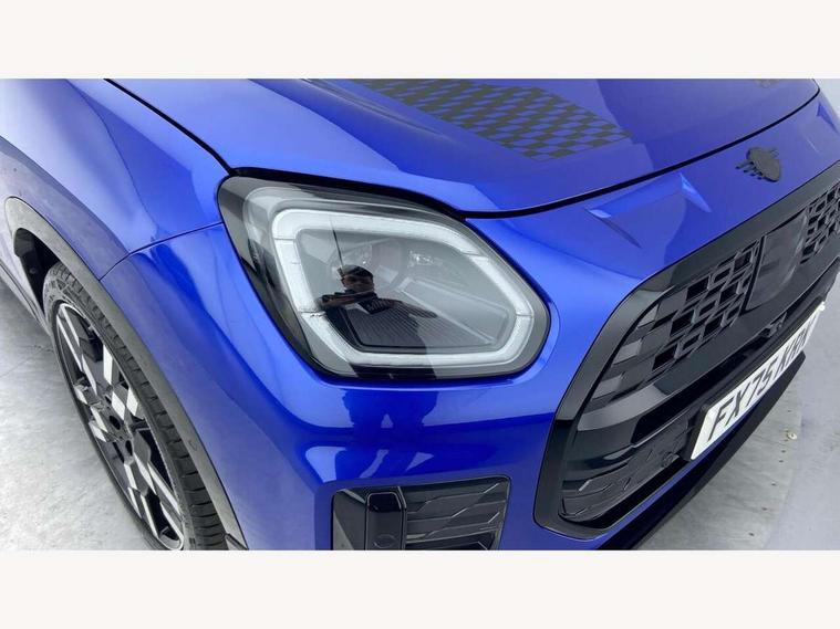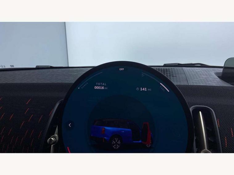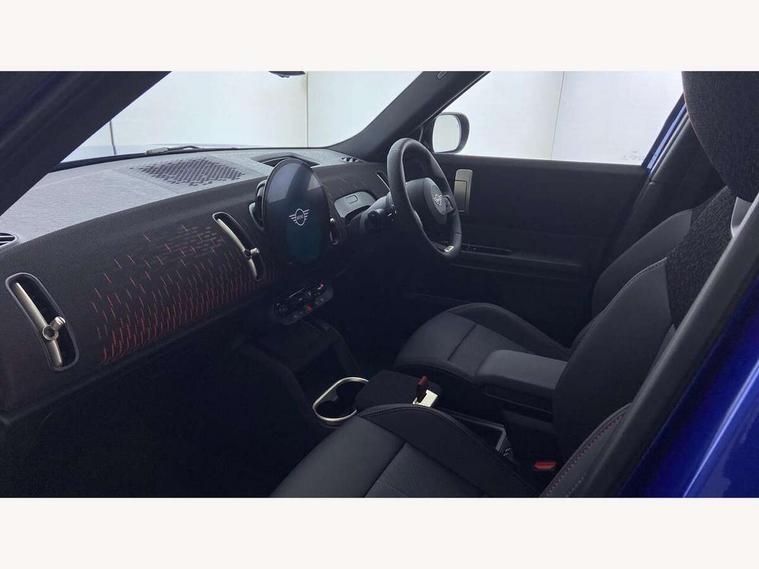 Bluetooth connection, Circular OLED Screen, Compatible mobile phone bluetooth with audio streaming, Cruise Control (DCC), Digital dashboard display, Driving assistant, Driving Assistant Plus Preparation, E-call, Electro-mechanical speed dependant steering assistance, MINI Experience Modes, MINI Head up display, Mini navigation system, MINI TeleServices, Parking assistant in camera and ultrasound based assistance system, rear view camera, parking aid and distance control, Adaptive suspension, Double clutch sports transmission, Larger capacity fuel tank, 6 speakers, DAB Digital radio, Personal eSim, Auto tailgate, Electric adjustable heated door mirrors, Front and rear apron, Front and rear electric windows, Heated rear window, High beam assistant, High gloss hexagonal patterned grille surround, Interior rear-view mirror with automatic anti-dazzle function, LED daytime running lights, LED headlights with extended contents including Adaptable light signatures, LED rear lights, LED third brake light, Rain sensor with auto headlights, Rear roof spoiler with airblades, Rear side wing doors, Rear window wiper, Roof rails, 3 Seat sliding rear bench in 2nd row, Anthracite headliner, Auto air conditioning, Driver and front passenger seat heating, Floor mats, Front armrest, Front headrests, Heated steering wheel, Height and length steering column adjustment, JCW Front sports seats, Lidded storage box in Black/Red knit, Luggage compartment separating net, Perforated Vescin steering wheel, Rear headrests, Seat adjustment for rear seats, Single front passenger seat, Sunvisors with vanity mirrors, Vescin/Cloth upholstery, Wireless charging tray, Interior and exterior mirror package - Mini Countryman, 3x3 point rear seat belts, 6 Airbags - front, side, head and seat belt tensioners, ABS, Brake calipers in Black with JCW badge, DSC - Dynamic Stability Control, Electronic handbrake, Electronic Stability Programme (ESP), Front ISOFIX (iSize), Hill descent control, Hill hold assist, Hill start assist, JCW Sport Brakes, Manual rear child locks, Traction control, Tyre pressure monitoring system, Warning triangle, Alarm system with tilt sensor, monitoring doors, bonnet interior and tailgate, Auto drive away locking, Comfort access system, Deadlocking function, Electronic vehicle immobiliser, Locking wheel bolts, Remote control locking, Start/stop toggle with keyless go, JCW Black/Red dashboard knit, MINI Mobility Kit,