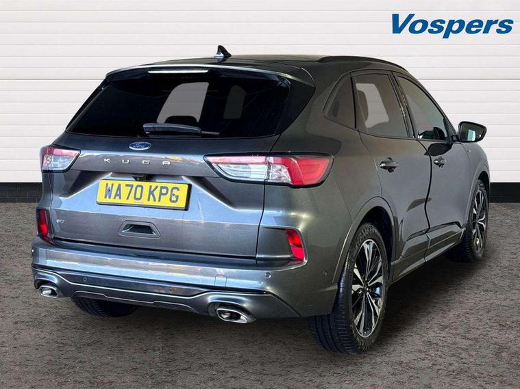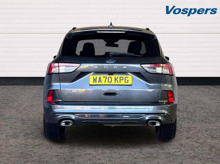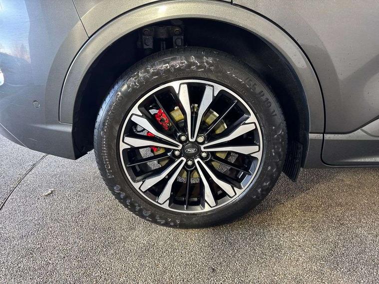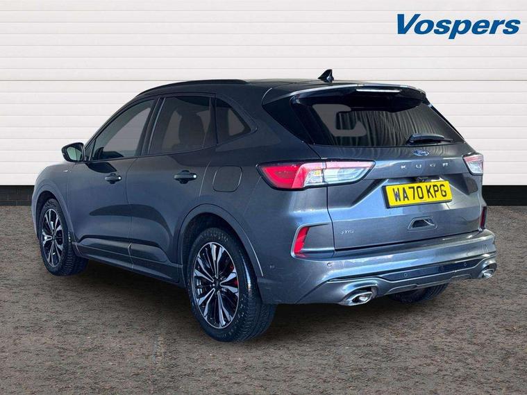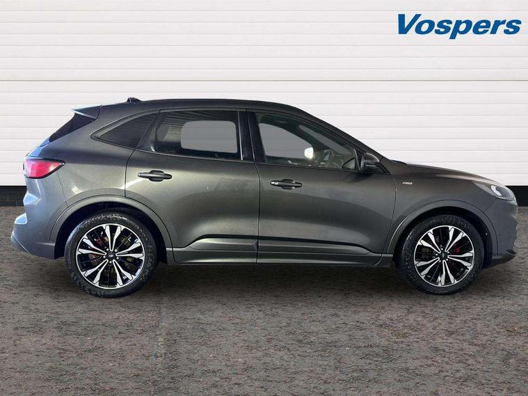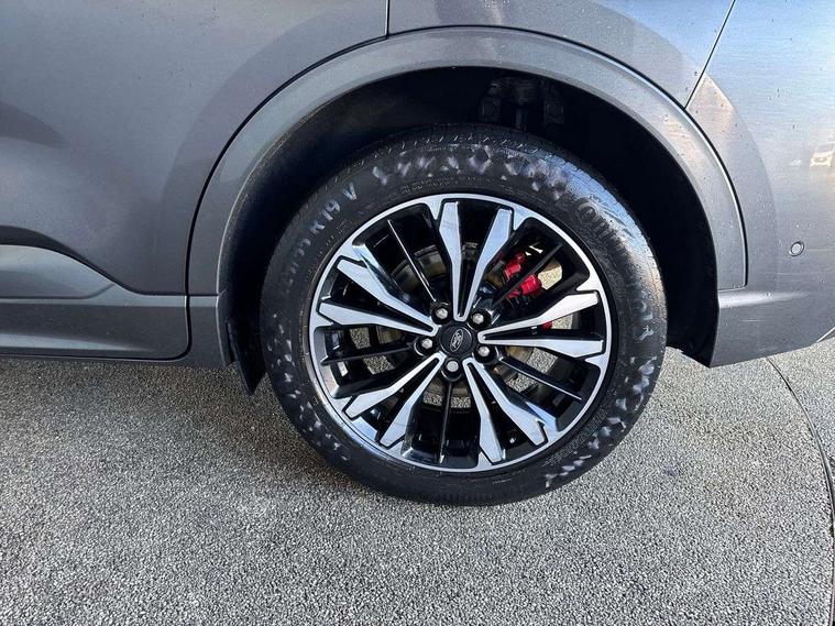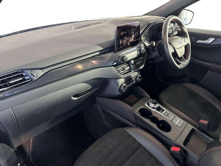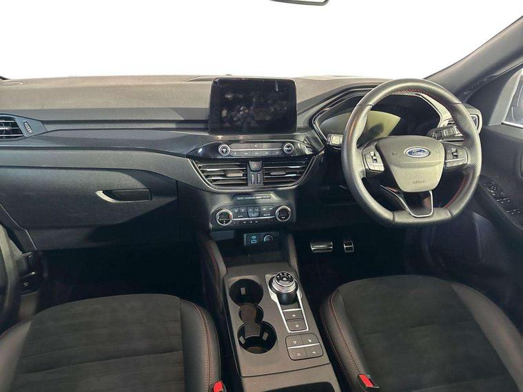 Active park assist, Adaptive cruise control with Stop and Go, BLIS (Blind spot information system), Driver impairment monitor, Eco coaching, Ford easy fuel, Front and rear parking sensors, Front and rear view camera, Hands free power tailgate, Head up Display, Intelligent speed assist, Lane keeping aid with lane departure warning, Mobile phone wireless charging pad, Power assist steering, Selectable drive modes, SYNC 3 with navigation, DAB audio, Auto dimming rear view mirror, Auto headlamps with high and low beam, Auto wipers, Black roof rails, Door edge guards, Electrically operated front and rear windows, Front LED fog lights with cornering function, Full LED quad projector headlamps with glare free, Large rear spoiler, LED daytime running lights, LED rear lights, Power folding heated door mirrors with puddle lights, Power front/rear windows with global close, Power opening panoramic roof, Privacy glass, Quickclear heated windscreen, ST Line badges in exterior and interior, ST Line body styling kit with unique front and rear fascia and bumper, rear painted diffuser, front painted skid plates, dark mesh upper grille, ST Line front scuff plates, Twin exhausts, 10 way power adjustable drivers seat, 2nd row sliding seats, 8 way manual passenger seat including lumbar support and height adjust, Alloy pedals, Ambient lighting, Centre console with electronic parking brake, Dark headlining and pillars, Dual electronic automatic temperature control, Flat bottomed leather steering wheel in sensico with red stitching, Front and rear head restraints, Heated passenger and driver seats, Partial leather manual track seat, Rear charging point, Sensico partial premium leather upholstery, Sports seats, ST Line front and rear floor mats, Steering wheel mounted paddle shift, B&O with large instrument cluster pack - Kuga, 3x3 point rear seatbelts, Airbags - front driver/passenger, front and rear curtain, Drivers knee airbag, Electronic stability control (ESC) and ABS, Ford MyKey Gen 2 safety system, Hill launch assist, Post collision braking, Powered child proof rear door locks, Pre collision assist with autonomous emergency braking, Red brake calipers, Tyre pressure monitoring system, Engine immobiliser, Keyless entry, Keyless start with 'Ford Power' starter button, Locking wheel nuts, Remote powered central double locking doors, Thatcham category 1 alarm,