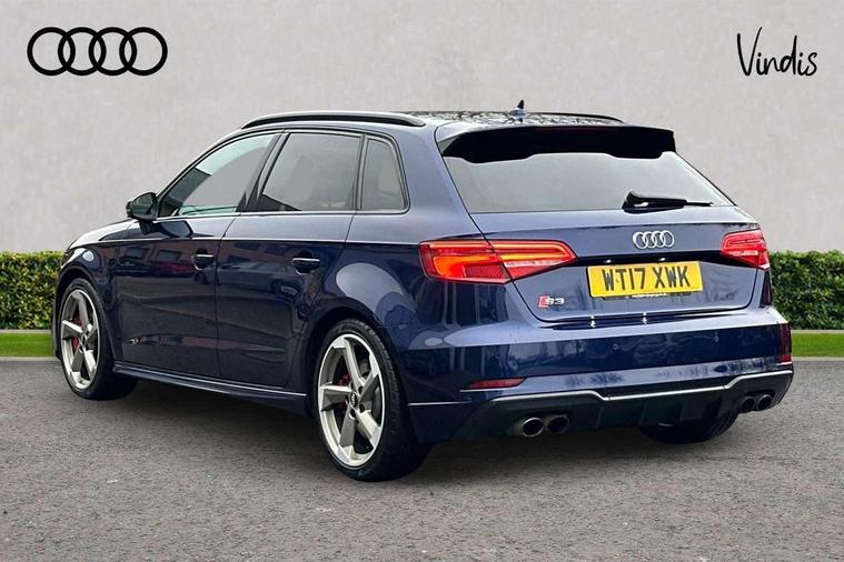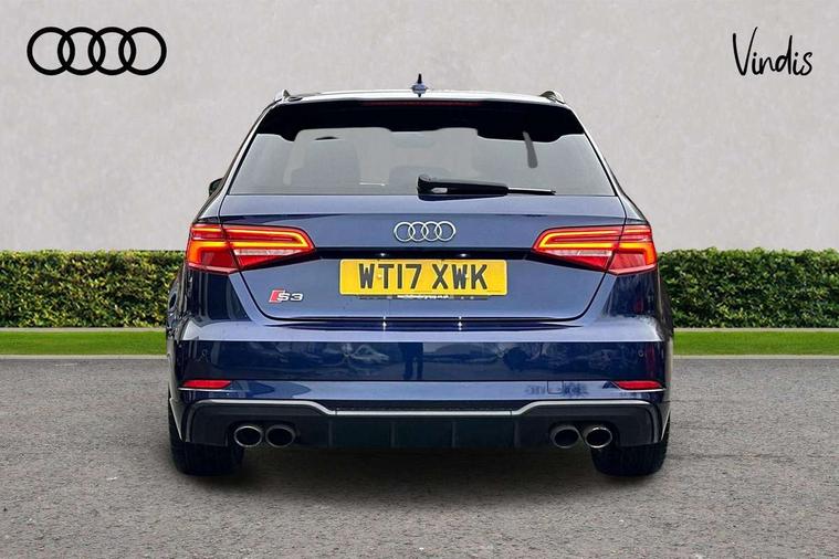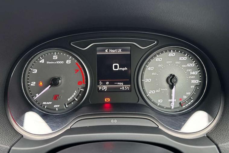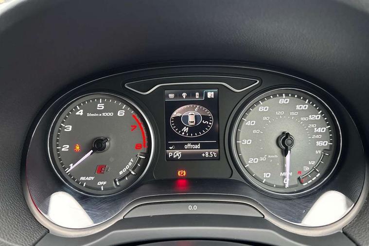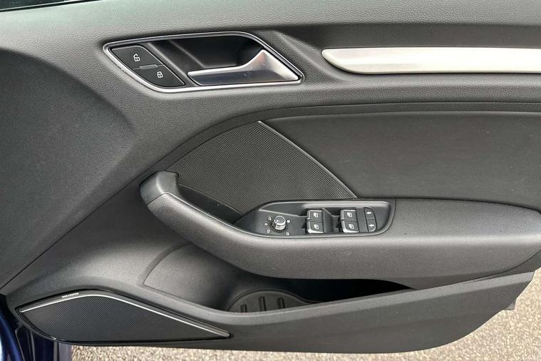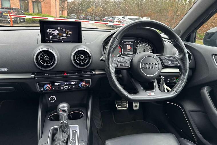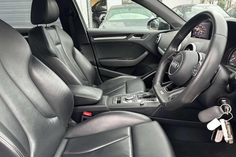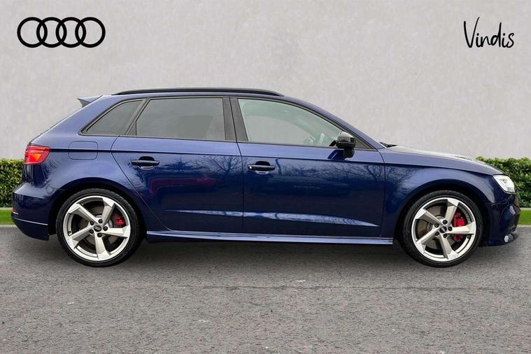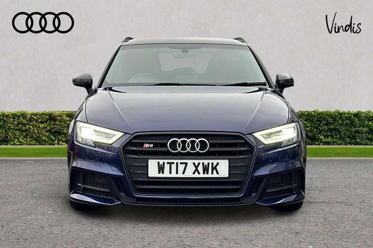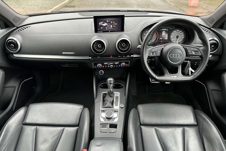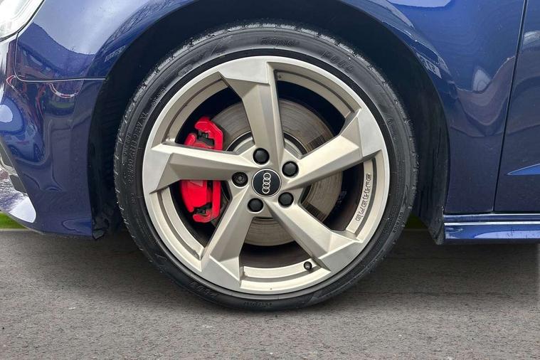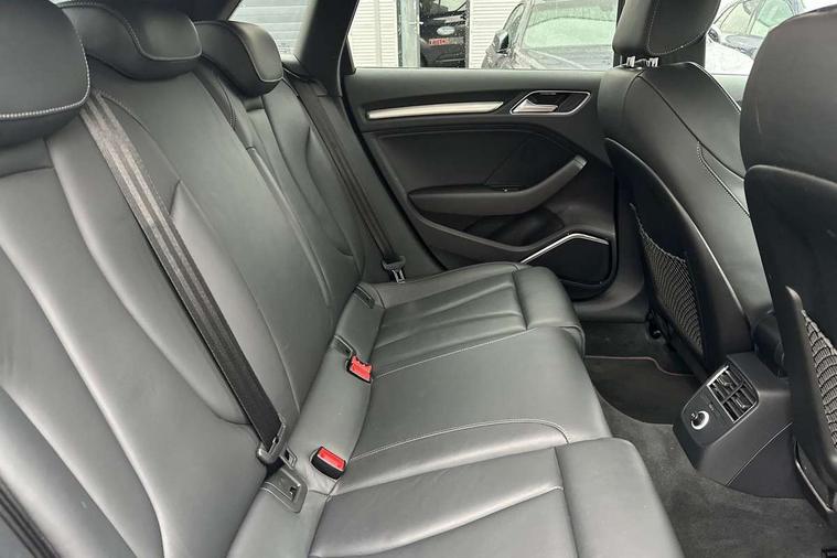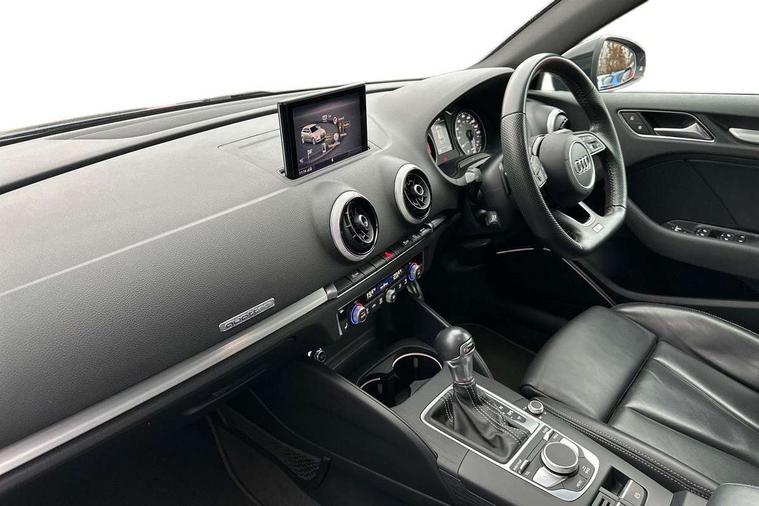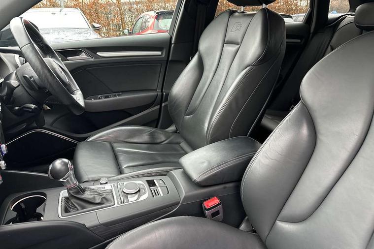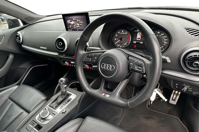 Audi connect, Audi drive select, Audi smartphone interface, Colour driver's information system display, Mobile telephone preparation - bluetooth interface, Progressive power assisted steering, SD card based satellite navigation system, Service interval indicator, Speed limit display, Voice control system, S sports suspension, 2 USB ports, Audi music interface, Auxiliary input socket, Bang + Olufsen advanced sound system, CD player, DAB Digital radio, MMI radio plus with 7" colour MMI screen and MMI controller, Auto dimming rear view mirror with light and rain sensors, Black door mirrors, Black window surrounds, Body colour bumpers with black insert, Body colour roof spoiler, Electric front windows, Electric operated/heated door mirrors, Electric rear windows, Headlight washers, Heated windscreen washer jets, LED daytime running lights, Matt black radiator grille, Platinum grey radiator grille with double chrome bars, Privacy glass, Rear wiper, S body styling, Twin oval chrome trimmed exhaust tailpipes, 3 adjustable rear headrests, 3 spoke flat bottomed multi-function leather steering wheel, 4 lashing points to secure luggage, Adjustable front armrest, Dual zone electronic climate control, Front and rear interior lights with delay, Front passenger seat isofix location point, Front/rear floor mats, Heated front seats, Height/depth adjustable steering column, Illuminated glovebox, ISOFIX child seat preparation+airbag deactivation, Jack and tool kit, Rock grey headlining, Stainless steel pedals, Steering wheel gearshift paddles, Storage compartment in centre console, Storage compartment under front seats, Storage compartments in doors, Black styling pack - A3/S3, LED interior light pack - A3/RS3, Non smoking pack - A3, Storage and luggage pack - A3/RS3, 3 point seatbelts on all seats, ABS/EBD, Active bonnet, Active front headrests, ASR, Curtain airbags, Driver and passenger side airbags, Driver/Front Passenger airbags, Drivers knee airbag, EDL, Electromechanical parking brake, ESC - Electronic Stability Control + traction control, Front passenger airbag deactivation, Manual rear child locks, Multi-Collision braking, Seatbelt warning, Tyre pressure warning, Warning triangle and first aid kit, Anti theft alarm, Anti-theft wheel bolts, Remote control central locking, Thatcham category 1 alarm + immobiliser, Aluminium air vent surrounds, Aluminium trim elements, Space saver spare wheel,