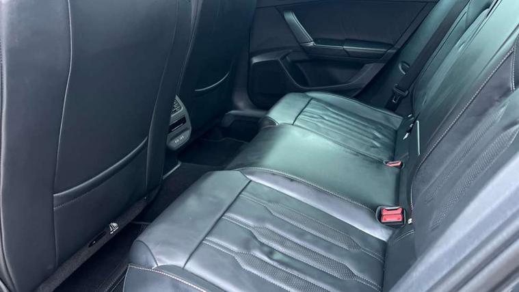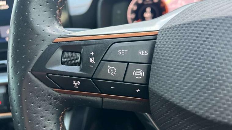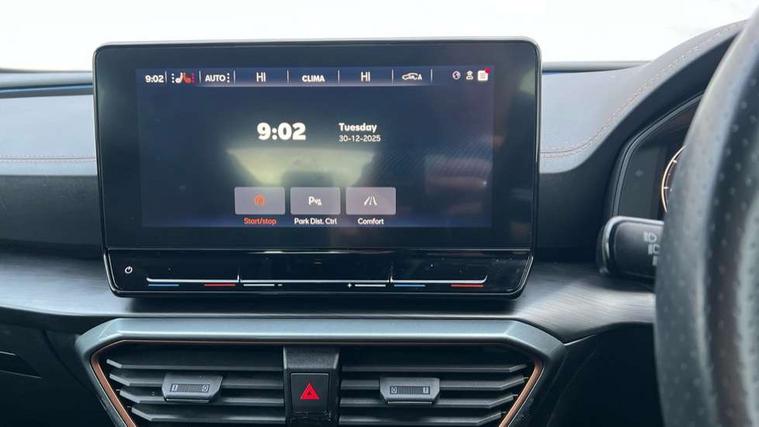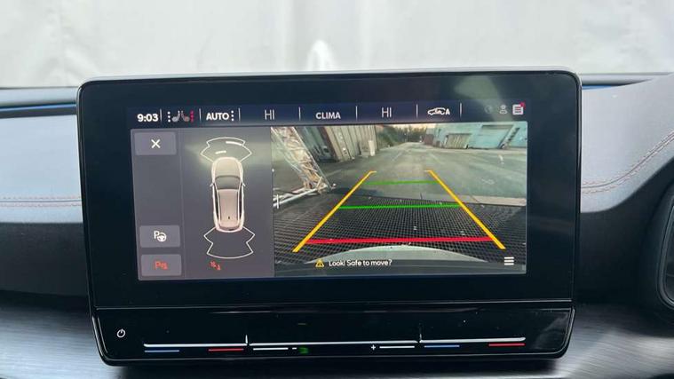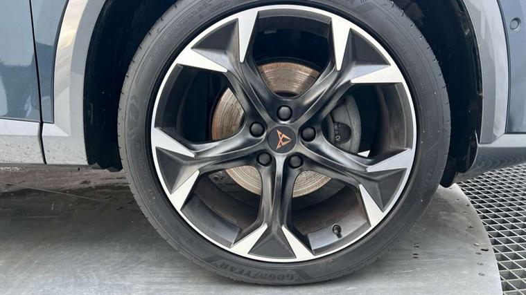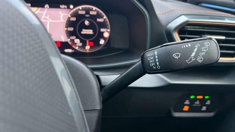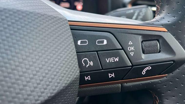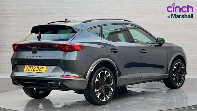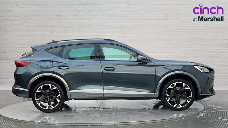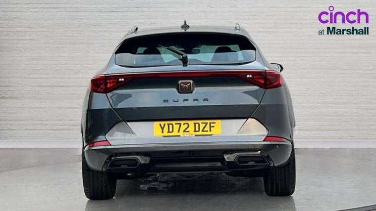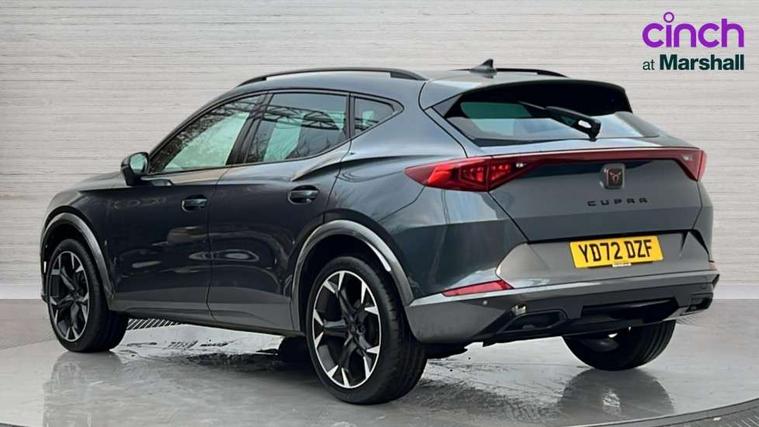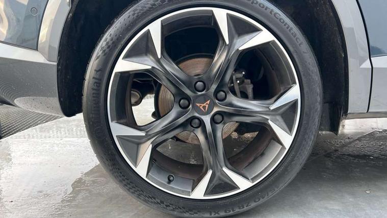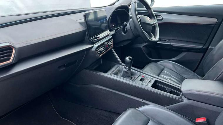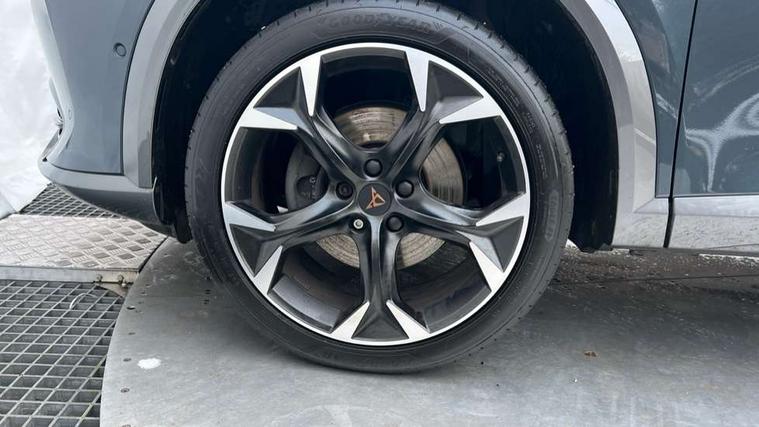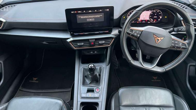 Digital cockpit and configurable dashboard, Driver alert system, Driving profile selection, E-call, Forward collision warning with automatic braking, Lane assist, Navigation system with 12'' Touchscreen Display, Park assist (inc front/rear parking sensors), PAS, Predictive adaptive cruise control with speed limiter, Rear view camera, RPM, trip computer, outside temp gauge, instrument light brightness, low fuel warning light, lights on reminder, gearshift indicator, Service interval indicator, Start/stop system with regenerative braking, Voice control system, Wireless apple carplay, Wireless phone charger, Electronic locking differential and dynamic traction support, Standard suspension, 2 front and 2 rear USB type C sockets, Auxiliary input socket, DAB radio, Auto dimming rear view mirror, Body colour door handles, Body coloured bumpers, Dark grey wing mirror, Daytime running light with automatic headlight control and coming home feature, Dynamic headlight range control, Electric front/rear windows, Electrically adjustable heated and folding door mirrors with memory function, Front fog lamps with cornering function, Gloss black roof rails and window surrounds, LED Headlights, LED Taillights with dynamic indicator, Rain sensing wipers, Rear diffuser with black simulated exhaust pipes, Rear side wing doors, Rear wash/wipe, Third brake light, Tinted rear windows, Welcome lights, 12v power supply in centre console, 12V socket, 12v socket in loadspace, 2 front and 2 rear reading lights, 230V socket, 3 seat bench in 2nd row, 60/40 split rear bench seat with armrest and mechanical seat release, Black headlining, Dust/pollen filter, Front and rear head restraints, Front centre armrest, Height/reach adjust steering wheel, Illuminated interior front door sills, Illuminated sunvisor with mirror, Isofix, Leather multi function steering wheel, Luggage tie-down hooks, Single front passenger seat, Three zone climate control with control panel in rear, Variable luggage/load compartment floor, Wraparound lighting, Genuine Nappa leather Pack - Cupra, Safety and driving pack (M) - Formentor, 3 point seatbelts on all rear seats, ABS, Brake control system - ESC and brake booster, Child proof door locks, Driver and front passenger airbags with front passenger airbag de-activation, Electronic parking brake, Front and rear disc brakes, Front side curtain airbags, Hill hold control, Seat belt reminder for front and rear seats, Tyre pressure monitoring system, Anti theft alarm system, Keyless entry and start system (KESSY), Locking wheel bolts, Copper and aluminium interior detailing, 19" 'Exclusive' machined sport matte black and silver alloy wheels,