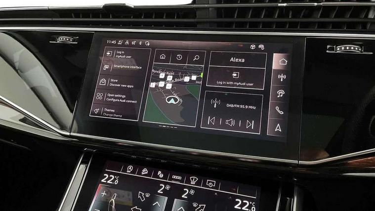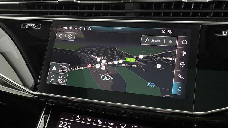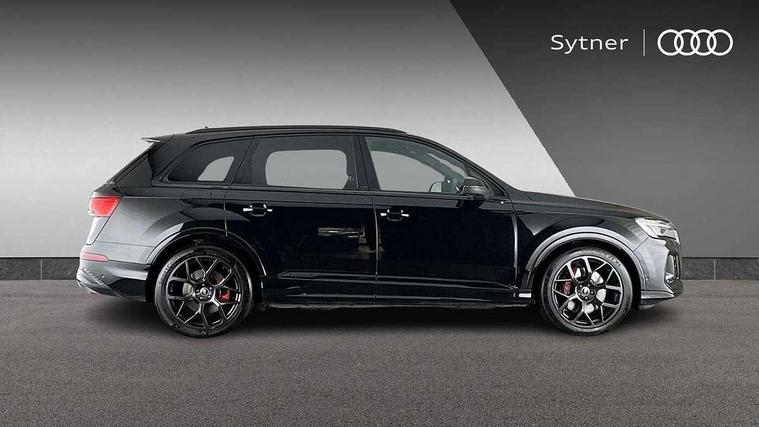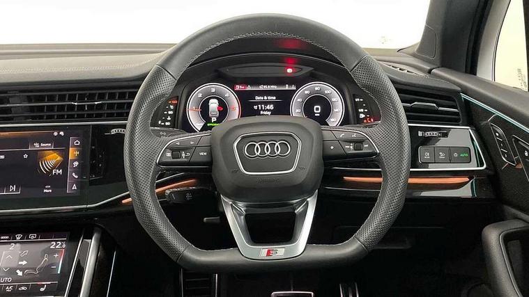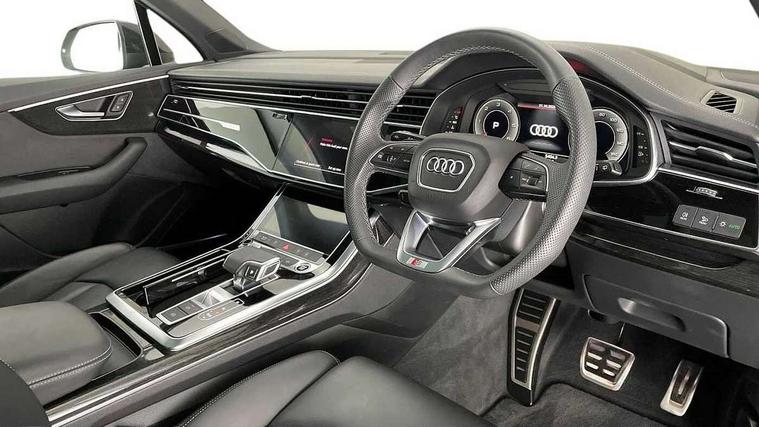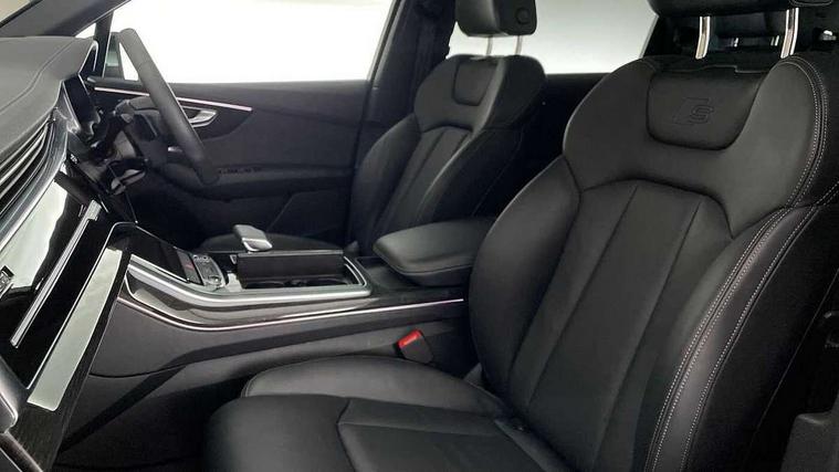 Audi connect safety and service (e-call), Audi connect with Amazon Alexa Integration, Audi drive select (Auto, Comfort, Dynamic, Efficiency, Individual, Off-road and All road), Audi phone box light with wireless charging, Audi virtual cockpit - 12.3" high-resolution LCD display with fully customisable instrument cluster, Bluetooth interface, Camera based traffic sign recognition, Electromechanical power steering, MMI navigation plus with MMI touch screens includes 10.1" and 8.6" screens with haptic feedback, Natural voice recognition, Operating buttons in Matte black, Parking system plus with 360 degree display (front, rear and side sensors) - acoustic and visual park assist system, Power operated tailgate, Rear view camera, Smartphone interface includes wireless Apple carplay/Android Auto, Start/stop system, 48V Mild hybrid technology, Adaptive air sports suspension, Quattro all wheel drive with self locking centre differential, Audi music interface - front 2 USB-C ports with charger and data functions, Audi sound system with 6 channel amplifier, 180 watt amplifying capacity and 10 loudspeakers including subwoofer, DAB digital radio module, Audi Beam uses LEDs to project S emblem with red rhombus onto the ground when opening the side doors (front/rear), Auto dimming frameless rear view mirror, Black exhausts, Black roof rails, Electrically adj heated/folding + automatically dimming exterior mirrors with memory + automatic kerb side function for passenger side exterior mirror, Heat insulating glass in windshield, Integrated LED indications in door mirrors, LED 3rd brake light, LED daytime running lights, LED rear tail lights, Loading edge protection in stainless steel, Matrix LED headlights with dynamic front and rear indicators, Privacy glass - dark tinted rear and rear side windows from B-pillar backwards, Rear side wing doors, Rear wiper, 2 seat bench in 3rd row, 2 zone automatic climate control, 3 seat bench in 2nd row, 7 seat layout with ISOFIX points for the front passenger seat and rear passenger seat, Black cloth headlining, Comfort front centre armrest, Electric adjustable front seat with 4 way lumbar support, driver memory functionality, Folding rear seats, Front head restraints, Front/rear floor mats, Heated front seats, Illuminated door sill trims with S logo, ISOFIX child seat mounting for front passenger seat and 2 outer rear seats with top tether child seat mounting for all 3 rear seats, LED interior ambient lighting, Luggage compartment cover, Luggage compartment sill protection in stainless steel, Rear head restraints, Single front passenger seat, Stainless steel pedals, Sunvisors with illuminated vanity mirrors, Black styling pack plus - Q7, 3 point seatbelts on all rear seats, Audi pre sense front, Child locks on rear doors, Convenience key with safelock and gesture tailgate, Driver and front passenger, front side and curtain airbags, Electromechanical parking brake, Electronic Stabilisation Control (ESC) including ABS, ASR and EDL, Extended pedestrian protection measures, Hill hold assist, Seatbelt reminder, Tyre pressure loss indicator, Warning triangle and first aid kit, Anti theft alarm with tow away protection, Anti-theft wheel bolts and wheel loosening detection, Keyless Go, Remote central locking, Polished oak trim with grey finish inlay, Tool kit, Tyre repair kit,