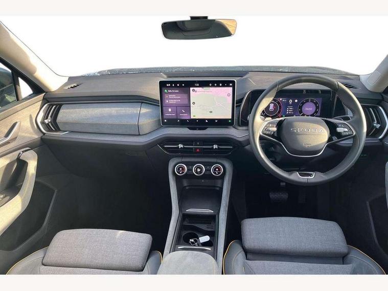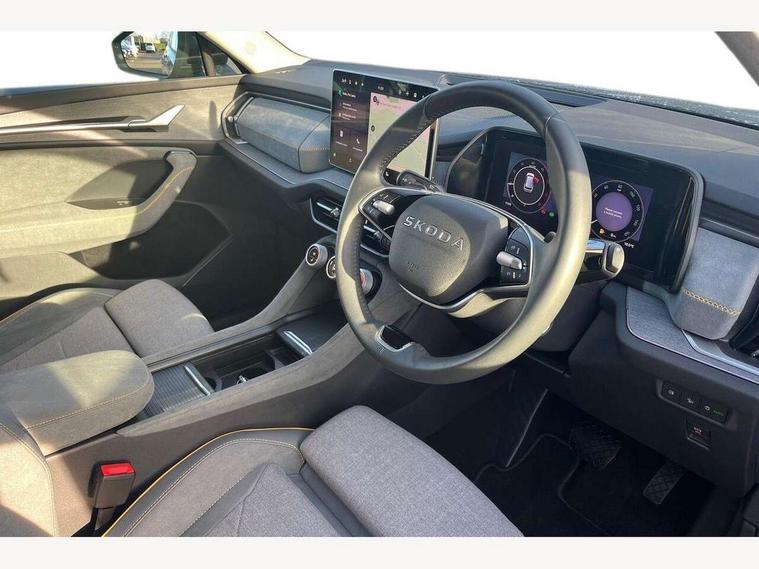 13" satellite navigation touchscreen display, Blind spot detection with door exit warning, Bluetooth system, ChatGPT functionality, Driver alert - Fatigue and drowsiness monitor, Dry display cleaner, Emergency call, Front and rear parking sensors, Front cross traffic assist, Lane assist, PAS, Rear traffic assist, Rear view camera, Tailgate unlocking from outside, Traffic sign recognition, USB C Port x 2 in front centre console, Virtual Cockpit - 10.25" digital display, Voice control system, Wireless charging for two smartphones (15W) with cooling function, Wireless SmartLink for Apple CarPlay and Android Auto, Stop/start function, 2x USB-C in the rear, 8 Speakers, DAB Digital radio, Aero front windscreen wipers with intermittent function, All weather light, Auto dimming rear view mirror, Black wheel arch surrounds, Body colour bumpers, Body colour door mirrors and handles, Cornering light and poor weather light, Electric folding /adjustable/separted heated/folding door mirrors, auto dimming with boarding sports and memory function, Electric front and rear windows, Exterior black decorative trims, Heat insulating glass in windshield, Heated rear window, Ice scraper in fuel tank cap, Invisible tailpipe, LED daytime running lights, LED front fog lamps, LED Headlights, LED rear fog light, LED rear lights, LED third brake light in rear spoiler, Light assistant with automatic headlight control and coming home feature, Logo projection in door mirrors, Rear roof spoiler, Rear side wing doors, Rear window wiper, Safety reflectors on front and rear doors, Unique dark chrome design logo on alloy wheels, Window control switches with black trim, Windscreen wipers with rain sensor, Without engine designation, 1.5l bottle holder points in all door, 1x centre rear reading light, 2 seat bench in 3rd row, 3 configurable smart dials with 32mm coloured display, 3 seat bench in 2nd row, 4 foldable roof handles with rear coat hooks, Ambient interior lighting - Dashboard, front-door stowage compartments, front and rear door panels and footwell lighting, Automatic gear selector on steering column, Chrome interior door handles, Driver/front passenger reading lights, Fabric headlining, Fixed bench 40:60:40 split folding backrests, Front and rear floor mats, Front centre armrest with jumbo box storage compartment, cup holder and 12V socket, Height adjustable front headrests, Isofix child seat fittings in outer middle row rear seats and front passenger with top tether, Manual height adjustment for front passenger seats and thigh support extender, Manual lumbar support for front passenger seat, Manually adjustable steering column, Pollen filter, Rear centre armrest with cupholders, Rear seat boot backrest release, Single front passenger seat, Skoda lettering on steering wheel, Storage pocket including mobile phone pockets on the backs of the front seats, Sunvisors with illuminated vanity mirrors, Three rear height adjustable headrests, Ticket holder on A Pillar, Tri zone climate control, Umbrella in door panel x1 made from sustainable materials, Upper and lower glovebox with card holder and coin compartment, USB C port by rear view mirror for charging only (15W), Variable boot floor, Auto door release and activation of warning lights in the event of an accident, Driver and front passenger airbag with knee airbag and front passenger airbag deactivation, Electric child locks, Electronic parking brake, ESC (incl. ABS+EMD+MSR+ASR+EDL+HBA+DSR+RBS+ESBS+MCB+TSA+XDS), Front assist with braking reaction to vehicles, pedestrians and cyclists, Front disc brakes, Fuel cut off safety device, Height adjustable front 3 point seatbelts + pretensioners, Hill hold assist, Junction assist with automatic emergency braking, Rear disc brakes, Safety vest holder in door, Seat belt reminder for all seats, Three point rear seat belts, Two tone horn, Tyre pressure monitor, Alarm with interior monitoring and tilt sensor with safe function, Anti-theft wheel bolts, Immobiliser, Remote central locking with 2 keys, Breakdown kit, Tool kit,