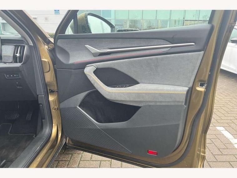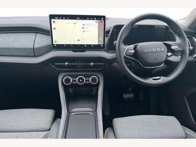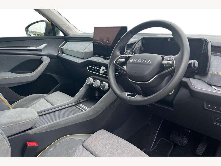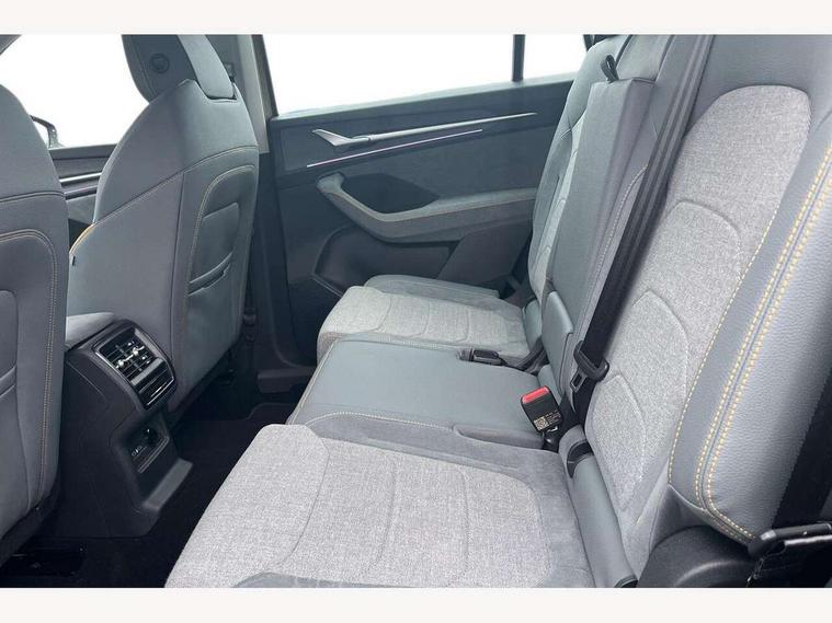 13" satellite navigation touchscreen display, Blind spot detection with door exit warning, Bluetooth system, ChatGPT functionality, Driver alert - Fatigue and drowsiness monitor, Dry display cleaner, Emergency call, Front and rear parking sensors, Front cross traffic assist, Lane assist, PAS, Rear traffic assist, Rear view camera, Tailgate unlocking from outside, Traffic sign recognition, USB C Port x 2 in front centre console, Virtual Cockpit - 10.25" digital display, Voice control system, Wireless charging for two smartphones (15W) with cooling function, Wireless SmartLink for Apple CarPlay and Android Auto, Stop/start function, 2x USB-C in the rear, 8 Speakers, DAB Digital radio, Aero front windscreen wipers with intermittent function, All weather light, Auto dimming rear view mirror, Black wheel arch surrounds, Body colour bumpers, Body colour door mirrors and handles, Cornering light and poor weather light, Electric folding /adjustable/separted heated/folding door mirrors, auto dimming with boarding sports and memory function, Electric front and rear windows, Exterior black decorative trims, Heat insulating glass in windshield, Heated rear window, Ice scraper in fuel tank cap, Invisible tailpipe, LED daytime running lights, LED front fog lamps, LED Headlights, LED rear fog light, LED rear lights, LED third brake light in rear spoiler, Light assistant with automatic headlight control and coming home feature, Logo projection in door mirrors, Rear roof spoiler, Rear side wing doors, Rear window wiper, Safety reflectors on front and rear doors, Unique dark chrome design logo on alloy wheels, Window control switches with black trim, Windscreen wipers with rain sensor, Without engine designation, 1.5l bottle holder points in all door, 1x centre rear reading light, 2 seat bench in 3rd row, 3 configurable smart dials with 32mm coloured display, 3 seat bench in 2nd row, 4 foldable roof handles with rear coat hooks, Ambient interior lighting - Dashboard, front-door stowage compartments, front and rear door panels and footwell lighting, Automatic gear selector on steering column, Chrome interior door handles, Driver/front passenger reading lights, Fabric headlining, Fixed bench 40:60:40 split folding backrests, Front and rear floor mats, Front centre armrest with jumbo box storage compartment, cup holder and 12V socket, Height adjustable front headrests, Isofix child seat fittings in outer middle row rear seats and front passenger with top tether, Manual height adjustment for front passenger seats and thigh support extender, Manual lumbar support for front passenger seat, Manually adjustable steering column, Pollen filter, Rear centre armrest with cupholders, Rear seat boot backrest release, Single front passenger seat, Skoda lettering on steering wheel, Storage pocket including mobile phone pockets on the backs of the front seats, Sunvisors with illuminated vanity mirrors, Three rear height adjustable headrests, Ticket holder on A Pillar, Tri zone climate control, Umbrella in door panel x1 made from sustainable materials, Upper and lower glovebox with card holder and coin compartment, USB C port by rear view mirror for charging only (15W), Variable boot floor, Auto door release and activation of warning lights in the event of an accident, Driver and front passenger airbag with knee airbag and front passenger airbag deactivation, Electric child locks, Electronic parking brake, ESC (incl. ABS+EMD+MSR+ASR+EDL+HBA+DSR+RBS+ESBS+MCB+TSA+XDS), Front assist with braking reaction to vehicles, pedestrians and cyclists, Front disc brakes, Fuel cut off safety device, Height adjustable front 3 point seatbelts + pretensioners, Hill hold assist, Junction assist with automatic emergency braking, Rear disc brakes, Safety vest holder in door, Seat belt reminder for all seats, Three point rear seat belts, Two tone horn, Tyre pressure monitor, Alarm with interior monitoring and tilt sensor with safe function, Anti-theft wheel bolts, Immobiliser, Remote central locking with 2 keys, Breakdown kit, Tool kit,