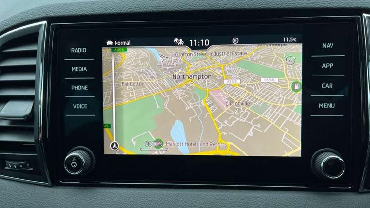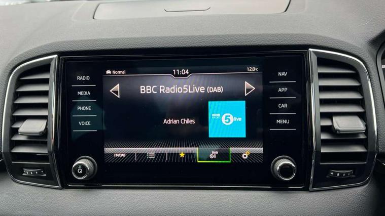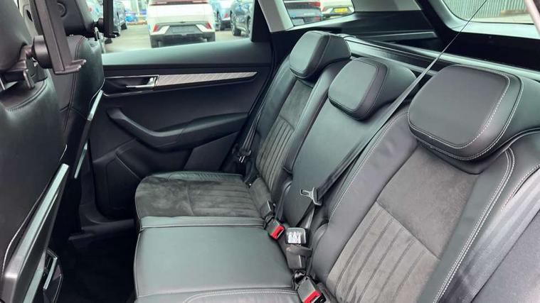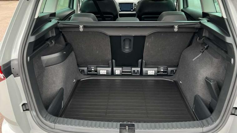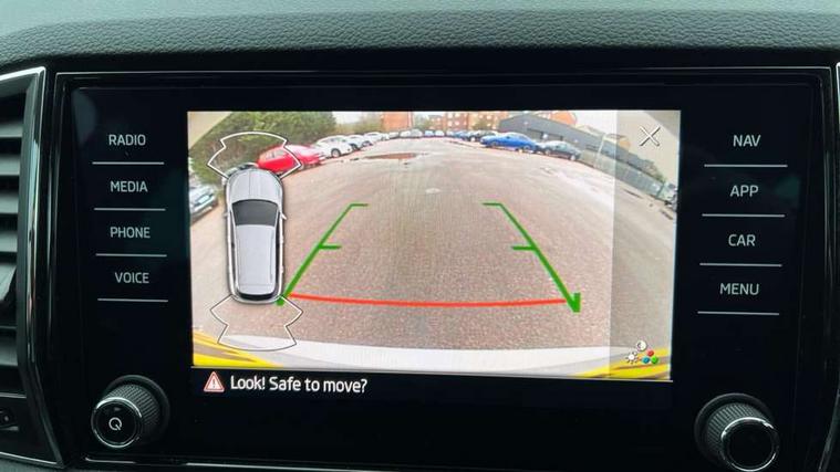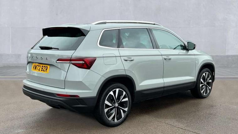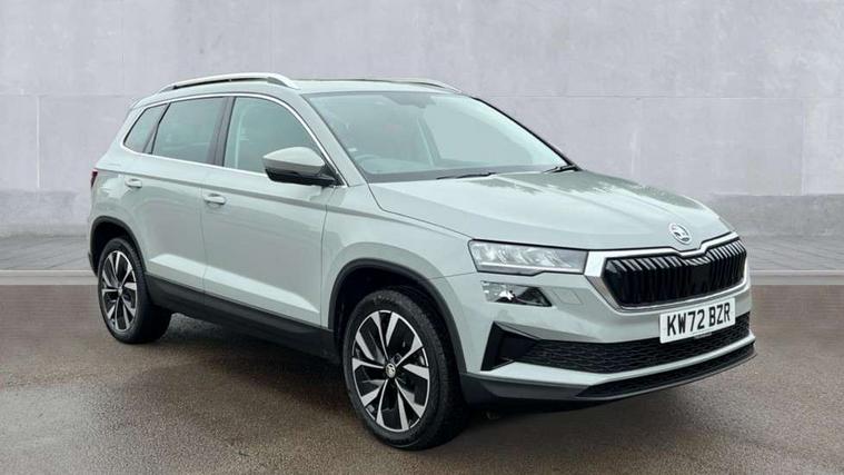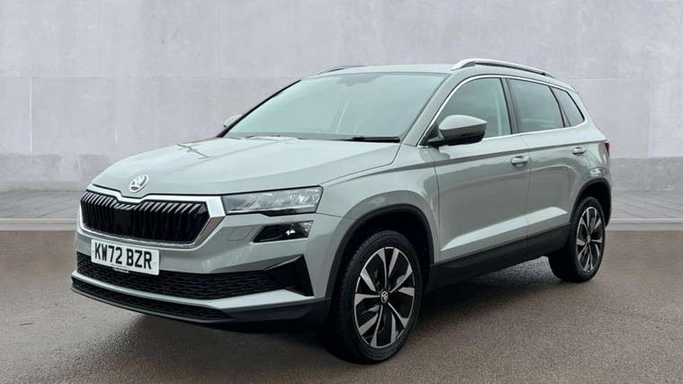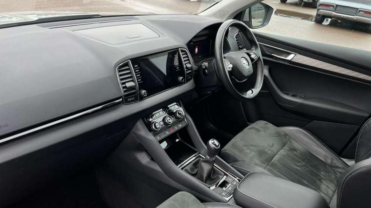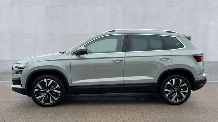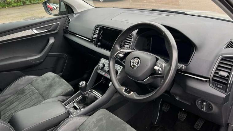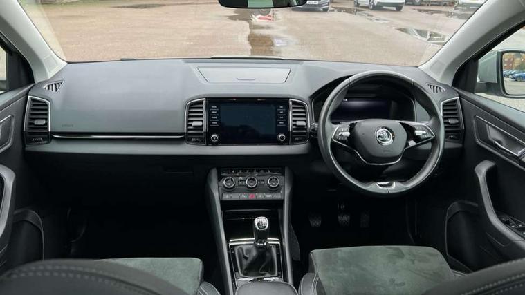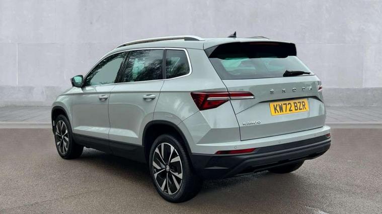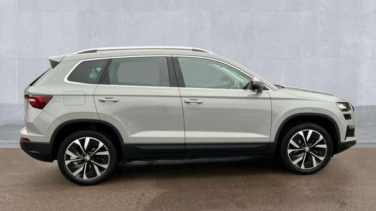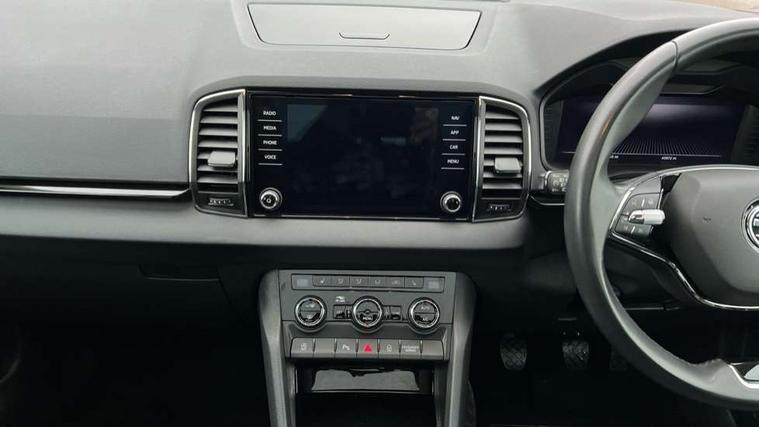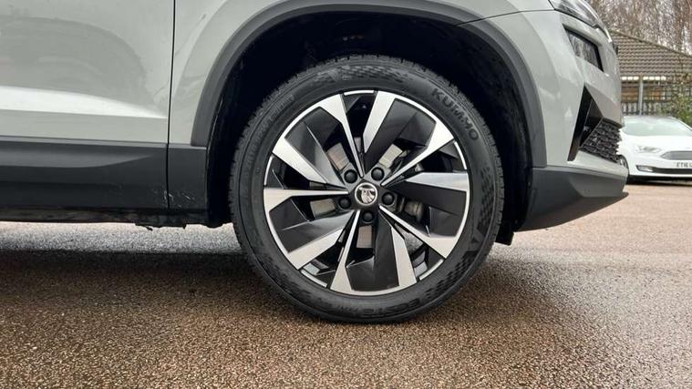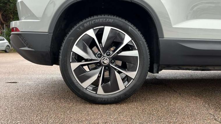 8" Digital display, Care connect, Drive mode selector, Driver fatigue sensor, Electro-mechanical PAS, Emergency services call system, Outside temperature gauge, Service interval indicator, SmartLink wireless for Apple and wired for Android, Start/stop system with regenerative braking, USB C Port x 2 in front centre console, 8 Speakers, DAB radio with Bluetooth, USB connection, Acoustic glass, Aero front windscreen wipers with intermittent function, Auto dimming rear view mirror with light and rain sensors, Black electric window control buttons, Body colour door mirrors and handles, Dynamic headlight range control with cornering light function, Electric front and rear windows with child proof lock, Heated rear windscreen, LED daytime running lights, LED rear lights with high functionality welcome effect and dynamic indicators, Light assistant (coming/leaving home/tunnel light), Plastic scuff plates, Privacy glass, Rear side wing doors, Rear spoiler, Rear window wiper with washer system and intermittent control, Safety reflectors on front doors, Third brake light, 1.5 litre bottle holders in driver and front passenger door panels, 12V socket in boot, 12v socket in front centre armrest with storage compartment and rear air vents, 2 Folding hooks and nets in boot, 2 spoke leather heated multifunction steering wheel, 2 x Tablet holder, 3 rear height adjustable headrests, 3 seat bench in 2nd row, 4 foldable roof handles with rear coat hooks, Black floor carpet, Chrome inner door handles, Decorative door sills with KAROQ badging, Double sided boot floor, Foldable hooks in the boot, Front head restraints, Height adjustable front three point seats belts with tensioners, Height/reach adjust steering wheel, Ice scraper, Illuminated glovebox, Illuminated luggage compartment, Isofix child seat preparation for front passenger seat, Isofix child seat preparation outer rear, Manual lumbar support for front seats, Pen holder, Pollen filter, Rear boot cover, Rear reading lights, Rubbish bin door, Safety vest holder, Single front passenger seat, Storage box in upper central dashboard closed, Sunvisors with illuminated vanity mirrors, Textile floor mats, Ticket holder, VarioFlex seats with standard rear seat release, Chrome roof rails + chrome pack - Karoq, Parking pack - Karoq, Automatic door unlocking in case of crash, Automatic fuel cut off in case of crash, Child locks on rear doors, Driver airbag, Electronic parking brake with auto hold function, Emergency rear braking signal, ESC including ABS, MSR, ASR, EDS, HBA, DSR, RBS, MKB and traction control, Front side airbags, Hill hold control, Knee airbags, Passenger airbag with switch-off function, Pedestrian monitor, Seatbelt reminder signalisation and pretensioner for all seats, Three point seatbelts rear, Two tone horn, Tyre pressure display, Tyre pressure monitor, Alarm with interior monitoring, back up horn and tilt sensor with safe function, Electronic engine immobiliser, Keyless entry and start/stop, Remote central locking with 2 remote folding keys, Chrome framed air vents, 18" Procyon silver alloy wheels with anthracite aero inserts, Anti-theft wheel bolts protection, Storage on wheel cover, Tool kit,