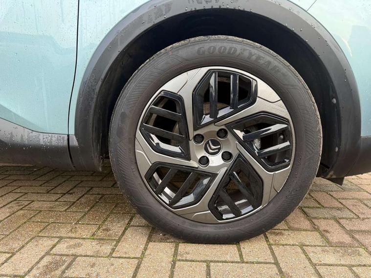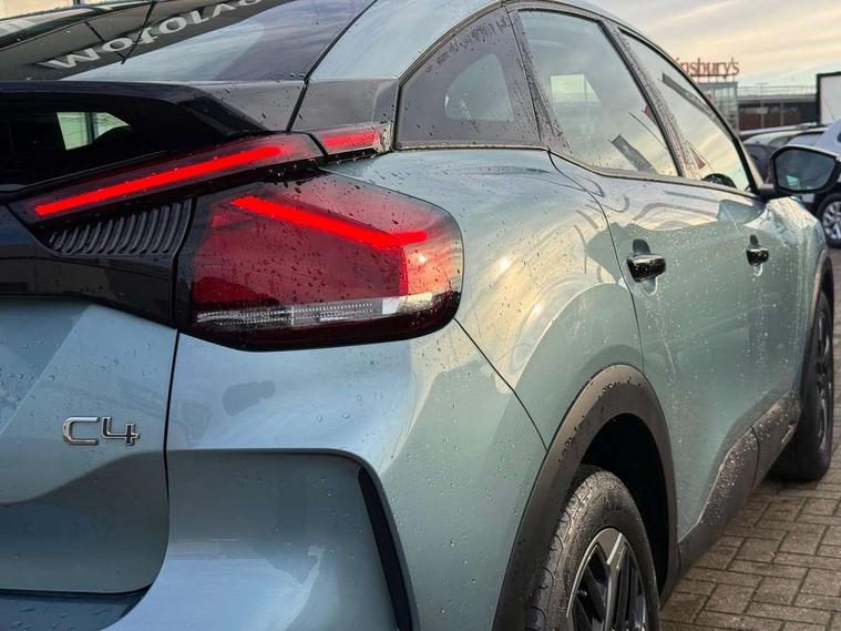 10" touchscreen user interface, controlling media, connectivity and vehicle settings, 5.5 inch backlit full TFT driver's instrument cluster, Apple car play and Android auto, Citroen connect box emergency and assistance system, Cruise control + speed limiter, Electronic Power Steering (EPS), In-crash braking, Rear parking sensors, Tailgate, Voice commands, Advanced comfort suspension - double hydraulic stops on front suspension and single on rear suspension, 6 speakers, Auxiliary input socket, Bluetooth telephone and audio streaming, DAB Digital radio, 3rd brake light, Automatic headlights, Body colour bumpers, Boot spoiler, Electrically heated and adjustable external rear view mirrors, Front and rear electric windows, Gloss black painted external rear view mirrors and black exterior door handles, Gloss black rear skirt, LED daytime running lights in V signature, LED front fog lamps with static cornering function, LED front headlamps, Rain sensing automatic front windscreen wipers, Rear side wing doors, Rear wiper, Roof aerial, Standard interior rear-view mirror with manual day-night switching, Tinted side windows with matt black detail, Welcome and goodbye lighting, 12V power outlet and USB Type-C socket for charging and data connection at 1st row, 3 rear headrests, 3 seat bench in 2nd row, Boot light, Chevrons cloth and leather effect textile seat upholstery, Dashboard tray in front cabin, Driver and passenger sun visors with vanity mirror, Dual zone automatic air conditioning, Front and rear interior lamps, Front head restraints, Grained leather steering wheel with two command blocks, Height adjustable driver's seat with adjustable lumbar support, Height adjustable front passenger seat, Height and reach adjustable steering wheel, Map pockets in rear of front seats, Raised centre console with armrest and two cup holders, Single front passenger seat, Single position boot floor, Split folding rear seats, Gloss black pack - C4/C4 X/e-C4 X, High level acoustic insulation pack - C4/C4 X/e-C4 X, 3x3 point rear seatbelts, ABS, Driver and front passenger airbags, Electric parking brake, ESP, Front seatbelt pretensioners, Hill start assist, Manual child lock in second row, Manual deactivation of front passenger airbag, Post collision safety brake, Row 1 and 2 curtain airbags, Row 1 side thorax airbags, Seatbelt unfastened on the move warning, Tyre underinflation detection, Immobiliser, Remote locking with deadlocks, Two remote keys, 18" Bi-tone painted aeroblade alloy wheels with anti-theft locking wheel nuts, Puncture repair kit with compressor,
