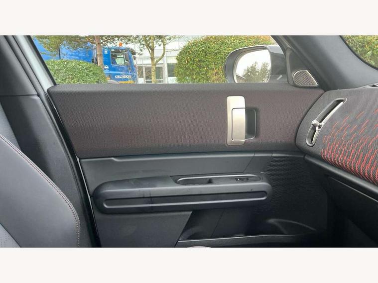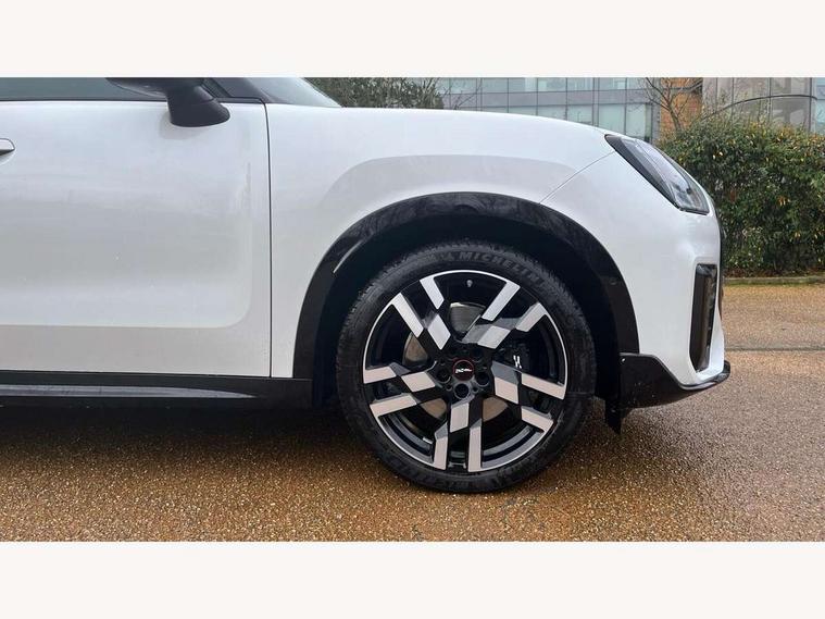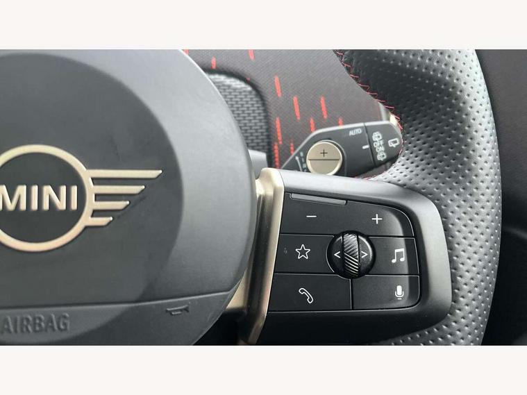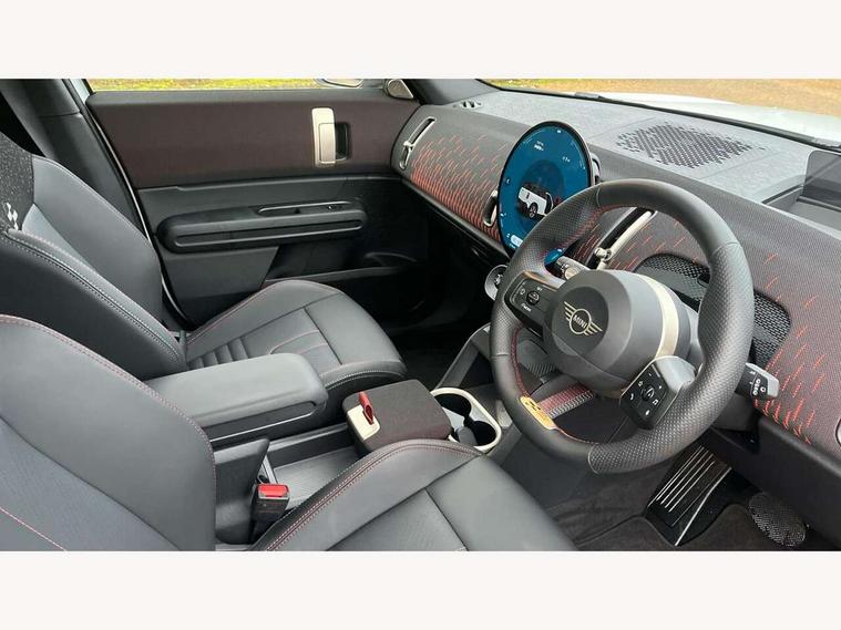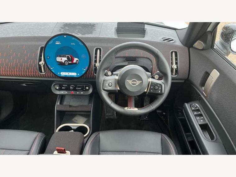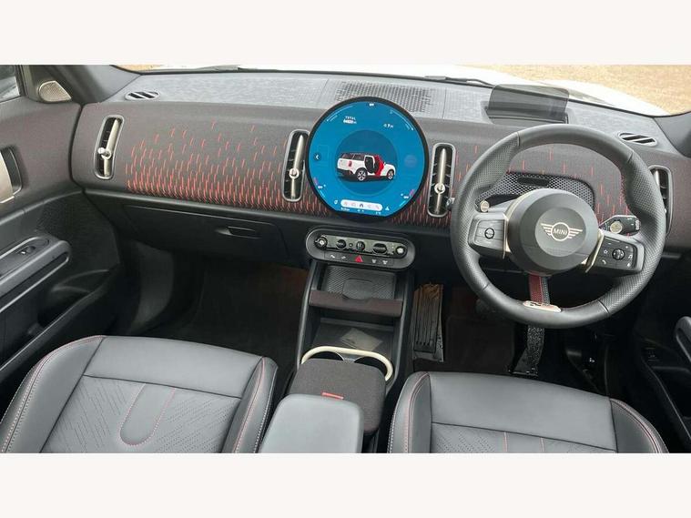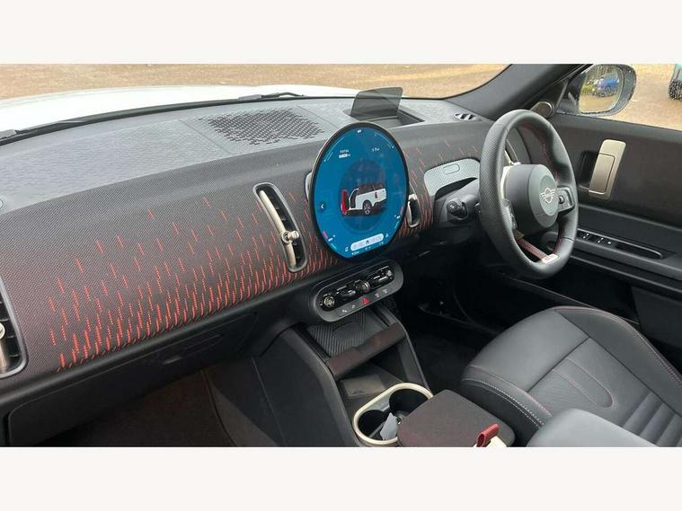 Bluetooth connection, Circular OLED Screen, Compatible mobile phone bluetooth with audio streaming, Cruise Control (DCC), Digital dashboard display, Driving assistant, Driving Assistant Plus Preparation, E-call, Electro-mechanical speed dependant steering assistance, MINI Experience Modes, MINI Head up display, Mini navigation system, MINI TeleServices, Parking assistant in camera and ultrasound based assistance system, rear view camera, parking aid and distance control, Adaptive suspension, Double clutch sports transmission, Larger capacity fuel tank, 6 speakers, DAB Digital radio, Personal eSim, Auto tailgate, Electric adjustable heated door mirrors, Front and rear apron, Front and rear electric windows, Heated rear window, High beam assistant, High gloss hexagonal patterned grille surround, Interior rear-view mirror with automatic anti-dazzle function, LED daytime running lights, LED headlights with extended contents including Adaptable light signatures, LED rear lights, LED third brake light, Rain sensor with auto headlights, Rear roof spoiler with airblades, Rear side wing doors, Rear window wiper, Roof rails, 3 Seat sliding rear bench in 2nd row, 60/40 split rear bench seat, Anthracite headliner, Auto air conditioning, Driver and front passenger seat heating, Floor mats, Front armrest, Front headrests, Heated steering wheel, Height and length steering column adjustment, JCW Front sports seats, Lidded storage box in Black/Red knit, Luggage compartment separating net, Perforated Vescin steering wheel, Rear headrests, Seat adjustment for rear seats, Single front passenger seat, Sunvisors with vanity mirrors, Vescin/Cloth upholstery, Wireless charging tray, Interior and exterior mirror package - Mini Countryman, 3x3 point rear seat belts, 6 Airbags - front, side, head and seat belt tensioners, ABS, Brake calipers in Black with JCW badge, DSC - Dynamic Stability Control, Electronic handbrake, Electronic Stability Programme (ESP), Front ISOFIX (iSize), Hill descent control, Hill hold assist, Hill start assist, JCW Sport Brakes, Manual rear child locks, Traction control, Tyre pressure monitoring system, Warning triangle, Alarm system with tilt sensor, monitoring doors, bonnet interior and tailgate, Auto drive away locking, Comfort access system, Deadlocking function, Electronic vehicle immobiliser, Locking wheel bolts, Remote control locking, Start/stop toggle with keyless go, JCW Black/Red dashboard knit, MINI Mobility Kit,