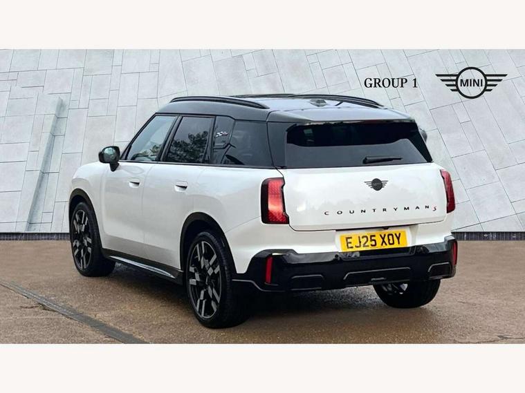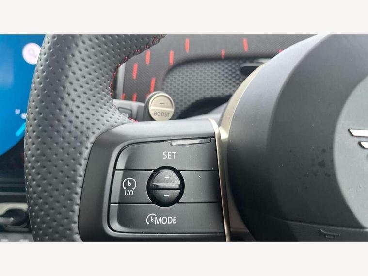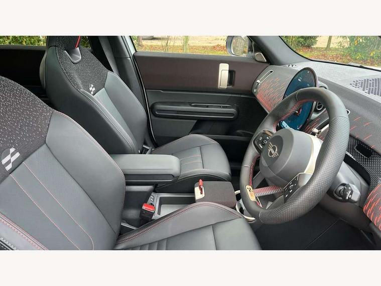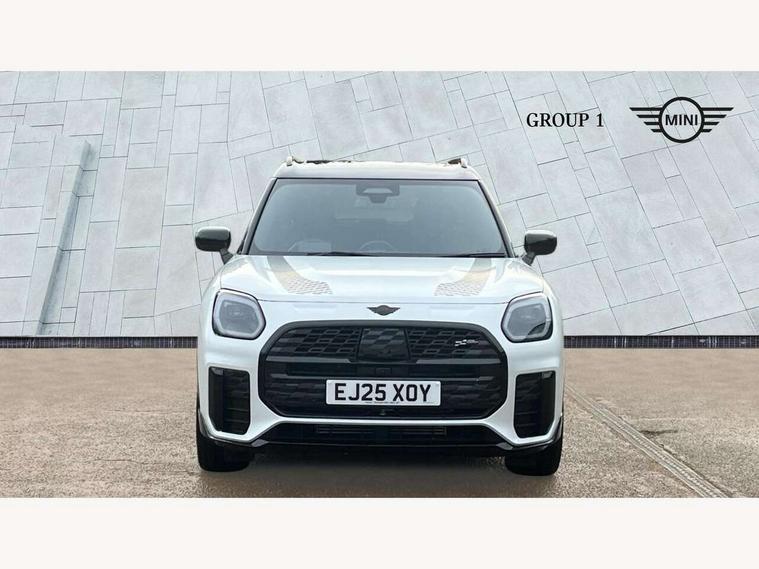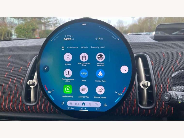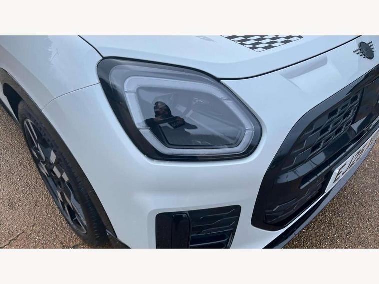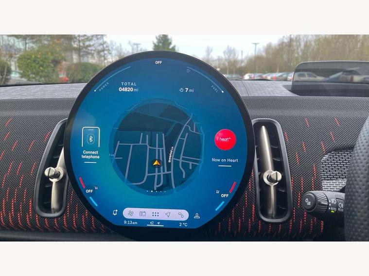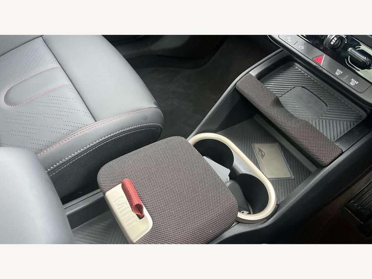 Bluetooth connection, Circular OLED Screen, Compatible mobile phone bluetooth with audio streaming, Cruise Control (DCC), Digital dashboard display, Driving assistant, Driving Assistant Plus Preparation, E-call, Electro-mechanical speed dependant steering assistance, MINI Experience Modes, MINI Head up display, Mini navigation system, MINI TeleServices, Parking assistant in camera and ultrasound based assistance system, rear view camera, parking aid and distance control, Adaptive suspension, Double clutch sports transmission, Larger capacity fuel tank, 6 speakers, DAB Digital radio, Personal eSim, Auto tailgate, Electric adjustable heated door mirrors, Front and rear apron, Front and rear electric windows, Heated rear window, High beam assistant, High gloss hexagonal patterned grille surround, Interior rear-view mirror with automatic anti-dazzle function, LED daytime running lights, LED headlights with extended contents including Adaptable light signatures, LED rear lights, LED third brake light, Rain sensor with auto headlights, Rear roof spoiler with airblades, Rear side wing doors, Rear window wiper, Roof rails, 3 Seat sliding rear bench in 2nd row, 60/40 split rear bench seat, Anthracite headliner, Auto air conditioning, Driver and front passenger seat heating, Floor mats, Front armrest, Front headrests, Heated steering wheel, Height and length steering column adjustment, JCW Front sports seats, Lidded storage box in Black/Red knit, Luggage compartment separating net, Perforated Vescin steering wheel, Rear headrests, Seat adjustment for rear seats, Single front passenger seat, Sunvisors with vanity mirrors, Vescin/Cloth upholstery, Wireless charging tray, Interior and exterior mirror package - Mini Countryman, 3x3 point rear seat belts, 6 Airbags - front, side, head and seat belt tensioners, ABS, Brake calipers in Black with JCW badge, DSC - Dynamic Stability Control, Electronic handbrake, Electronic Stability Programme (ESP), Front ISOFIX (iSize), Hill descent control, Hill hold assist, Hill start assist, JCW Sport Brakes, Manual rear child locks, Traction control, Tyre pressure monitoring system, Warning triangle, Alarm system with tilt sensor, monitoring doors, bonnet interior and tailgate, Auto drive away locking, Comfort access system, Deadlocking function, Electronic vehicle immobiliser, Locking wheel bolts, Remote control locking, Start/stop toggle with keyless go, JCW Black/Red dashboard knit, MINI Mobility Kit,