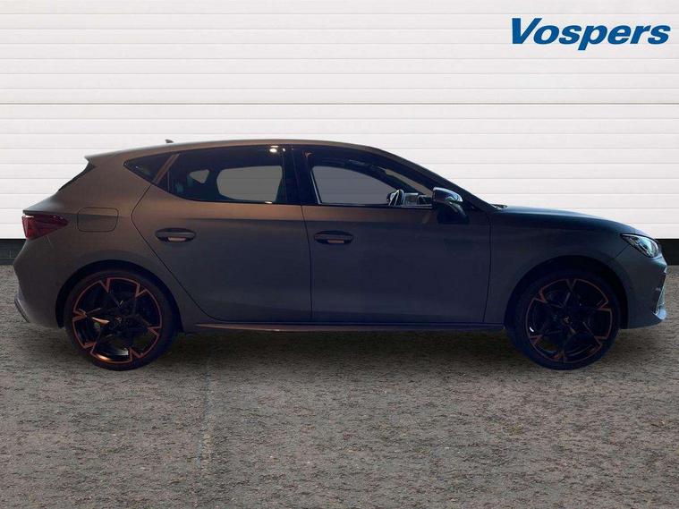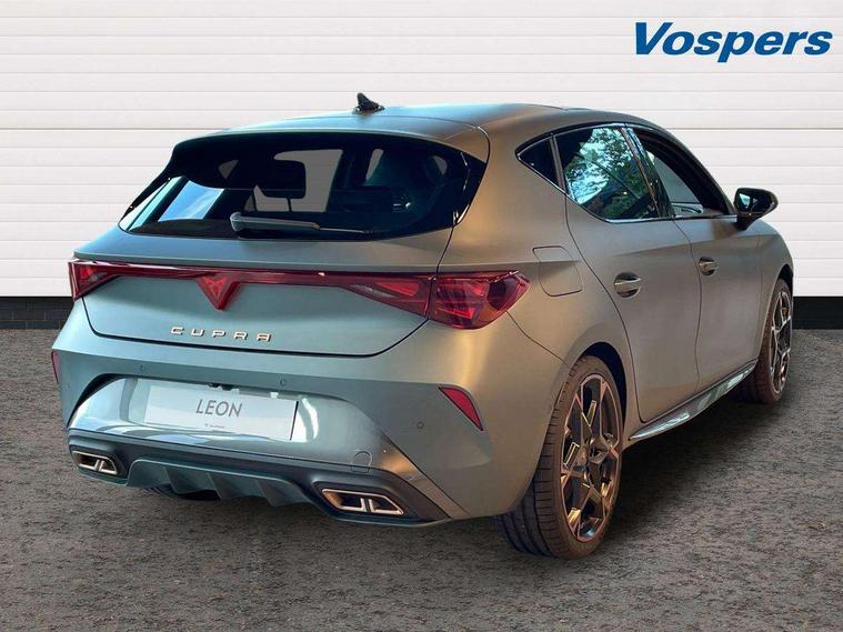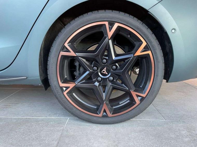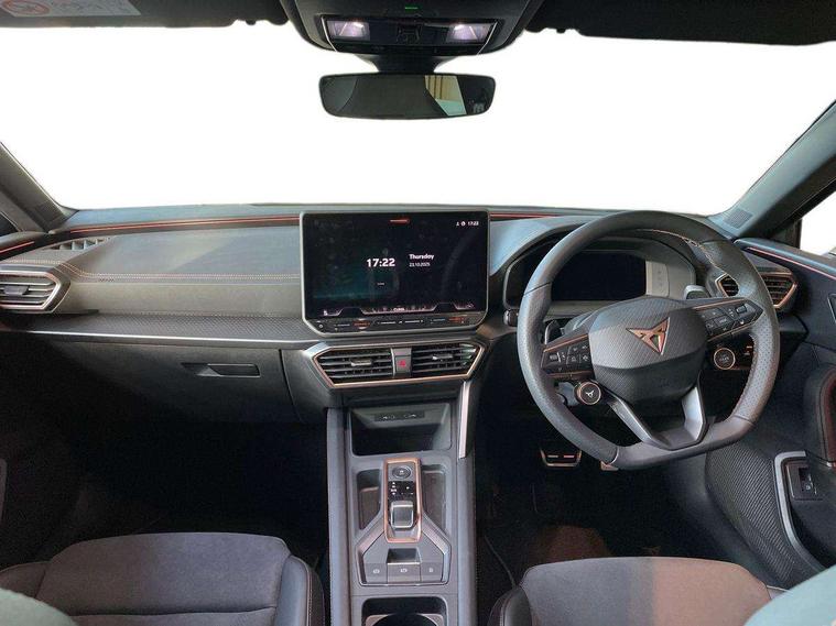 Adaptive cruise control with follow-to-stop and speed limiter, CUPRA drive profile selection with (Comfort/Sport/Individual), throttle response and gearshift mode, Digital cockpit, Dynamic road sign display, E-call, Four x USB Type C ports (2 in front and 2 in rear), Front and rear parking sensors, Front assist with forward collision warning braking reaction to vehicles, pedestrians and cyclists, Full link smartphone integration with Mirror Link, wireless Apple CarPlay and wired Google Android Auto, Intelligent park assist, Lane change assist with emergency assist, Lockable tailgate, Rear view camera, RPM, trip computer, outside temp gauge, instrument light brightness, low fuel warning light, lights on reminder, gearshift indicator, Service interval indicator, Side and exit assist, Start/stop system with regenerative braking, Wireless phone charger, 10 amp mode 2 charging cable, 16 amp mode 3 charging cable, Auxiliary input socket, Immersive by Sennheiser TM - 10 speakers, 1 central speaker, 1 subwoofer, Auto dimming rear view mirror, Body colour door handles, Body coloured bumpers, CUPRA side skirts - Painted in dark aluminium, Cupra sports bumpers, Dark tinted rear windows, Electric front/rear windows, Electrically adjustable, heated and folding door mirrors, High beam assist, LED front fog lamps with cornering function, LED rear fog lamp, Matrix LED Headlights with variable light distribution, Matrix Beam and Dynamic headlight range control, Panoramic sunroof, Rain sensing wipers, Rear side wing doors, Rear wash/wipe, Separate daytime running light with automatic headlight control and coming home feature, Third brake light, Welcome light with logo projector in door mirrors, 12v power supply in centre console, 3 seat bench in 2nd row, 5 headrests, 60/40 split rear bench seat with armrest, Ambient lighting (glovebox, footwell, ambient lighting multicoloured), Black headlining, Cupra sports pedals, CUPRA Supersports, heated steering wheel with satellite buttons, Dinamica cloth upholstery, Electrically adjustable driver seat and lumbar support with memory function + manually adjustable passenger seat, Folding boot cover, Front and rear reading lights X 4, Front centre armrest, Heated front seats, Height/reach adjust steering wheel, Illuminated interior front door sills, Interior wraparound lighting, ISOFIX points in outer rear seats with top tether anchorage points, Single front passenger seat, Storage pockets on rear of front seats, Sunvisors with illuminated mirror, Three zone climate control, Dynamic and comfort pack - Leon Cupra, Media system plus with 12.9" display + navigation pack - Leon Cupra, 3 point seatbelts on all rear seats, ABS, Brake control system - ESC and brake booster, Child proof door locks, Cupra black brake calipers, Driver and front passenger airbags with front passenger airbag de-activation, front side and curtain airbags, Electronic parking brake, Hill hold control, Pre-crash front and rear seat belt tensioner, window closure and hazard lights, Rear disc brakes, Seat belt reminder for front and rear seats, Tiredness recognition system, Tyre pressure monitoring system, Anti theft alarm system with interior monitoring in cab, backup horn and towing protection, KESSY Advanced - Keyless start, keyless entry, Locking wheel bolts, Chrome and copper interior detailing, 19" Polar machined R black and copper alloy wheel with 91Y tyres, Breakdown kit, Tool kit,
