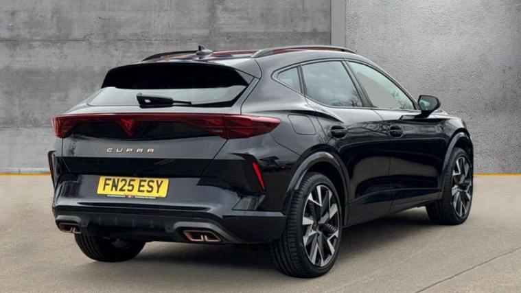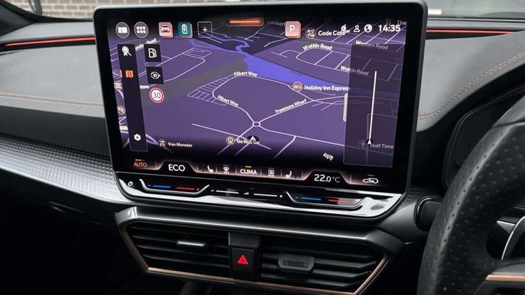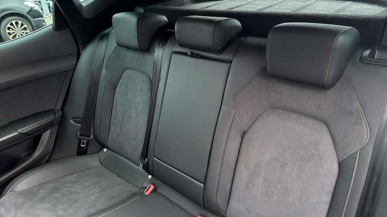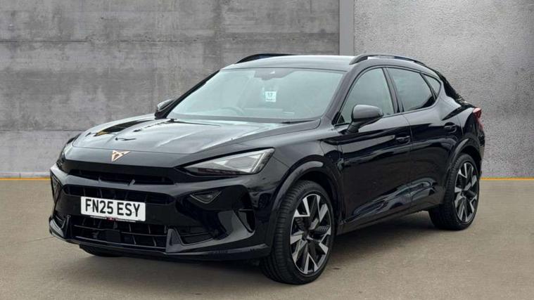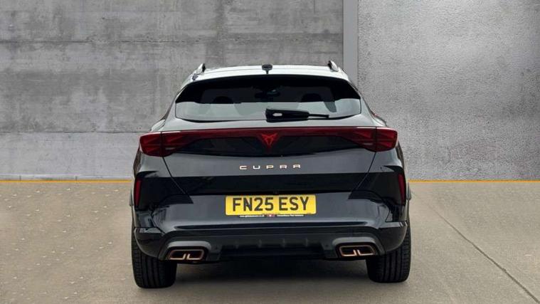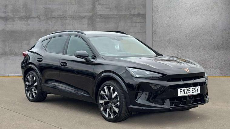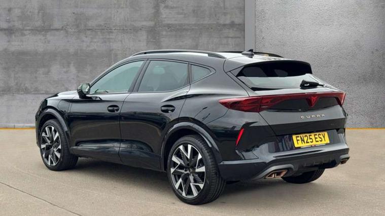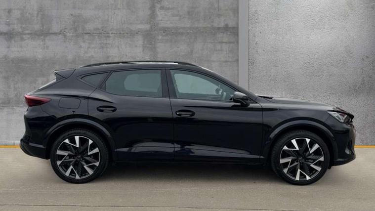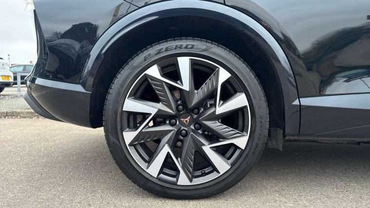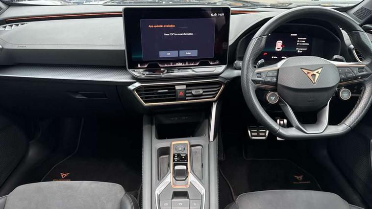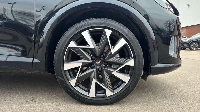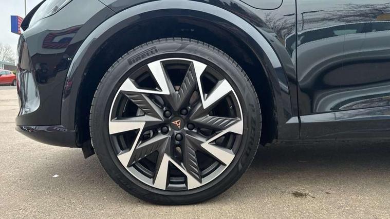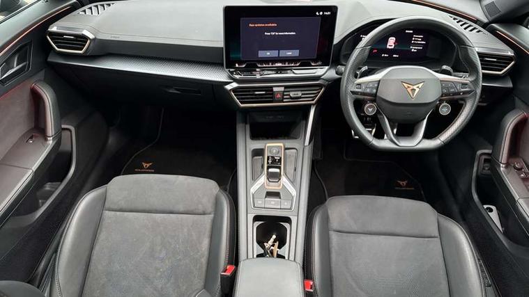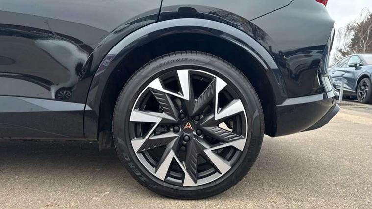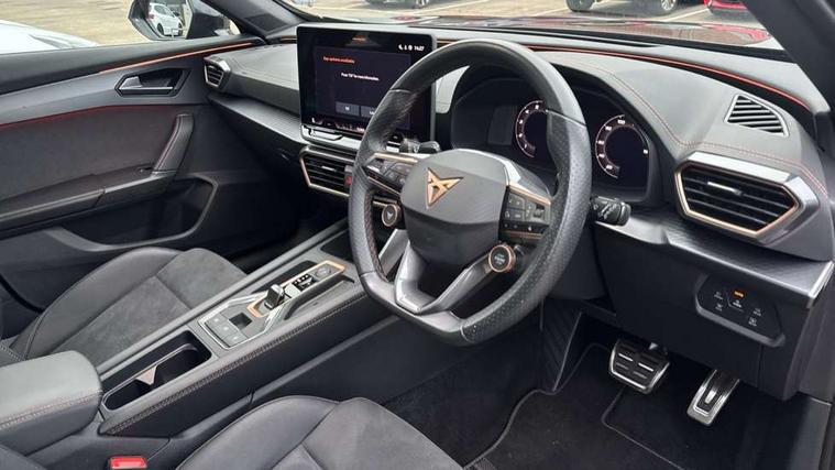 10.25" digital cockpit and configurable dashboard, Adaptive cruise control with follow-to-stop and speed limiter, Advanced driver alert system, Driving profile selection, Dynamic road sign display, Emergency steering support with turn assist, Forward collision warning with automatic braking, Front and rear parking sensors, Full link phone integration, Lane assist, Progressive steering, Rear view camera, RPM, trip computer, outside temp gauge, instrument light brightness, low fuel warning light, lights on reminder, gearshift indicator, Service interval indicator, Start/stop system with regenerative braking, Virtual pedal and electric tailgate, Voice control system, Wired Android Auto, Wireless apple carplay, Wireless phone charger, 10 amp mode 2 charging cable, 32 amp mode 3 charging cable, CUPRA sport suspension, Electronic locking differential and dynamic traction support, 2 front and 2 rear USB type C sockets, Media system with navigation, 12.9" touchscreen display, voice control, DAB, steering wheel mounted controls, Auto dimming rear view mirror, Body colour door handles, Body coloured bumpers, Dark grey wing mirror, Daytime running light with automatic headlight control and coming home feature, Door panel ambient lighting, Dynamic headlight range control, Electric front/rear windows, Electrically adjustable heated and folding door mirrors with memory function, Gloss black roof rails and window surrounds, High beam assist, LED 3rd brake light, LED front fog lamps with cornering function, LED Headlights, LED Taillights with dynamic indicator, Rain sensing wipers, Rear diffuser with copper simulated exhaust pipes, Rear fog lights, Rear side wing doors, Rear wash/wipe, Tinted rear windows, Welcome lights (within exterior mirror housing), 12V socket, 2 front and 2 rear reading lights, 3 seat bench in 2nd row, 60/40 split rear bench seat with armrest and mechanical seat release, Black headlining, Black interior roof lining, Cupra sports pedals, Dust/pollen filter, Electrically adjustable driver's seat with memory and lumbar support, Front and rear head restraints, Front centre armrest, Heated front seats, Heated supersports multifunction leather steering wheel with satellite buttons and gear shift paddles, Height/reach adjust steering wheel, Illuminated aluminium doorsteps, Illuminated interior front door sills, Illuminated sunvisor with mirror, Isofix, Leather dashboard, door insert and side trim panel, LED smart wraparound lighting, PVC/Dinamica microfiber upholstery + bucket seats, Satellite steering wheel, Single front passenger seat, Storage pockets on rear of front seats, Three zone climate control with control panel in rear, 3 point seatbelts on all rear seats, ABS, Brake control system - ESC and brake booster, Child proof door locks, Driver and front passenger airbags with front passenger airbag de-activation, Electronic parking brake, Front and rear disc brakes, Front side curtain airbags, Hill hold control, Public e-call, Seat belt reminder for front and rear seats, Tyre pressure monitoring system, Anti theft alarm system, KESSY Advanced - Keyless start, keyless entry with SAFELOCK, Locking wheel bolts, Copper and aluminium interior detailing, 19" Sandstorm machined sport black and silver alloy wheels, Breakdown and tool kit,