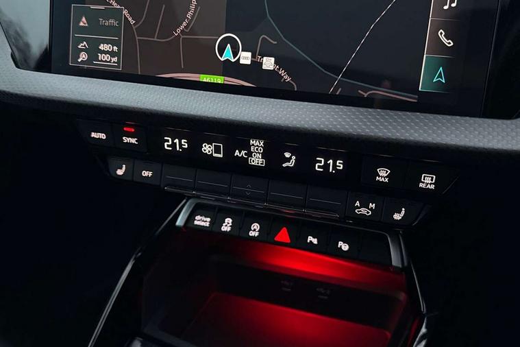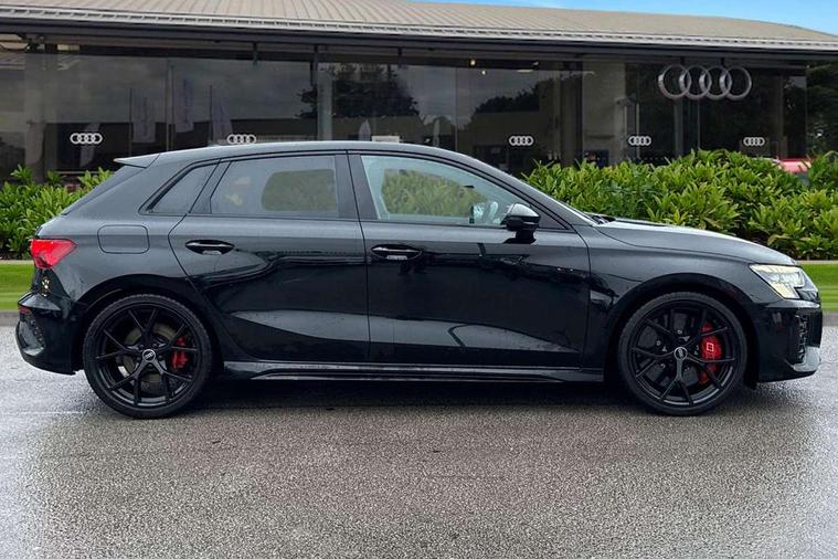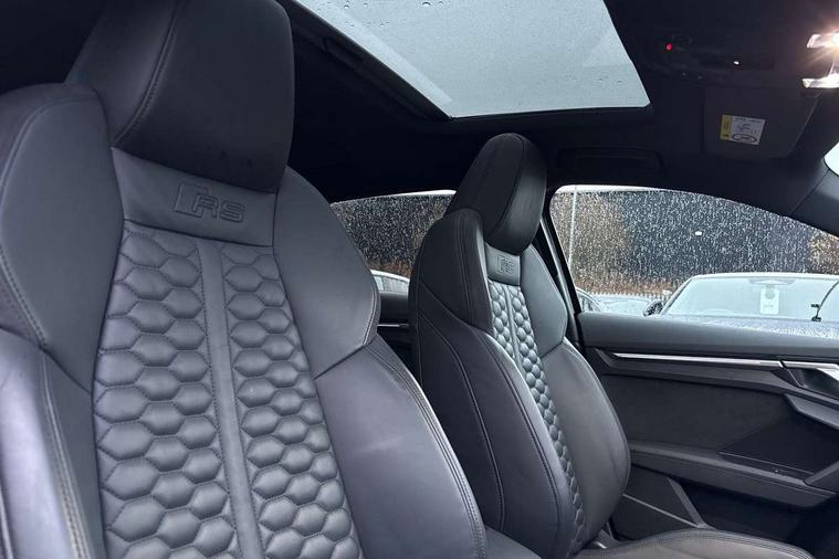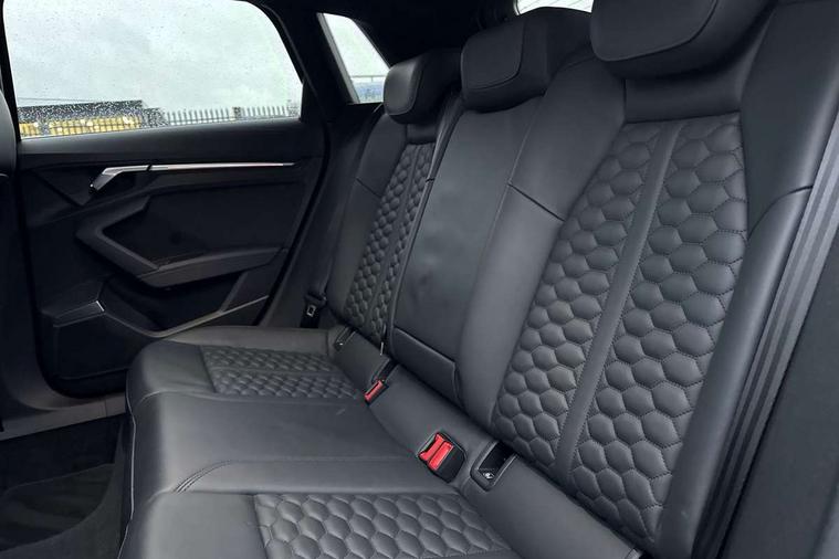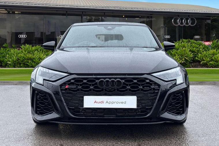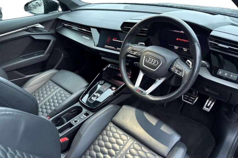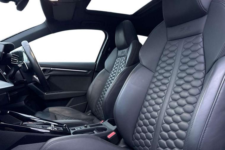Adaptive cruise assist, Adaptive cruise control, Audi connect emergency call and service, Audi smartphone interface, Audi virtual cockpit with RS specific display 12.3" full colour digital instrument cluster, Automatic start/stop system with recuperation, Bluetooth interface, Camera based traffic sign recognition, Collision avoidance assistant, Head up Display, Lane departure warning system, Legal emergency call, Parking assist with parking system plus, Power operated tailgate - Luggage compartment lid opens electrically, Progressive power assisted steering, Reversing camera, Quattro permanent four wheel drive, Rear suspension, DAB Digital radio, 3rd brake light, Acoustic glass windscreen, Audi beam uses LEDs to project the Audi sport logo onto the ground as you exit your RS 3, Audi matrix LED headlights, LED rear lights, dynamic front and rear indicators and headlight cleaning system, Auto dimming rear view mirror, Black side skirts, Body colour roof, Carbon exterior door mirror, Carbon fibre engine cover, Daytime running lights, Electric adj heated/folding + auto dimming exterior mirrors with memory + LED indicator + auto kerb side function for passenger side exterior mirror, Front spoiler in high gloss black, Heat insulating glass windscreen, Light and rain sensors, Panoramic glass sunroof, Privacy glass - dark tinted rear and rear side windows from B-pillar backwards, Rear side wing doors, Rear window wiper and washer system, RS exterior features in gloss black, RS sports exhaust system, 3 seat bench in 2nd row, 3 spoke leather multifunction steering wheel with gear shift paddles, 4 way lumbar support for front seats, 40/20/40 split folding rear seat bench, Black cloth headlining, Dual zone electronic climate control, Electrically adjustable front seats with memory function for driver's side, Front and rear headrests, Front centre armrest, Front sports seats RS embossed logo, Front/rear floor mats, Heated front seats, Honeycomb stitching and RS embossing, Illuminated door sill trims inlays in aluminium with RS 3 logo, Illuminated vanity mirror, RS emblems, Single front passenger seat, Stainless steel pedals and front footrest in black, Aluminium interior elements pack - RS3, Ambient lighting pack - RS3, Comfort and sound pack - RS3, Driver assistance pack with 3 spoke leather multi function steering wheel - RS3, MMI navigation plus with MMI touch - RS3, RS bodystyling - RS3, Storage Pack - RS3, 3x3 point rear seat belts, ABS/EBD, ASR, Audi pre sense front, Driver/Front Passenger airbags, EDL, ESC - Electronic Stability Control + traction control, Front passenger airbag deactivation, Front side airbags with head airbags and interaction airbag, Hill hold assist, Seat belt reminder with passenger presence detection in rear, Tyre pressure loss indicator, Warning triangle and first aid kit, Anti theft alarm, Anti-theft wheel bolts, Electronically operated child lock, Remote control central locking, Full decorative carbon trim, 19" 5 Y spoke black with graphic print alloy wheels, Tool kit, Tyre repair kit,