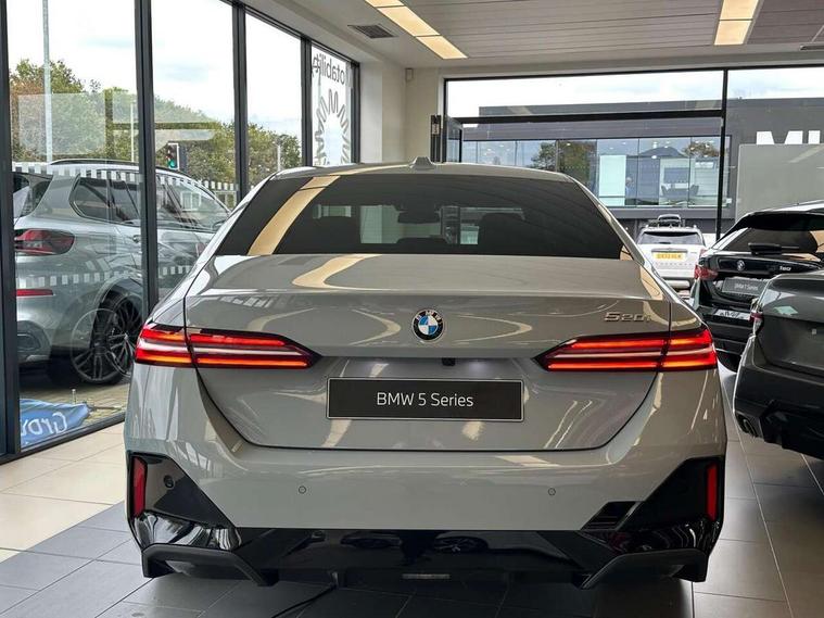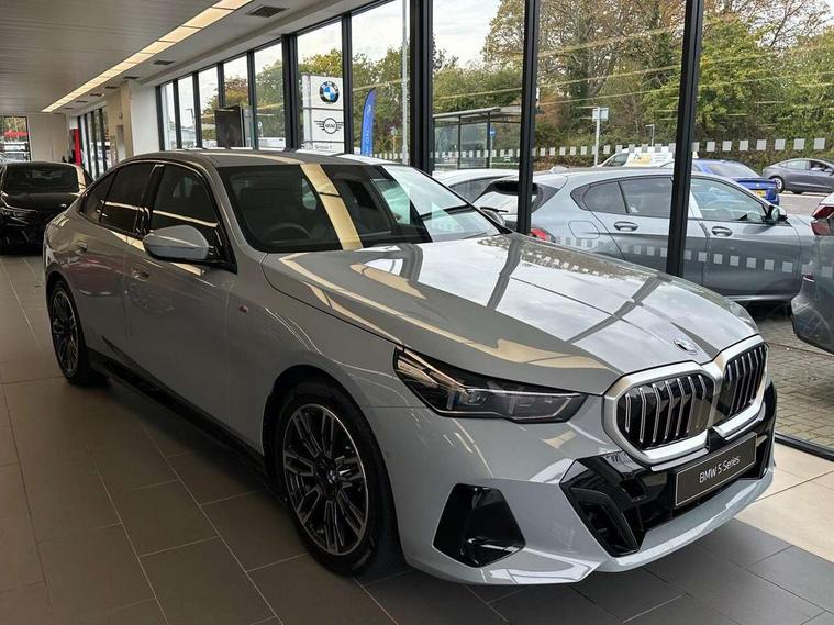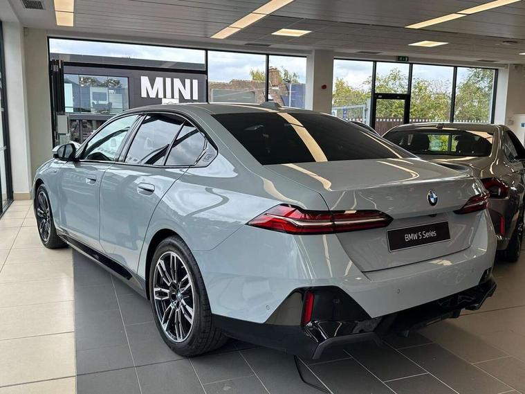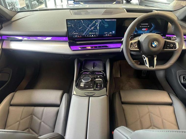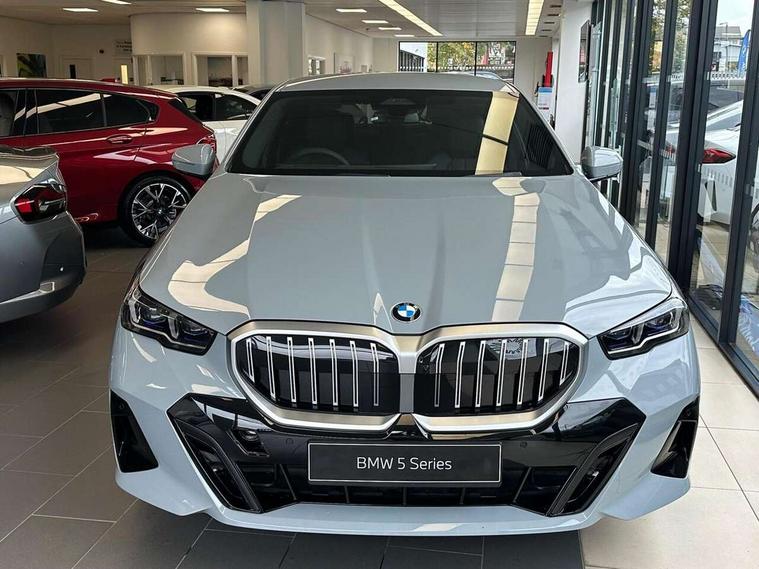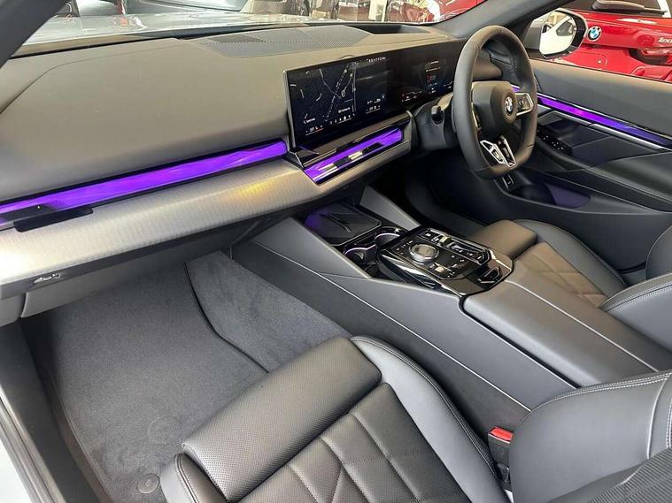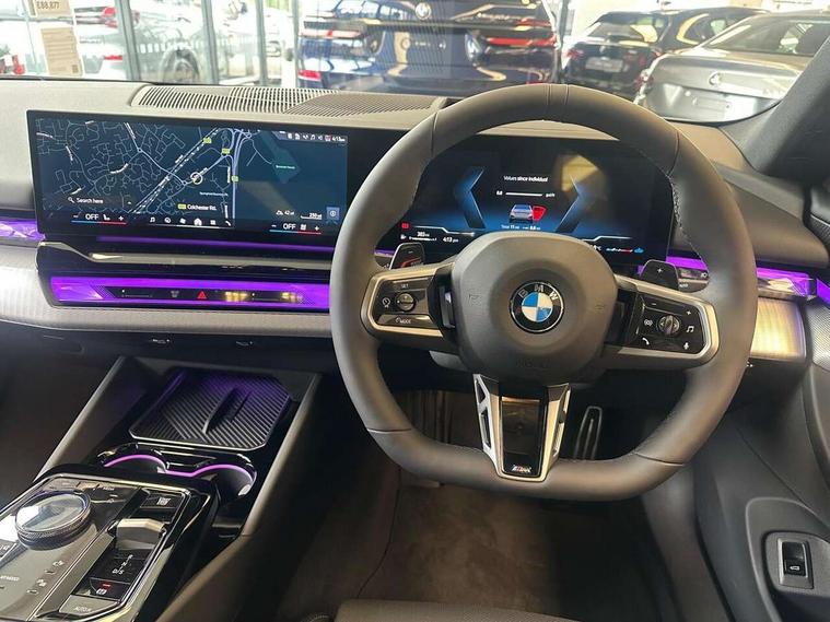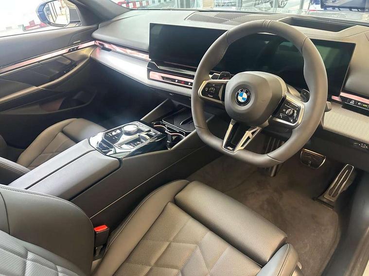 BMW ConnectedDrive online services, BMW legal emergency call, BMW Teleservices, Brake pad wear indicator, Cruise control with brake assist, Driving Assistant Plus Preparation, Front collision warning with brake intervention, Lane departure warning with active return, Left turn warning with brake function, Multifunctional instrument panel, Oil sensor for level and grade, On board computer inc. average speed, fuel consumption, liquid crystal Info display, journey computer, outside temperature display, personal profile, On-board diagnosis - OBD, PAS, Personal e-SIM, Powered by Operating System 7.0, Run flat indicator, Service interval indicator, Speed limit Info with manual speed limit assist, Stop/start button, 8 speed automatic steptronic transmission with gearshift paddles, DAB tuner, Acoustic glazing, Adaptive LED Headlights, Automatic cornering lights, Automatic windscreen wipers and automatic headlight, BMW selective beam, Body colour door handles, Body coloured bumpers, Dynamic brake lights with LED technology, Electric adjustable door mirrors, Electric front and rear windows with fingertip open/close + anti-trap facility and comfort closing function, Follow me home headlight function, Headlight elements in blue, Heated windscreen washer jets, LED daytime running lights, LED third brake light, Light colour close to that of ordinary daylight, Optimum, homogeneous illumination of the road, Rear boot, Rear side wing doors, 2 zone automatic air conditioning, 3 seat bench in 2nd row, 3 spoke leather M steering wheel in BMW M specific design with M badge, Armrest - front and rear integrated door trim, centre console includes storage compartment, rear centre includes 2 cupholders, Child seat ISOFIX attachment with rear outer seats includes top tether, Coat hook on upper B-pillar panel, Electric adjustable steering column, Electrically adjustable lumbar support for driver and front passenger, Heated driver and front passenger seats, High-gloss black door switch cluster, power window switch and tailgate button on first and second row seat, M Anthracite headlining, M Sport pedal covers in stainless steel, Rear headrests, Single front passenger seat, Through loading system with 40/20/40 rear seat backrest split, Velour floormats, Wireless charging tray, Ambient lighting pack - 5 Series/I5, Connected package professional - 5 Series/I5, Driving assistance pack - 5 Series/I5, Expanded exterior mirror package - 5 series/I5, M high gloss shadow line pack - 5 Series/ I5, M Sport exterior styling pack - 5 Series/I5, 3 rear three point seatbelts, Active protection, Airbag deployment is controlled with respect to the intensity and scope, Anti-lock braking system (ABS), Brake assist, Brake energy regeneration, Cornering brake control (CBC), Crash sensor activating central locking release, hazard warning lights, fuel cut off and interior lighting, Driver and front passenger airbags, Driver central airbag, Driver/front passenger side airbags, DSC - Dynamic Stability Control, Dynamic brake control, Dynamic Traction Control - DTC, Electromechanical parking brake with automatic drive away release and auto hold function, Electronic brake force distribution, Engine drag torque control, Front and rear brake discs with interior ventilation, Front and rear curtain airbags, Front head restraints with anti-whiplash, Head airbags for first and second row seats, Hill start assist, Locking of doors after driving off, M Sport brake in blue high gloss painted brake callipers with monochrome logo on front calliper, Mechanical child proof lock on rear doors, PC iBrake PostCrash approach control warning with light braking function, Side impact protection, Trailer stability control, Two tone horn, Tyre pressure monitoring system, Warning triangle and first aid kit, Alarm system, Locking wheel bolts including wheel bolt adapter, Tyre repair kit plus,