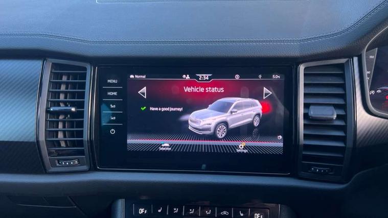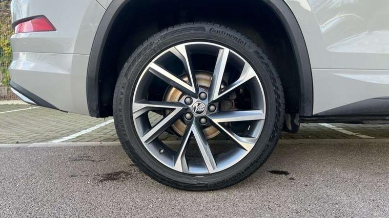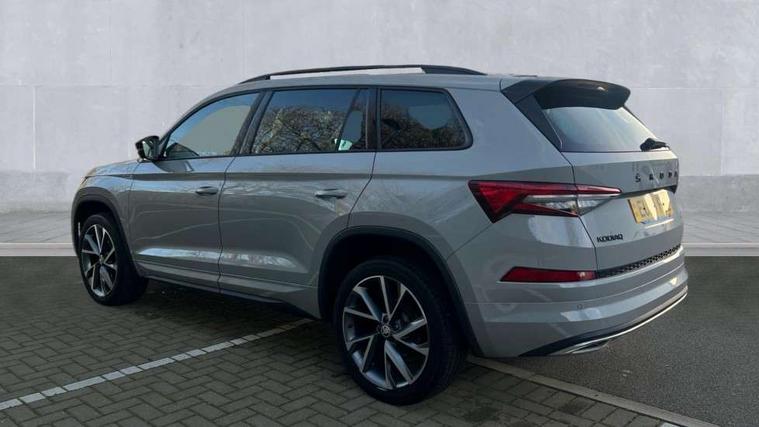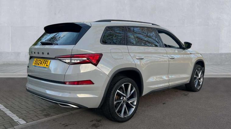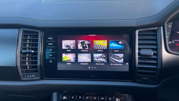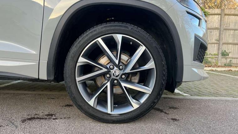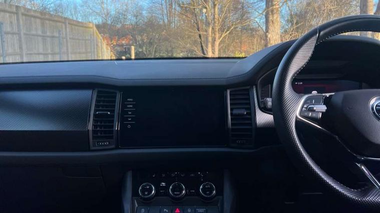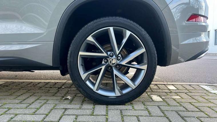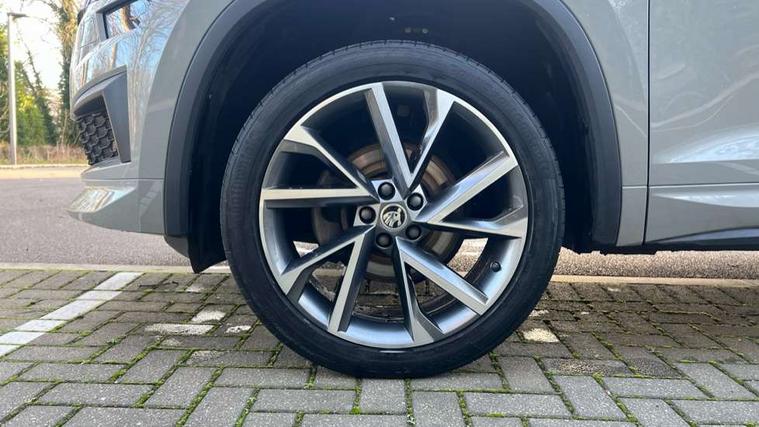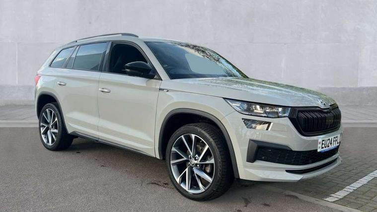 Bluetooth system, Columbus satellite navigation with 9.2" touchscreen, integrated Wi-Fi, web radio, Digital voice enhancement, e call+, ECO Stop/start function, Exterior temperature indicator, Progressive steering, Rear view camera, Smartlink wireless for apple carplay and wired for android auto, Speed limiter, Tailgate unlocking from outside, USB C Port x 2 in front centre console, Virtual Cockpit - 10.25" digital display with additional sports design, Wireless charging, 8 Speakers, DAB Digital radio, Aero front windscreen wipers with intermittent function, Aero rear window wiper, Auto dimming rear view mirror, Black roof rails, Black sports styling including front grille and window surrounds, Black wheel arch surrounds, Body colour bumpers, Body colour door handles, Electric adjustable/heated/folding door mirrors, driver side auto dimming with boarding sports and memory function, Electric front and rear windows, Extended rear spoiler with finlets in gloss black, Front fog lights, Full LED matrix headlights with AFS (adaptive front light system), cornering function and AWL (all weather lighting system), Gloss black door mirrors, Headlight washers, Heated rear window, Invisible tailpipe, LED daytime running lights, LED rear fog light, LED third brake light in rear spoiler, Light assistant (coming/leaving home/tunnel light), Off-road style lower front bumper element, Privacy glass, Rain and light sensors, Rear diffuser, Rear LED lights (high functionality) with welcome effect and dynamic indicators, Rear side wing doors, Safety reflectors on front and rear doors, Sportline badge on front fender, Sports front and rear bumpers including lower rear chrome strip, Tailgate lettering in Black, Window control switches with black trim, 12V socket in boot, 2 rails with 2 hooks, 2 seat bench in 3rd row, 3 seat bench in 2nd row, 3 spoke leather multifunction sports steering wheel with DSG paddles, 4 foldable roof handles with rear coat hooks, 60:40 foldable rear seat with sliding adjustment and backrest angle adjustment, Aluminium pedals, Black roof headlining, Bottle holders in door panel in the 1.5 litre front and 1 litre rear, Cargo storage compartments, Chrome headlight control button, Chrome interior door handles, Coat hooks on B pillar, Covered storage compartment on driver side, Decorative door sill covers, Front and rear door armrest with black adductor trim, Front centre armrest with storage compartment, cup holder and 12V socket, Front courtesy lights, Gear shift lever with chrome frame and black gloss insert, Grey stitching in front and rear armrests and door armrests + door inserts, Height adjustable front headrests, Illuminated glovebox, Illuminated luggage compartment, Isofix child seat fittings in outer rear seats with top tether, Manually adjustable steering column, Microsuede door panels, Net programme in boot (1x horizontal Net, 2x vertical Nets), Overhead glasses storage compartment, Pollen filter, Rear centre armrest with cupholders, Single front passenger seat, Sliding trunk cover, Small Bags on the inner sides of the front backrests, Sports seats, Sunvisors with illuminated vanity mirrors, Three rear height adjustable headrests, Ticket holder on A Pillar, Umbrella in door panel, Variable boot floor, LED Interior light pack - Kodiaq, Auto door release and activation of warning lights in the event of an accident, Driver and front passenger airbag with knee airbag and front passenger airbag deactivation, Electronic parking brake with hill start assist, Emergency rear braking signal, ESC (incl. ABS+MSR+ASR+EDS+HBA+DSR+RBS+MKB), Front assist with autonomous emergency braking, Front side airbags with curtain airbags, Fuel cut off safety device, Height adjustable front 3 point seatbelts + pretensioners, Hill hold control, Rear disc brakes, Safety vest holder in door, Seat belt reminder for all seats, Three point rear seat belts, Two tone horn, Tyre pressure monitor, Alarm with interior monitoring and tilt sensor with safe function, Anti-theft wheel bolts, Immobiliser, Keyless entry and start system (KESSY), Remote central locking with 2 keys, Black air vent surround, Carbon finish dashboard and door inserts, Grey stitching in dashboard, 20" Vega Anthracite alloy wheels, Temporary spare wheel (space saver),