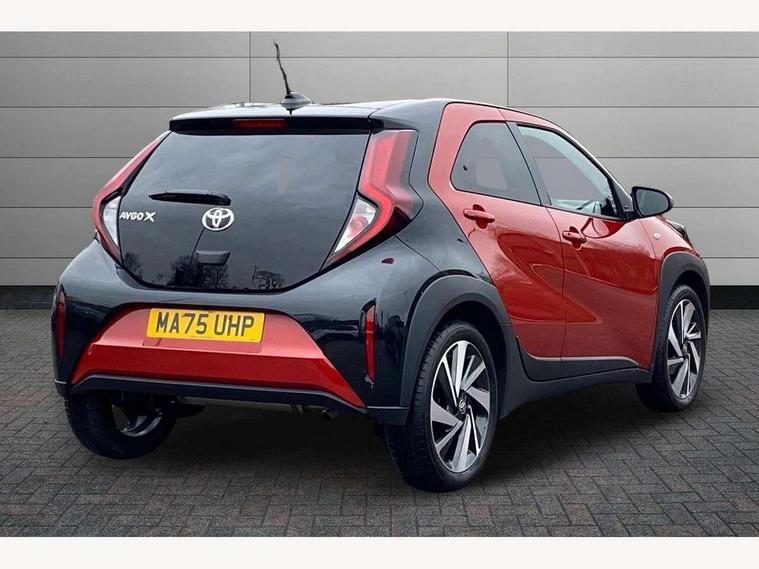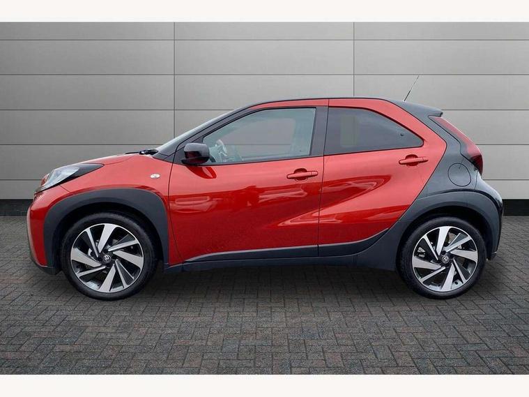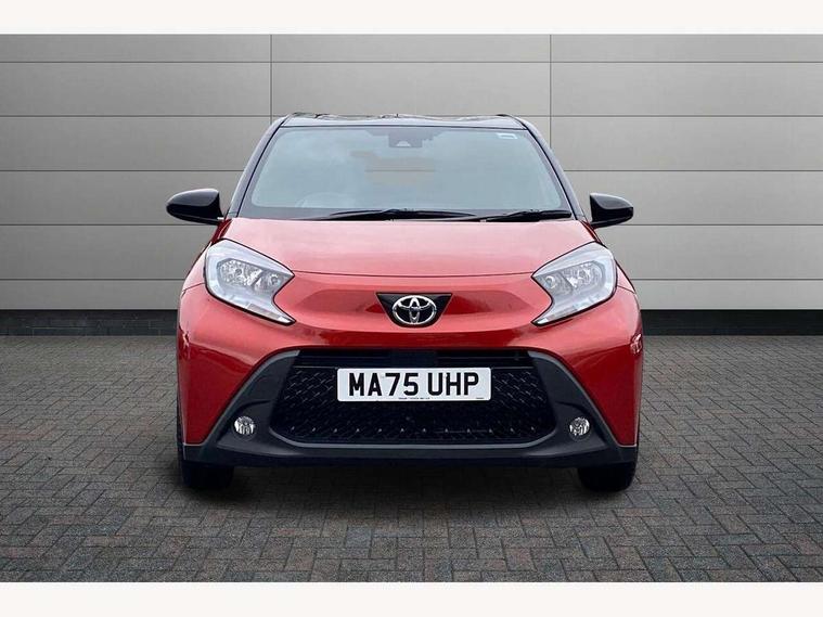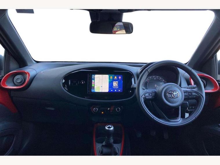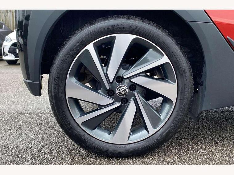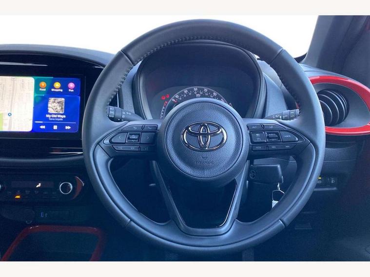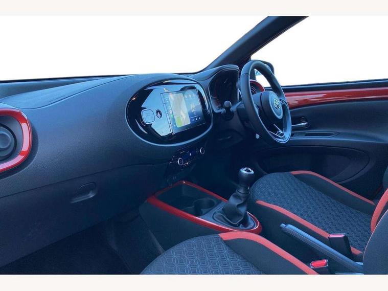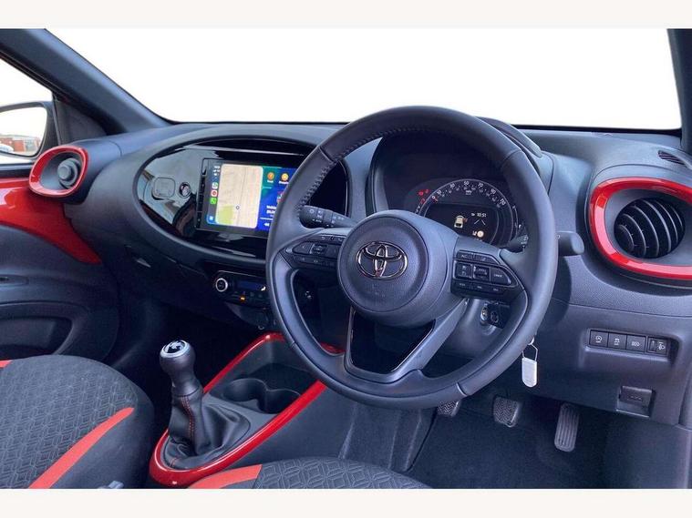 4.2" TFT colour screen, Adjustable speed limiter, Analogue speedometer, Bluetooth connectivity, Digital tachograph, Driver attention alert system, eCall emergency call system, Electric power steering, Intersection turn assist, Key reminder warning, Noise reduction kit, Pre collision system with emergency steering assist, Reversing camera with static guide lines, Smart phone integration with Apple car play/Android Auto, Speed limit display, Start and stop, Vehicle Stability Control (VSC), 4 speakers, 9" HD multimedia display touch screen with Toyota smart connect, DAB digital audio broadcast, USB connector, Auto headlights, Auto wipers, Automatic headlights cut-off, Bicycle towing hook, Black contrast roof, Black side protection mouldings, Black wheel arch mouldings, Body colour door handles, Body coloured front bumper, Boot door scuff plate, Eclipse black rear bumper, Electric heated door mirrors, Follow me home headlights, Front fog lights, Front power windows, Gloss black door mirrors, Gloss black upper front grille, Headlight cut-off reminder, LED daytime running lights, LED front light guide, LED High mounted stop lamp, Manual day/night rear view mirror, Manual headlight levelling, Pagoda roof, Power adjustable door mirrors, Power back door, Privacy glass, Projector halogen headlights, Rain sensor, Rear combination lights LED bulb type, Rear side wing doors, Rear windscreen defogger, Rear windscreen wiper, Short antenna, Variable intermittent windscreen wipers, 12v power outlet - front, 2 seat bench in 2nd row, 3 spoke leather steering wheel, 50/50 split folding rear seat, Adhesive roof headlining, Adjustable speed limiter switch on steering wheel, Audio and telephone switches on steering wheel, Auto air conditioning, Black insert on steering wheel, Black roof lining, Boot light, Centre room light, Chrome interior door handles, Chrome surround on air conditioning buttons, Clean air filter, Console box storage in body color, Fabric upholstery, Floor mats, Front and rear cup holders, Front head rest deco art, Front head restraints, Height adjustable driver seat, Intelligent adaptive cruise control switch on steering wheel, ISOFIX child restraint system on rear seats, Lane departure alert switch on steering wheel, Leather gearshift knob, Manual tilt steering wheel, Manually reclining and sliding driver seat, Manually reclining and sliding front passenger seat, Multimedia switches on steering wheel, Pollen filter, Rear door pockets, Rear head restraints, Satin silver insert on gear shift knob, Single compartment glovebox with lights, Single front passenger seat, Soft tonneau cover, Sun visors with mirror on driver and passenger side, Voice recognition switch on steering wheel, Toyota safety sense pack - Aygo X, Anti lock braking system + Electronic brake force distribution, Child safety door lock, Emergency brake light signal (EBS), Hill start assist control (HAC), Passenger airbag on/off switch, Seat belt reminder for front and rear seats, Supplement restraints system (SRS) - 6 airbags, Traction control, Tyre pressure warning system, Immobiliser, Remote power door locks, Black wheel centre caps, Tyre repair kit,