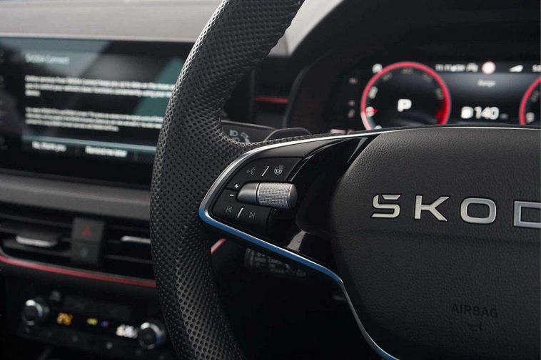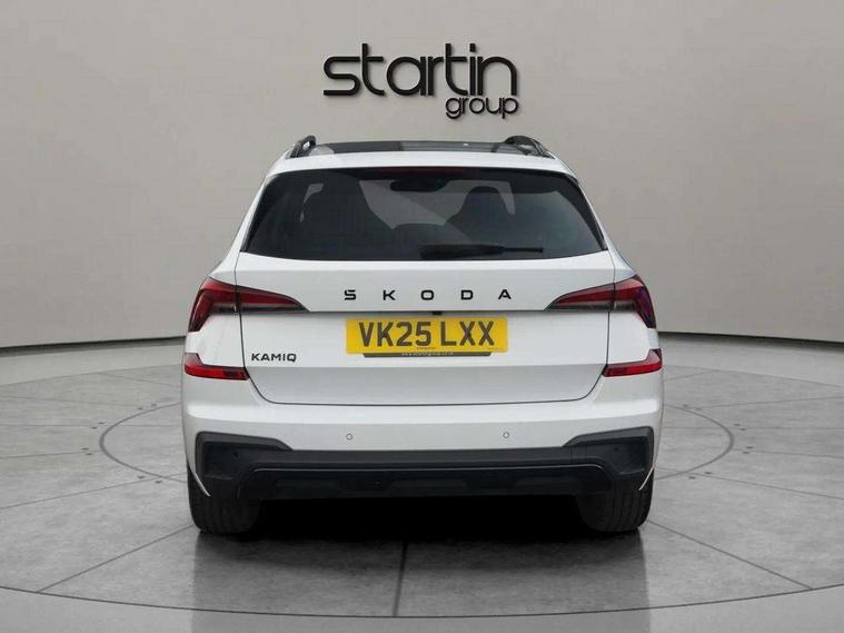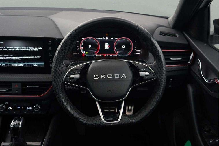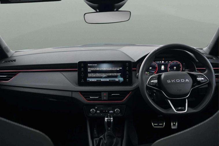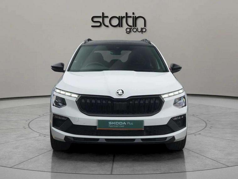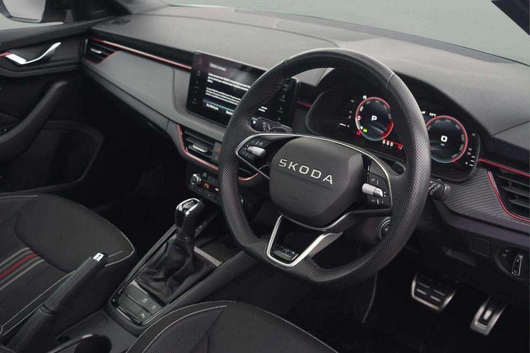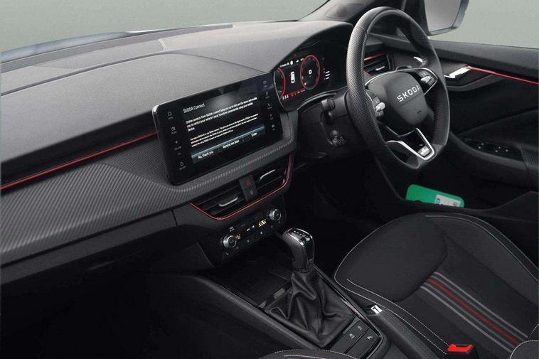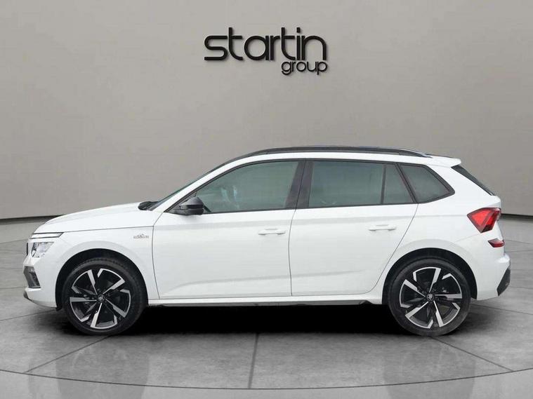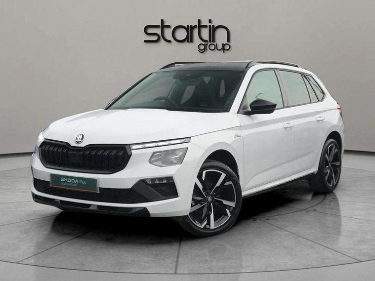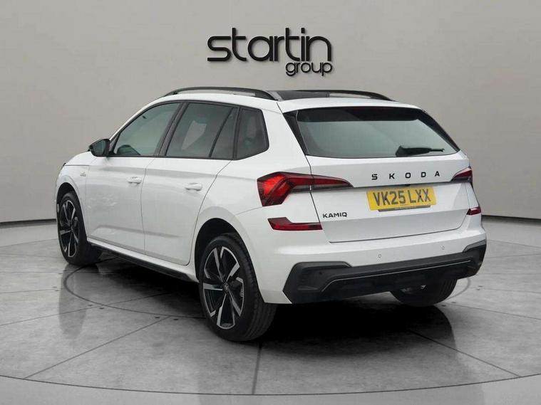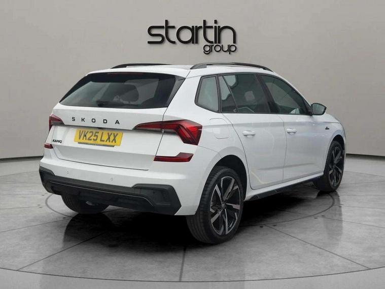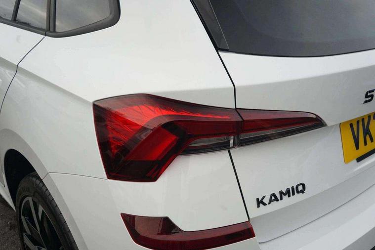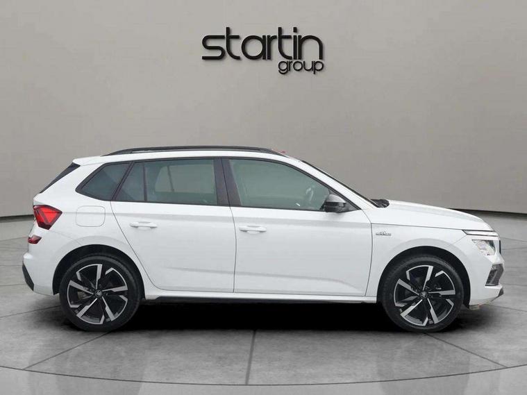 Advanced driver attention and drowsiness monitor, Bluetooth system, E-call, Front assist system, PAS, Rear parking sensors, Rear view camera, Service indicator, Speed limiter, Traffic sign recognition, Virtual cockpit with 10.25" display, Voice control system, Wireless smartlink, 4 USB C ports, 8 Speakers, 9.2" Skoda navigation display, DAB Digital radio, Auto dimming rear view mirror, Automatic headlight control with coming home and leaving home feature, Black door mirrors, Black radiator grille, Black rear diffuser, Black roof spoiler, Body colour bumpers, Body colour door handles, Boot lettering in black, Extended tailgate glass, Fixed panoramic sunroof with black roof rails, Front and rear electric windows, Heated rear window, LED daytime running lights, LED high beam, LED low beam, LED third brake light, Light sensors, Monte carlo plaque, Privacy glass, Rear side wing doors, Rear wiper, Ticket holder inside windscreen, 12V socket in luggage compartment, 3 seat bench in 2nd row, Aluminium pedals, Ambient lighting in white/red, Art leather carbon decor inserts, Art leather carbon door inserts, Black roof lining, Cargo elements, Chrome inner door handles, Driver and passenger sun visors with vanity mirror, Dual zone climate control, Front and rear roof lights, Front centre armrest, Front head restraints, Glove compartment with illumination, Height adjustable driver seat, Height adjustable front passenger seat, Ice scraper, Inner circulation control with pollen filter, ISOFIX on front passenger seat, Isofix preparation for back seats, Leather gearknob and handbrake lever, Manual lumbar support for front seats, Monte Carlo cloth upholstery, Net package and top tether hooks in boot space, Net under rear shelf, Pocket on the back of both front seats include mobile phone pockets, Rake/reach adjustable steering wheel, Reading lights, Rear centre armrests, Red hotstamping, Single front passenger seat, Sports seats, Textile floor mats, Third rear headrest, Top tether for front passenger seat, Umbrella in driver's door, Light and view plus package - Kamiq, 3x3 point rear seatbelts, Airbags - driver and front passenger, Disc brakes, ESP, Extended and predictive pedestrian/cyclist protection, Front passenger airbag deactivation switch, Front side airbags with curtain airbags, Hill hold control, Manual leather parking brake, Manual rear child locks, One tone horn, Seatbelt reminder for driver an co-driver, Traction control, Tyre pressure monitor, Anti-theft alarm system with interior monitoring, backup horn, towing protection and remote central locking with SAFE system, Anti-theft wheel bolts, Electronic engine immobilizer, 18" Ursa black diamond cut alloy wheels,