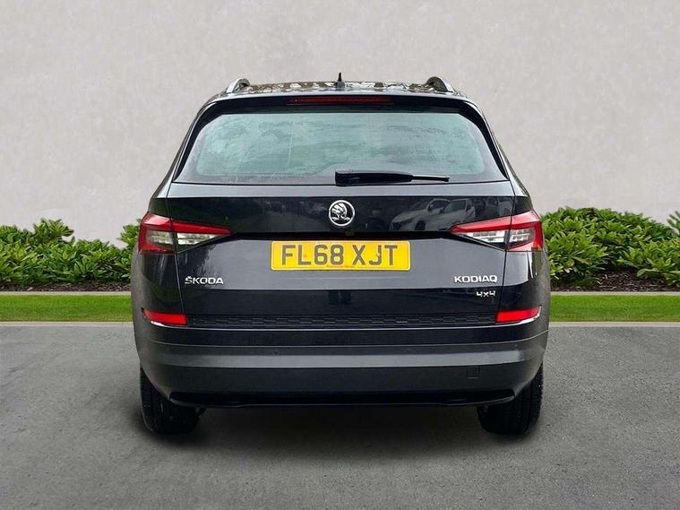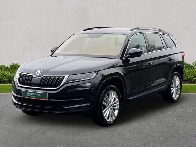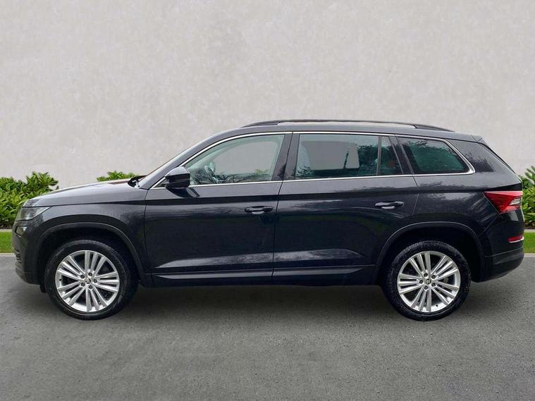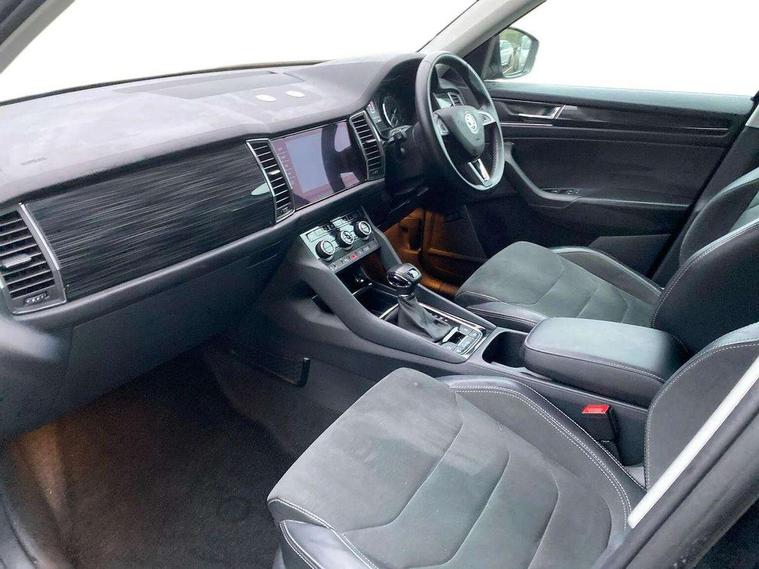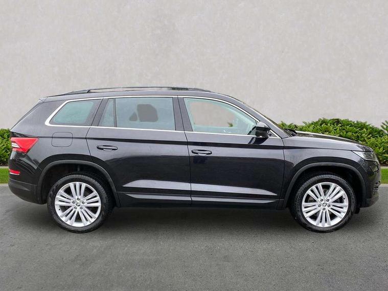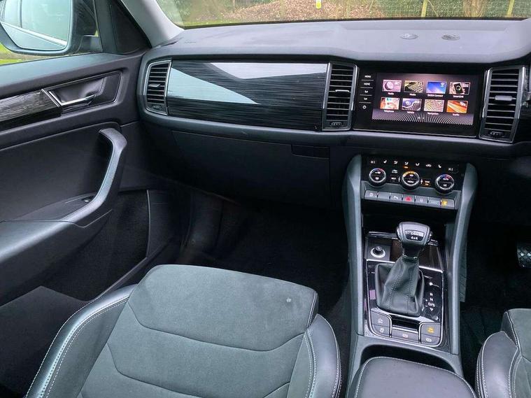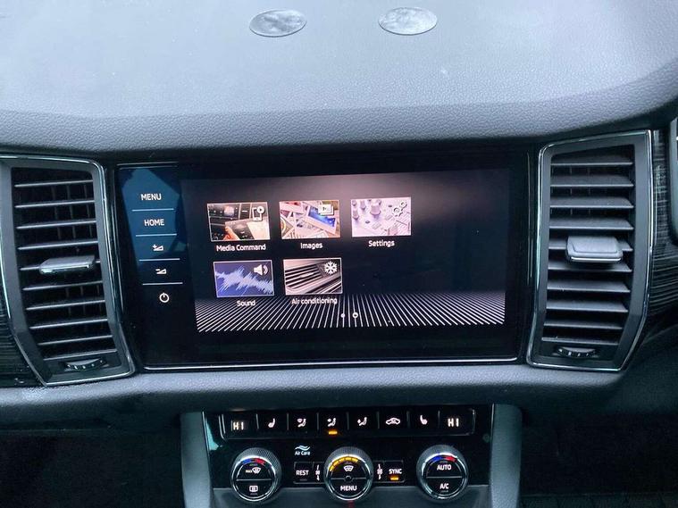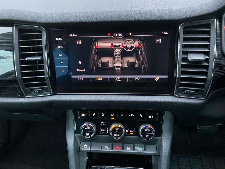 Bluetooth system, Columbus satellite navigation with 9.2" touch screen and integrated Wi-Fi + WLAN, Digital voice enhancement, ECO Stop/start function, Exterior temperature indicator, SmartLink plus, Speed limiter, Tailgate unlocking from outside, Bolero Radio, DAB Digital radio, DVD System, USB and SD card connectivity, Aero front windscreen wipers with intermittent function, Aero rear window wiper, Auto dimming rear view mirror, Automatic activation of hazard warning lights, Black wheel arch surrounds, Body colour bumpers, Body colour door mirrors and handles, Electric front and rear windows, Electrically adjustable heated foldable and auto dimming door mirrors with boarding spots, Front and Rear door steps, Full LED Headlights with adaptive front light system and LED daytime running lights, Headlight washers, Heated rear window, Invisible tailpipe, LED front fog lights with static cornering light function, LED rear fog light, LED third brake light in rear spoiler, Light assistant (coming home/tunnel light), Radiator grille frame in matt black with chrome strip, Rain and light sensors, Rear spoiler, Safety reflectors on front and rear doors, Sunset privacy glass, Tinted windows, 12V socket in boot, 2 rails with 2 hooks including 4 hooks for net programme, 4 foldable roof handles with rear coat hooks, 4 lashing points on luggage floor, 60:40 foldable rear seat with sliding adjustment and backrest angle adjustment, Bottle holders in door panel in the 1.5 litre front and 1 litre rear, Cargo storage compartments, Centre console with open storage box, cup holder and 12V socket, Chrome headlight control button, Chrome interior door handles, Coat hooks on B pillar, Covered storage compartment on driver side, Drawers under driver and front passenger seats, Front centre armrest with storage compartment, Front/rear courtesy lights, Gear shift lever with chrome frame and black gloss insert, Height adjustable front headrests, Illuminated and cooled glovebox, Illuminated luggage compartment, Isofix system on outer rear seats, Manually adjustable steering column, Net programme in boot (1x horizontal Net, 2x vertical Nets), Overhead glasses storage compartment, Passenger side net compartment on centre console, Pollen filter, Rear centre armrest with cupholders, Removable lamp in luggage compartment, Roll up luggage compartment cover with intermediate position, Small Bags on the inner sides of the front backrests, Small pockets on the inner side of the front backrests, Storage compartment in lower middle Instrument panel, illuminated with closing, Sunvisors with illuminated vanity mirrors, Three rear height adjustable headrests, Ticket holder on A Pillar, Umbrella in door panel, Chrome pack - Kodiaq, Auto door release and activation of warning lights in the event of an accident, Driver and passenger airbags, Electronic parking brake with hill hold control, Emergency rear braking signal, ESC (incl. ABS+MSR+ASR+EDS+HBA+DSR+RBS+MKB), Front and rear three point safety belt on all seats, Front assist includes AEB city/urban, Front side airbags, Fuel cut off safety device, Head and knee airbags, Passenger airbag deactivate switch, Rear disc brakes, Safety vest holder in door, Seat belt reminder for all seats, Two tone horn, Tyre pressure monitor, Warning lights in front doors, Alarm with interior monitoring and tilt sensor with safe function, Immobiliser, Keyless entry and start system (KESSY), Remote central locking,