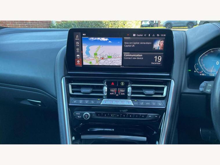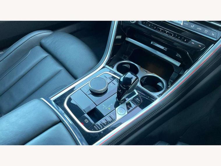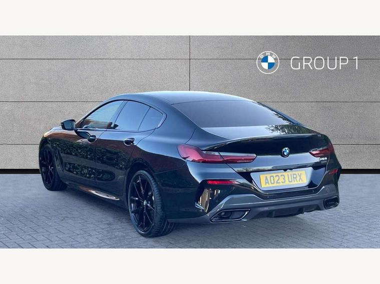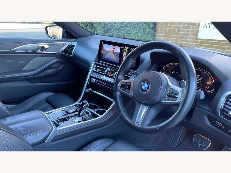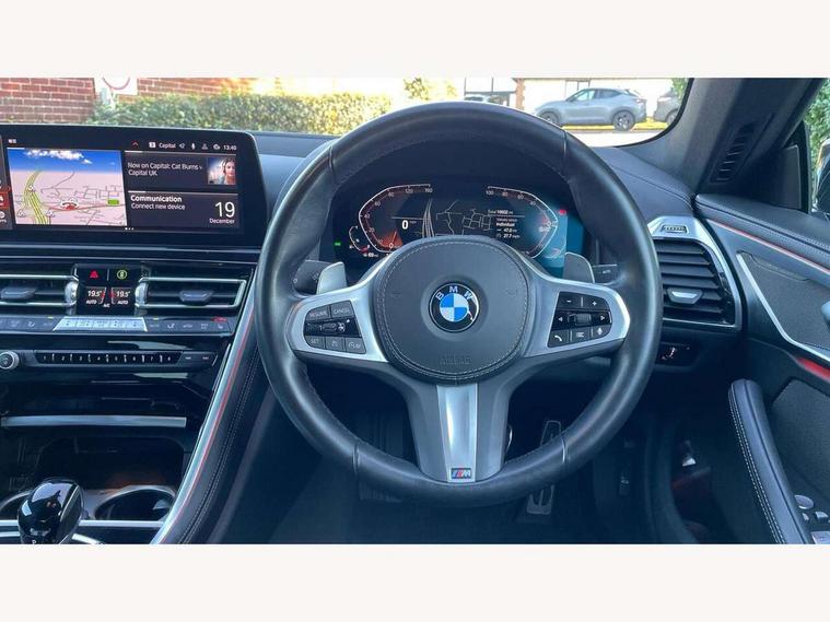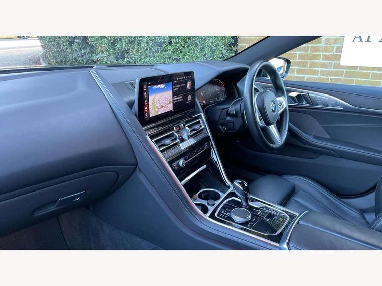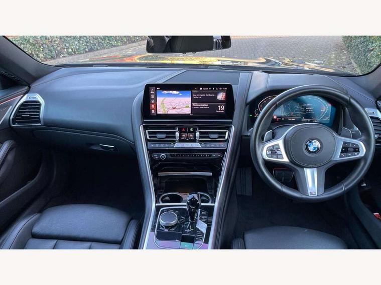 Automatic tailgate operation, remote opening with key, closing by tailgate button or remote control including tailgate in LED technology, Bluetooth hands free facility with USB audio interface, voice control and enhanced bluetooth + Wireless charging, BMW ConnectedDrive online services, BMW legal emergency call, BMW Teleservices, Brake pad wear indicator, Check control system, Condition based service, Drive experience control with Sport, Comfort, Eco Pro and Adaptive modes, Electric bootlid, Head up Display, iDrive controller with shortcut buttons, Instrument and upper door panel in walknappa leather, Integrated owners handbook, Light on warning, Oil sensor for level and grade, On board computer, Outside temperature display, Run flat indicator, Service interval indicator, Servotronic system, Speed limiter, Wi-Fi hotspot, Adaptive M suspension, Double wishbone front axle, Dynamic Damper Control, Eight speed sport automatic transmission, M Sport differential, Petrol Particulate Filter, Sport exhaust system, DAB Digital radio, Favourite buttons, Air breather inlay in pearl chrome, frame in black high gloss, Automatic windscreen wipers and automatic headlight, Carbon core, Climate comfort windscreen, Daytime driving lights front and rear active, Dynamic brake lights, Exterior mirrors - Floating design mirror, electric adjust/heated/folding, aspherical, Follow me home headlight function, Frameless interior mirror, Front and rear bumper system with replaceable deformation elements, Front electric windows, Front ornamental grille with kidney grille bars, Heat protection, sun protection glazing, Heated rear window, glass, Heated windscreen washer jets, High beam assistant, Illuminated door handles, Illuminated radiator grille iconic glow, LED rear lights, M emblem on front side panel in light chrome, Model logo on right tailgate, Radiator grille frame in pearl chrome, Radiator grille struts in aluminium matt, Rain sensor and automatic driving lights control, Rear boot, Rear side wing doors, sDrive designation on left tailgate, Sun protection glass, Thermally insulated windscreen, Third LED technology brake light in rear window, Welcome lights in interior and door handle area, Window frame and mirror base in black high gloss, 2 cup holders in front, 2 rear head restraints, 2 X front 12v power sockets, 3 spoke M sport leather multifunction steering wheel with shift paddle, 4 zone control automatic air conditioning, 5 seats, 50/50 split folding rear seat, Ambient light with dynamic interior light, BMW ID, Front and rear seat heating, Front centre armrest with light, 12V socket and USB and storage compartment, Front door pockets, Front entry lights doors, Front reading lights, Front sun visors with ticket holder and illuminated mirror, Interior lighting - Interior light front centre above interior mirror, luggage compartment light, automatic interior light system soft on/soft off, Lashing eyelets, Lockable glove compartment with light, Microfilter and active carbon filter, Steering column with adjustable height and length and activation via control on the steering column, Through loading function, BMW Live cockpit professional pack - 8 Series, Connected professional pack - 8 Series, Exterior items pack - 8 Series, M sport exterior styling aerodynamics pack - 8 Series, 18" M Sport braking system with blue painted brake calipers, 3x3 point rear seatbelts, ABS/EBD, Active protection, Airbags - Driver and front passenger airbag with seat occupancy detection, knee, side and front passenger seat airbag deactivation, Brake discs, compound structure, Child locks on rear doors, Cornering brake control (CBC), Crash sensor activating central locking release, hazard warning lights, fuel cut off, interior lighting, safety battery terminal clamp and airbags, DSC - Dynamic Stability Control, Dynamic brake control, Dynamic Traction Control - DTC, Electromechanical parking brake with automatic drive away release and auto hold function, Front three point with pyrotechnical belt latch tensioner seat belts, belt force limiter and belt stopper, Head airbags for 1st and 2nd seat row, Hill start assist, Integrated brake system, ISOFIX child seat mounting for the two outer rear seats, Rear three point with pyrotechnical belt latch tensioner seat belts and belt force limiter, Side impact protection, Tyre pressure monitoring system (TPMS), Warning triangle and first aid kit, Alarm system (Thatcham 1) with electronic engine immobiliser, Centre lock switch, Closing system with central locking, Comfort access system, Keyless entry with start/stop button, Locking wheel bolts, Vehicle key with exclusive M designation,