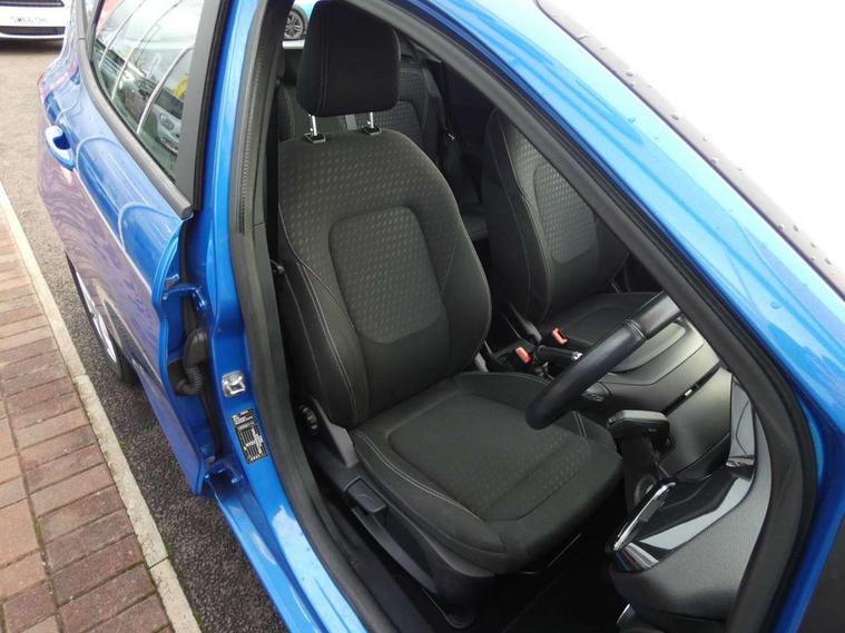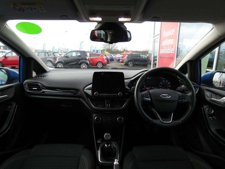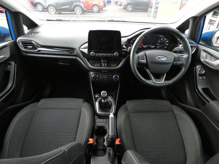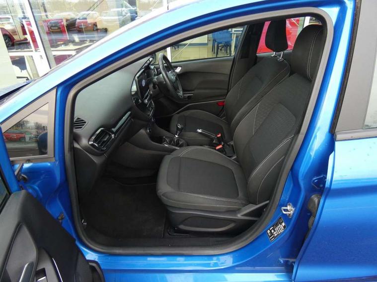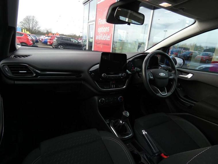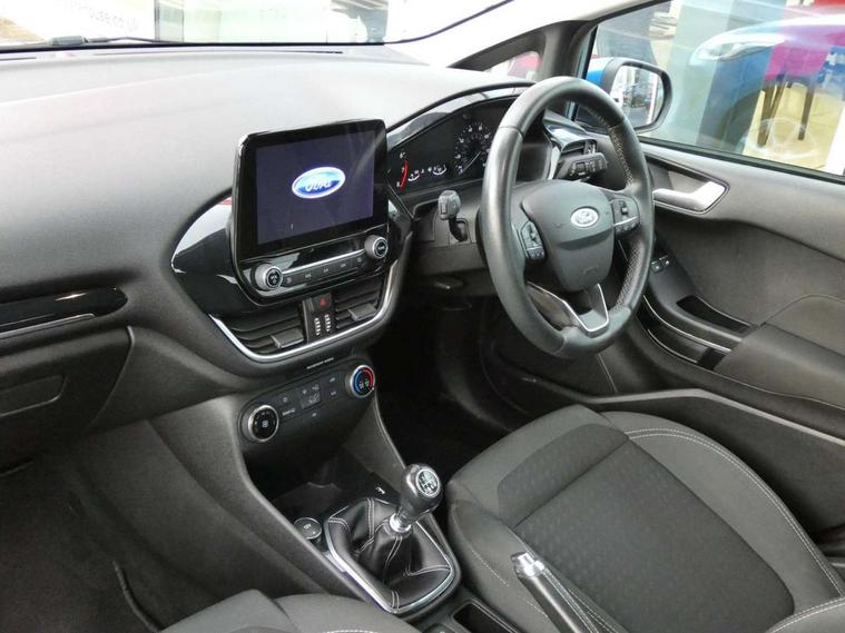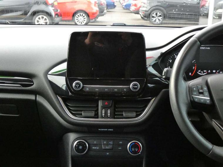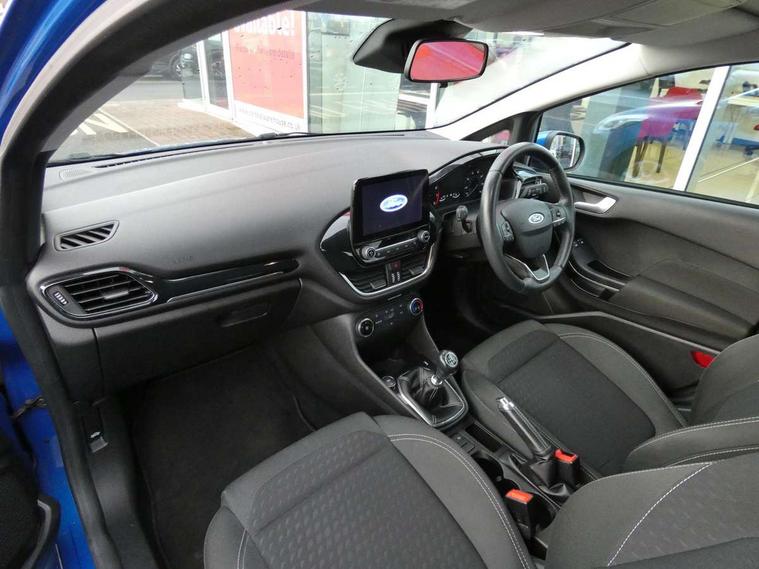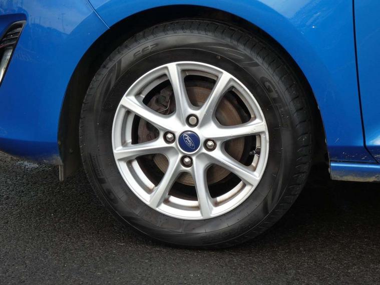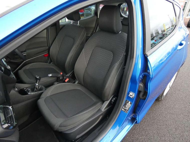 Bluetooth system, Electric power steering, Ford easy fuel, Trip computer, 2 USB ports, Auxiliary input socket, DAB Digital radio, Steering wheel mounted controls, Automatic headlights, Body colour bumpers, Body colour door handles, Body colour electric adjustable heated door mirrors with integral indicators, Body colour rear spoiler, Chrome beltline trim, Cornering front fog lights, Electric front windows/one touch facility, Halogen projector style headlights with static cornering lights + LED daytime running lights, Quickclear heated windscreen, Rear wiper, Tinted glass, Upper front grille chrome surround, 12V Accessory socket in centre console, 3 spoke leather trimmed steering wheel with audio control, 60/40 split folding rear seat, Adjustable head restraints, Boot carpet, Chrome inner door handles, Cloth upholstery, Footwell illumination, Front map reading lights, Front seat and rear pockets, Height adjustable driver's seat, Illuminated glovebox, Leather gear knob, Leather trimmed handbrake handle, Load area light, Luxury woven headliner, Manual air conditioning, Overhead console with sunglasses holder, Pollen filter, Rake/reach adjustable steering wheel, Rear centre head restraint, NCAP Pack - Fiesta, 3 point seatbelts on all rear seats, ABS+EBA, Curtain airbags, Driver and passenger airbags, Drivers knee airbag, Electronic stability control with hill start assist, Front passenger airbag deactivation, Front side airbags, Seatbelt warning, Tyre pressure monitoring system, MyKey system, Remote central locking & engine immobiliser, Thatcham Cat.1 alarm,
