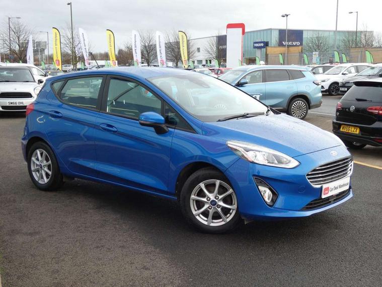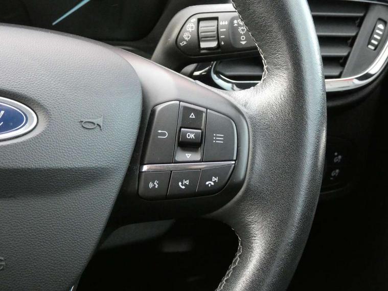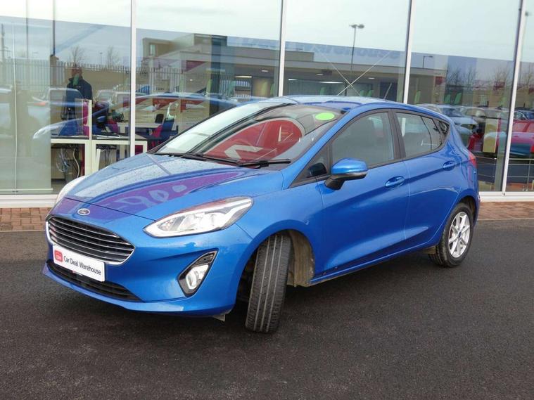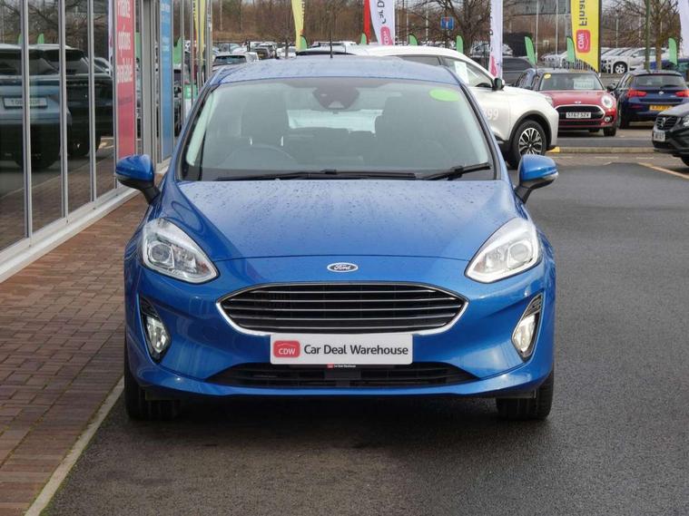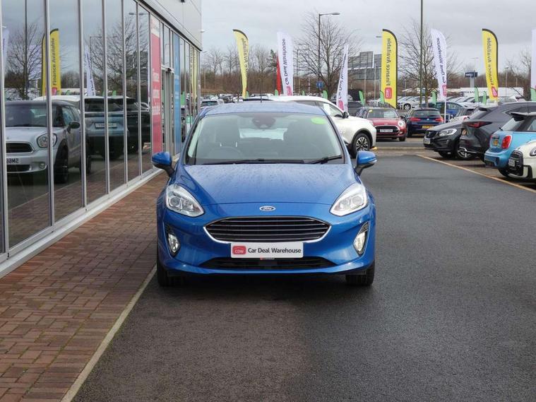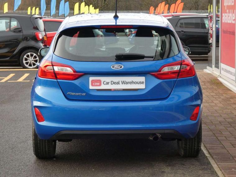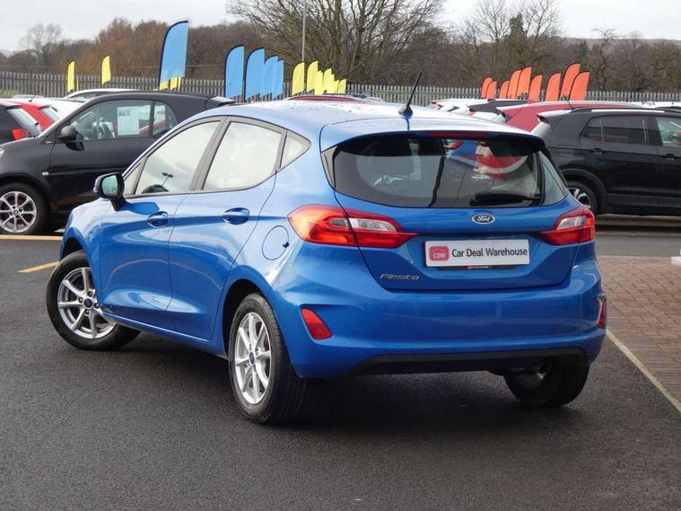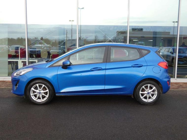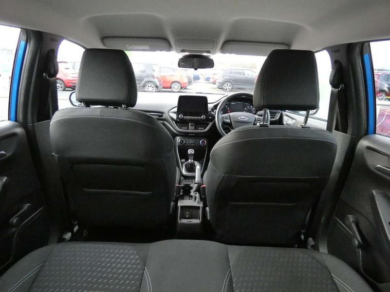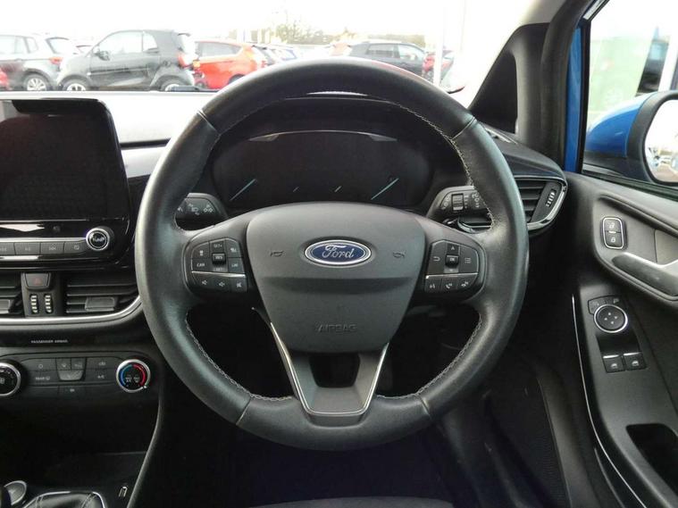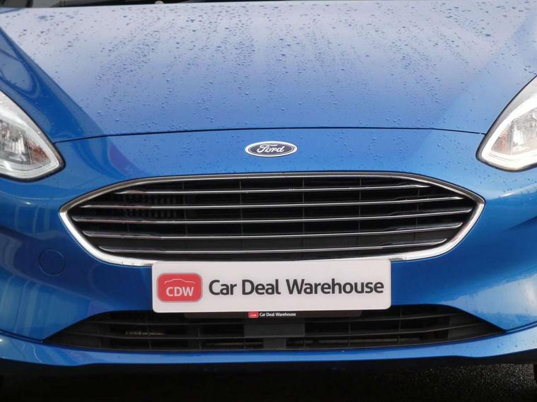 Bluetooth system, Electric power steering, Ford easy fuel, Trip computer, 2 USB ports, Auxiliary input socket, DAB Digital radio, Steering wheel mounted controls, Automatic headlights, Body colour bumpers, Body colour door handles, Body colour electric adjustable heated door mirrors with integral indicators, Body colour rear spoiler, Chrome beltline trim, Cornering front fog lights, Electric front windows/one touch facility, Halogen projector style headlights with static cornering lights + LED daytime running lights, Quickclear heated windscreen, Rear wiper, Tinted glass, Upper front grille chrome surround, 12V Accessory socket in centre console, 3 spoke leather trimmed steering wheel with audio control, 60/40 split folding rear seat, Adjustable head restraints, Boot carpet, Chrome inner door handles, Cloth upholstery, Footwell illumination, Front map reading lights, Front seat and rear pockets, Height adjustable driver's seat, Illuminated glovebox, Leather gear knob, Leather trimmed handbrake handle, Load area light, Luxury woven headliner, Manual air conditioning, Overhead console with sunglasses holder, Pollen filter, Rake/reach adjustable steering wheel, Rear centre head restraint, NCAP Pack - Fiesta, 3 point seatbelts on all rear seats, ABS+EBA, Curtain airbags, Driver and passenger airbags, Drivers knee airbag, Electronic stability control with hill start assist, Front passenger airbag deactivation, Front side airbags, Seatbelt warning, Tyre pressure monitoring system, MyKey system, Remote central locking & engine immobiliser, Thatcham Cat.1 alarm,