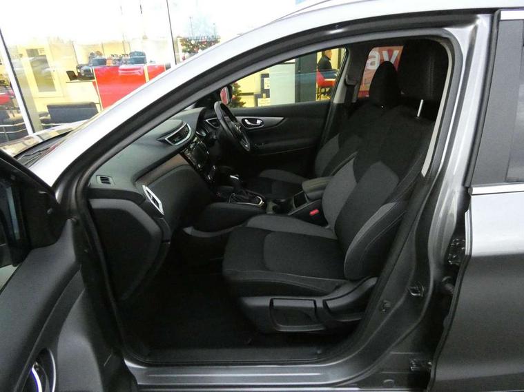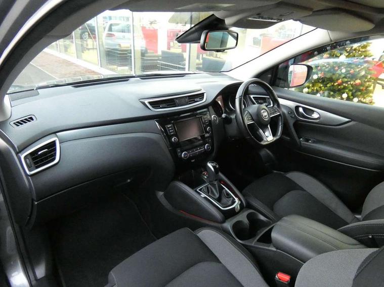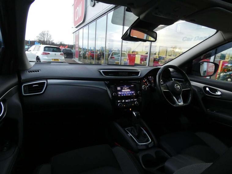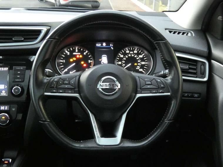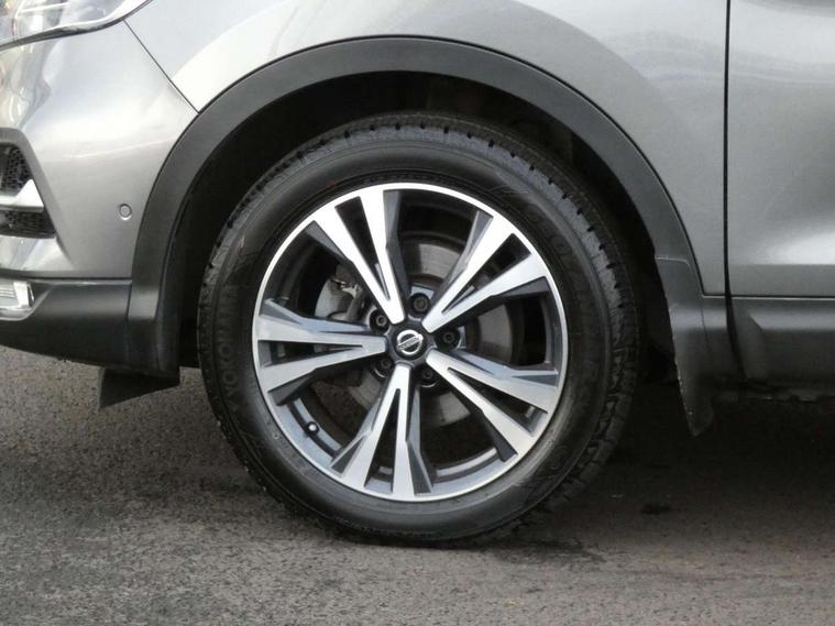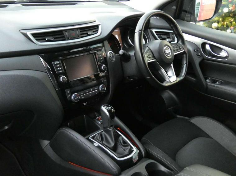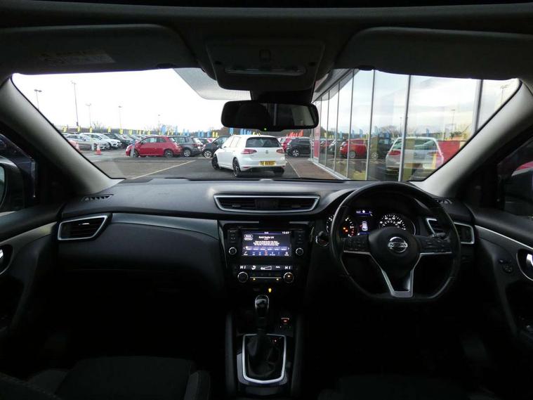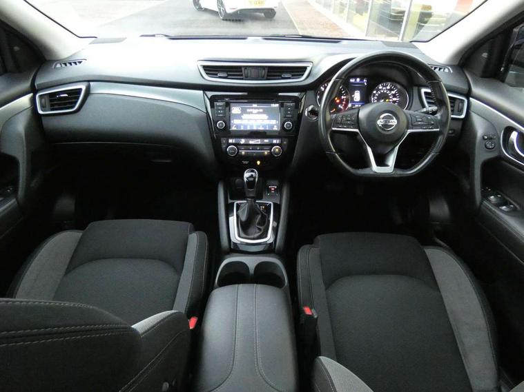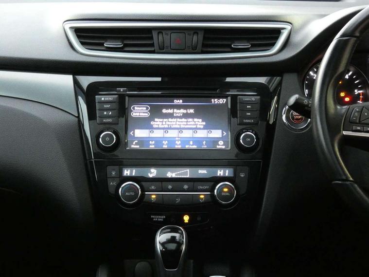 Advanced drive assist display 5'' TFT coloured screen, Android Auto, Apple CarPlay preparation, Bluetooth connectivity, Cruise control + speed limiter, Electric speed sensitive power steering, Front parking sensors, Intelligent around view monitor, Intelligent parking assist, Lane departure warning system, Nissan connect evo 7" touchscreen navigation and entertainment system, Normal or sport selectable steering, Outside temperature sensor, Push button starter, Rear parking sensors, Rear view camera, Service interval indicator, Smartphone integration, Stop/start system, Tomtom connected services, Traffic sign recognition, Trip computer, Voice control system, Diesel particulate filter, Nissan chassis control (intelligent ride control, intelligent trace control, intelligent engine brake), 6 speakers, AM/FM radio, CD audio system, Aux-in socket, DAB Digital radio, Steering wheel mounted audio controls, USB port, Anti dazzle rear view mirror, Auto wipers, Body colour bumpers, Body coloured door handles, Body coloured door mirrors, Chrome window surround, Daytime running lights dip function when turn signal applied, Electric folding door mirrors, Electric front and rear windows with one touch illuminated window controls, Electric front/rear windows, Electrically adjustable door mirrors, Front fog lights, Heated door mirrors, High beam assist, Intelligent auto headlights, LED indicators in door mirrors, Matt silver roof rails, Privacy glass, Rear roof spoiler, Rear wiper with reverse link, Shark fin antenna, Underbody vortex generators, 2 X front 12v power sockets, 3 height adjustable rear headrests, 60/40 split folding rear seat, Ambient lighting in centre console, Boot lighting, Centre console storage box/armrest, Chrome interior door handles, Cloth upholstery, Configurable luggage board system, Driver's seat manual height adjust, Dual zone climate control, Front and rear door pockets with bottle holders, Front and rear seat belt pre-tensioners with load limiters, Height adjustable front headrests, Leather D shaped steering wheel, Leather gear lever, Leather knee pad, Manual height adjustable front passenger seat, Manual lumbar support on driver seat, Manual lumbar support on passenger seat, Monoform front seats with plastic backboard, Parcel shelf stow function under luggage board, Pollen filter, Rear armrest with 2 cupholders, Synthetic leather wrapped door handle with contrasting stitching, Tilt/telescopic adjustable steering wheel, Safety shield plus pack - Qashqai, 6 airbags - Driver, front passenger, curtain and side airbags, ABS, ESP, EBD and brake assist, Auto hold function, Child locks on rear doors, Electronic parking brake, Front and rear seat belt warning, Front passenger airbag deactivation, Height adjustable front seatbelts, Hill start assist, Intelligent emergency braking with pedestrian recognition, Three 3 point rear seatbelts, Tyre pressure monitoring system, Anti-theft immobiliser, Intelligent Key, Remote central locking, Thatcham Cat.1 alarm, Carbon graphite dash trim, Tyre puncture repair kit,