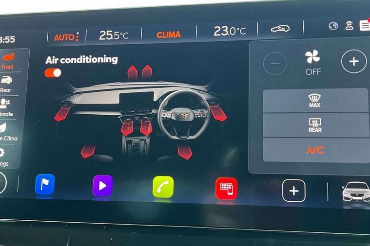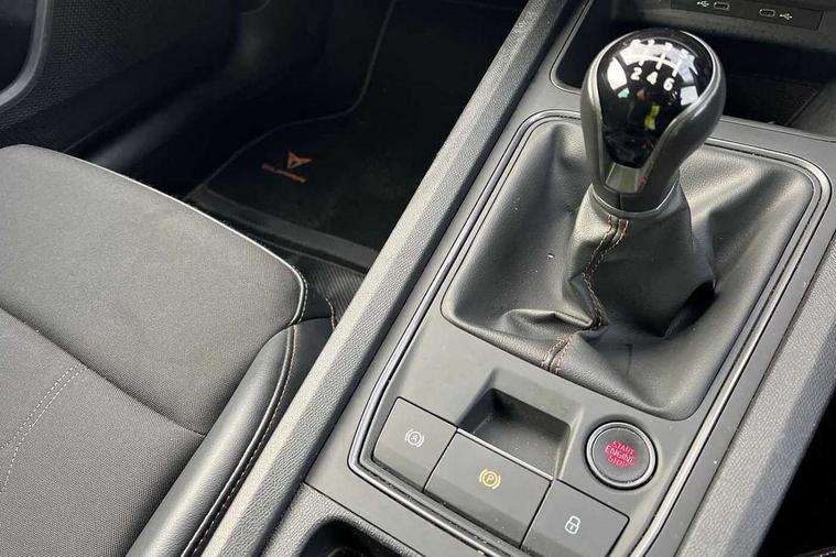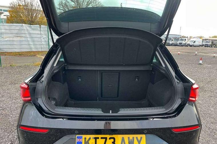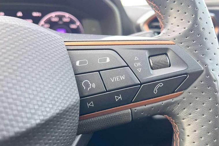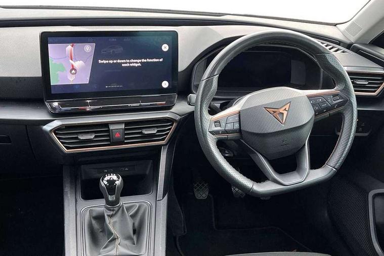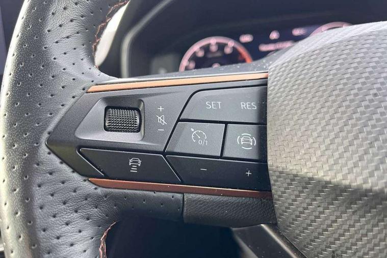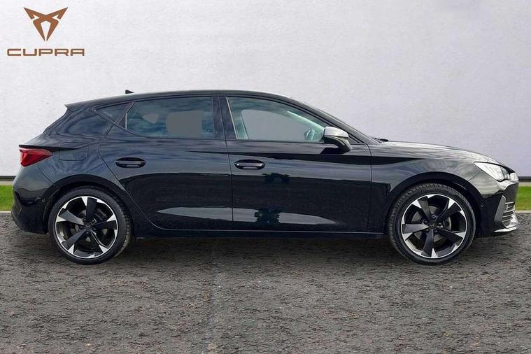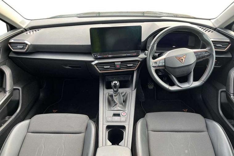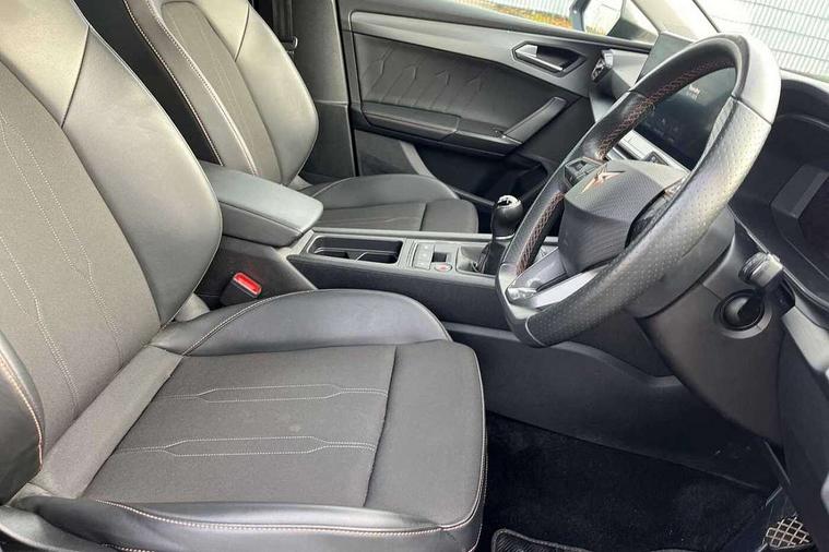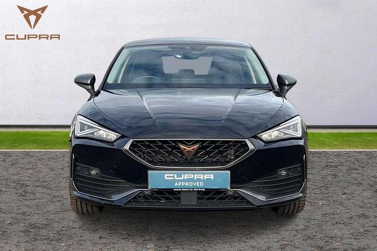 CUPRA drive profile selection with (Comfort/Sport/Individual), throttle response and gearshift mode, Digital cockpit, E-call, Electro mechanical speed sensitive power steering, Four x USB Type C ports (2 in front and 2 in rear), Front assist with forward collision warning braking reaction to vehicles, pedestrians and cyclists, Full link smartphone integration with Mirror Link, wireless Apple CarPlay and wired Google Android Auto, Lane assist, Lockable tailgate, Park assist (inc front/rear parking sensors), Rear view camera, RPM, trip computer, outside temp gauge, instrument light brightness, low fuel warning light, lights on reminder, gearshift indicator, Service interval indicator, Start/stop system with regenerative braking, Wireless phone charger, Sports suspension, Auxiliary input socket, Auto dimming rear view mirror, Body colour door handles, Body coloured bumpers, Cupra sports bumpers, Dark tinted rear windows, Electric front/rear windows, Electrically adjustable, heated and folding door mirrors, LED front fog lamps with cornering function, LED headlights with dynamic turn signals, tail lights, rear fog lights with rear coast to coast lighting, Rain sensing wipers, Rear diffuser with twin exhaust pipe on each side, Rear side wing doors, Rear wash/wipe, Separate daytime running light with automatic headlight control and coming home feature, Third brake light, 12v power supply in centre console, 3 seat bench in 2nd row, 5 headrests, 60/40 split rear bench seat with armrest, Ambient lighting with glovebox, footwell and single monocolour, Cupra Leather flat bottomed, perforated steering wheel, Driver/passenger manual seat height adjustment, Folding boot cover, Front and rear reading lights X 4, Front centre armrest, Front seats manual lumbar adjustment, Grey headlining, Height/reach adjust steering wheel, Illuminated interior front door sills, ISOFIX points in outer rear seats with top tether anchorage points, Jack and tool kit, PVC/Cloth upholstery with copper stitching, Single front passenger seat, Sports seats, Sunvisors with illuminated mirror, Three zone climate control, Media system plus with navigation pack - Leon Cupra, Safety and driving pack (M) - Cupra leon, 3 point seatbelts on all rear seats, ABS, Brake control system - ESC and brake booster, Child proof door locks, Cupra black brake calipers, Driver and front passenger airbags with front passenger airbag de-activation, front side and curtain airbags, Electronic parking brake, Extended safety system - seat belt tensioner, window closure and hazard lights, Hill hold control, Rear disc brakes, Seat belt reminder for front and rear seats, Tiredness recognition system, Tyre pressure monitoring system, Anti theft alarm system with interior monitoring in cab, backup horn and towing protection, KESSY Advanced - Keyless start, keyless entry, Locking wheel bolts, Chrome and copper interior detailing, 18" Machined sport black and silver alloy wheels with 92Y tyres,