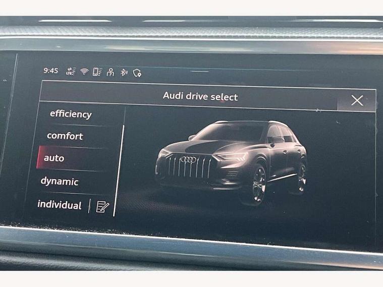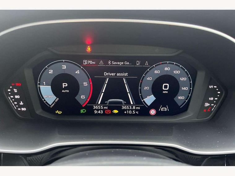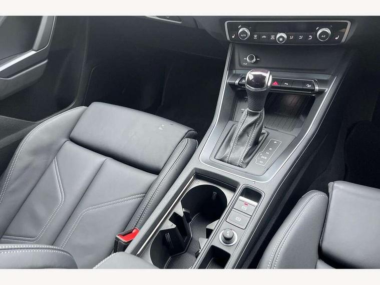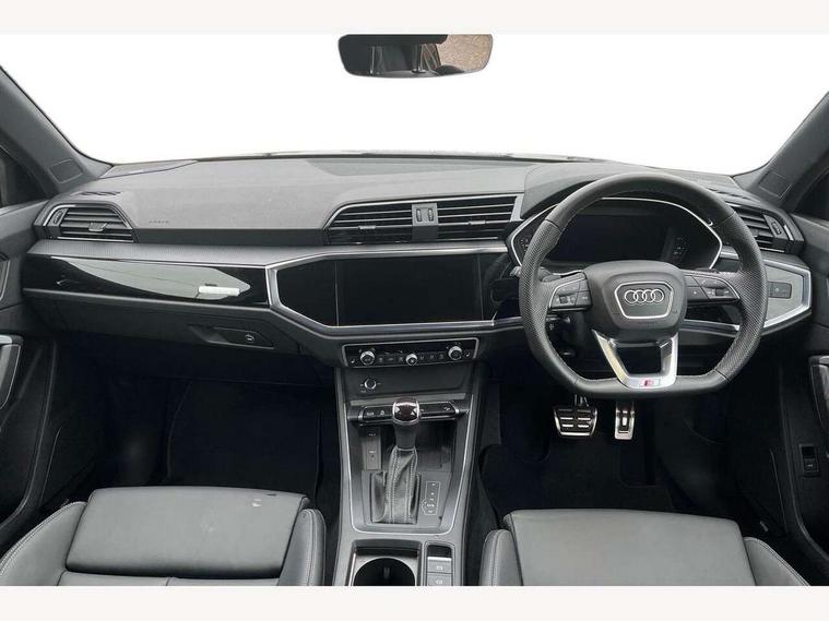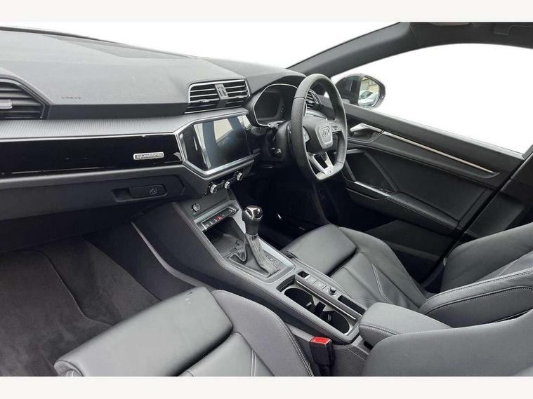 Amazon alexa Integration, Audi connect safety and service, Audi drive select, Audi lane departure warning, Audi Virtual Cockpit - 10.25" display, Bluetooth interface, Camera based traffic sign recognition, Distraction and Fatigue warning, Legal emergency call, MMI Navigation Plus with high resolution 10.1 inch touchscreen colour display, Power operated tailgate, Progressive steering, Service interval indicator, Smartphone interface includes wireless Apple carplay/Android Auto, Start stop system with recuperation, Voice control system with natural language interaction, Diesel particulate filter, Sports suspension, 2 USB-C ports with charge and data functions, 6 passive loudspeakers, DAB digital radio module, Acoustic windscreen, Audi Beam uses LEDs to project the Audi logo onto the ground as you exit your Q3, Auto dimming door mirrors, Auto dimming frameless rear view mirror, Black roof rails, Electrically folding, adjustable and heated door mirrors with integrated LED side indicators and kerb view function for passenger side, Front and rear electric windows, Front fog lights, Grille vertical bars in aluminium silver/Matt, High gloss black finish B and C pillars, LED Dynamic rear indicators, LED headlights with LED daytime running lights, LED rear lights, LED third brake light, Privacy glass dark tinted rear and rear-side windows (from B-pillar backwards), Rain and light sensors, Rear diffuser grille in grained matt black, Rear diffuser strip in matt anthracite black, Rear side wing doors, Rear wiper, S line bumpers in contrasting Manhattan grey, Variable front intermittent wipers, 12V socket in rear centre console, 3 seat bench in 2nd row, 40:20:40 folding with manual adjustment for 60:40 forwards/backwards position and backrest angle, Adjustable rear seat bench/backrest with centre armrest and cupholder, Black cloth headlining, Dual zone electronic climate control, Electric lumbar support, Front and rear black floor mats with contrast stitching in rock grey, Front and rear headrests, Front centre armrest, Height and reach adjustable steering wheel, Illuminated door sill trims with S logo, ISOFIX child seat mounting for front passenger with airbag deactivation and outer rear seat including top tether attachment point for outer rear seats, Manual front seats with height adjustment, Perforated leather gearknob, Single front passenger seat, Stainless steel luggage compartment sill finisher, Stainless steel pedals, Twin leather upholstery with front sport seats + S embossing, Black styling pack - Q3, Non smoking pack - Q3, 3x3 point rear seatbelts, 6 airbags - Driver, front passenger, curtain and side windows, Audi pre-sense front with pedestrain and cyclist recognition, Electrically operated child locks on rear doors, Electromechanical parking brake, Electronic stabilisation control including ABS, ASR and EDL, Front seatbelt reminder, Hill descent control, Hill hold assist, Pre sense basic, Seatbelt monitoring, Tyre pressure warning, Warning triangle and first aid kit, Anti theft wheel bolts, Immobiliser, Remote central locking, Thatcham approved category 1 anti theft alarm, Aluminium look interior elements, Detail dashboard around MMI touch colour display in glass look, black with surround in aluminium look, Leatherette door armrest, Piano black inlay,