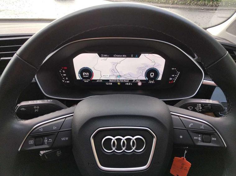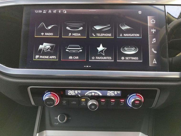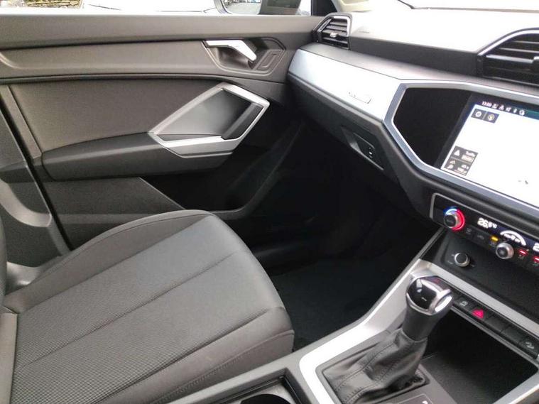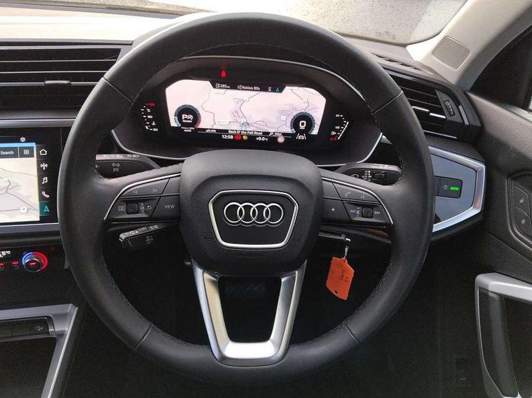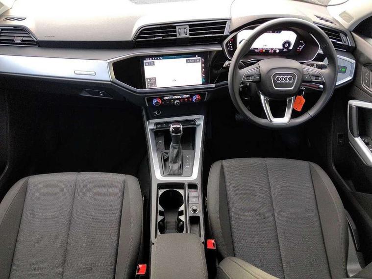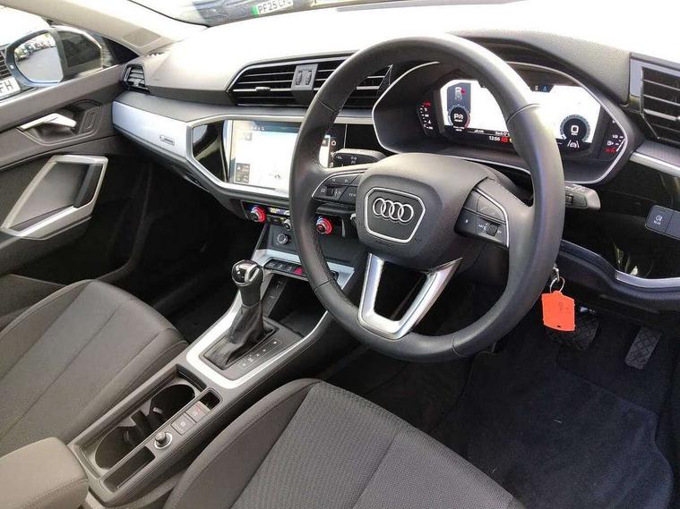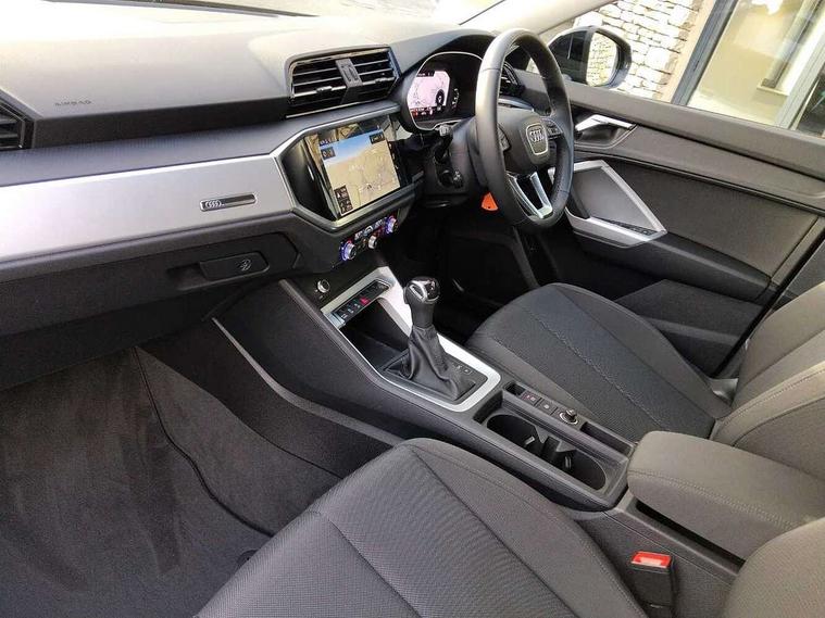 Amazon alexa Integration, Audi drive select, Audi lane departure warning, Audi Virtual Cockpit - 10.25" display, Bluetooth interface, Camera based traffic sign recognition, Legal emergency call, MMI Navigation Plus with high resolution 10.1 inch touchscreen colour display, Power operated tailgate, Progressive steering, Service interval indicator, Smartphone interface includes wireless Apple carplay/Android Auto, Start stop system with recuperation, Voice control system with natural language interaction, Standard suspension, 2 USB-C ports with charge and data functions, 6 passive loudspeakers, DAB digital radio module, Acoustic windscreen, Auto dimming frameless rear view mirror, Black roof rails, Body colour door mirrors, Diffuser in grained anthracite, Electrically folding, adjustable and heated door mirrors with integrated LED side indicators and kerb view function for passenger side, Exterior bumper with wheel arch trims and side sill trims in grained black matt, Front and rear electric windows, Grained radiator protective grille, Halogen rear lights, LED headlights with LED daytime running lights, Rain and light sensors, Rear side wing doors, Rear wiper, Third brake light, Variable front intermittent wipers, 12V socket in rear centre console, 3 seat bench in 2nd row, 3 spoke multi-function leather steering wheel, 40:20:40 folding with manual adjustment for 60:40 forwards/backwards position and backrest angle, Dual zone electronic climate control, Front and rear floor mats, Front and rear headrests, Front and rear roof module including reading lights, Front centre armrest, Glove compartment lighting, Height and reach adjustable steering wheel, ISOFIX child seat mounting for front passenger with airbag deactivation and outer rear seat including top tether attachment point for outer rear seats, Luggage compartment light, Lunar silver cloth headlining, Manual front seats with height adjustment, Single front passenger seat, Stainless steel luggage compartment sill finisher, Non smoking pack - Q3, 3x3 point rear seatbelts, 6 airbags - Driver, front passenger, curtain and side windows, Audi pre-sense front with pedestrain and cyclist recognition, Electrically operated child locks on rear doors, Electromechanical parking brake, Electronic stabilisation control including ABS, ASR and EDL, Front seatbelt reminder, Hill descent control, Hill hold assist, Pre sense basic, Seatbelt monitoring, Tyre pressure warning, Warning triangle and first aid kit, Anti theft alarm, Anti theft wheel bolts, Immobiliser, Remote central locking, Detail dashboard around MMI touch colour display in glass look, black with surround in aluminium look, Micrometallic silver inlay, 17" 5 twin spoke design alloy wheels,