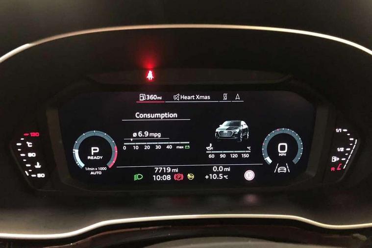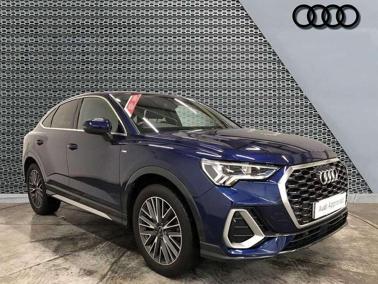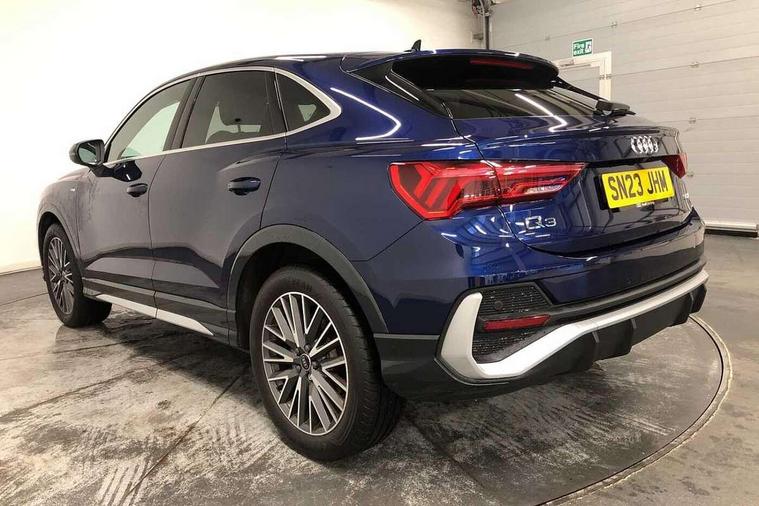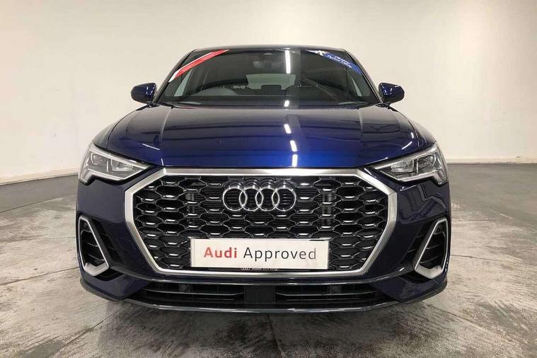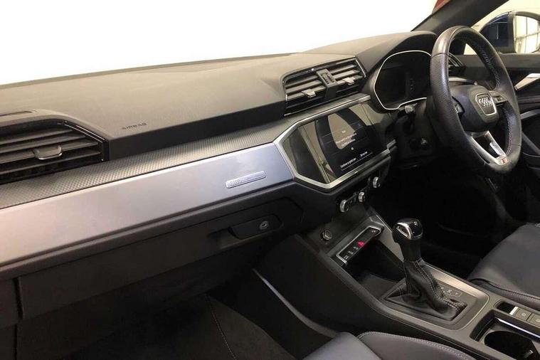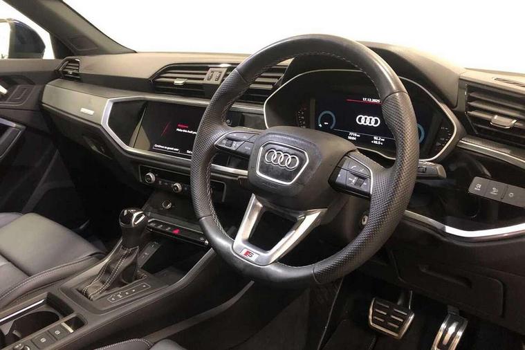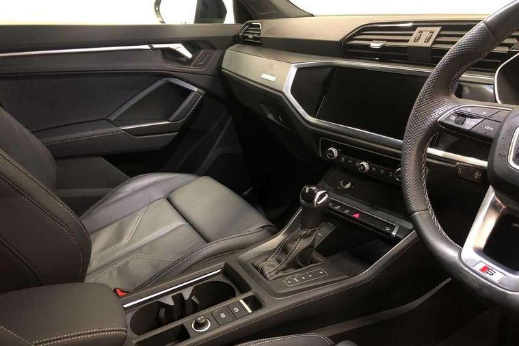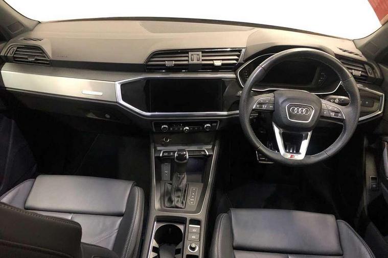Audi drive select, Audi lane departure warning, Audi Virtual Cockpit - 10.25" display, Bluetooth interface, Camera based traffic sign recognition, Legal emergency call, MMI Navigation Plus with high resolution 10.1 inch touchscreen colour display, Power operated tailgate, Progressive steering, Service interval indicator, Smartphone interface includes wireless Apple carplay/Android Auto, Start stop system with recuperation, Voice control system with natural language interaction, Sports suspension, 2 USB-C ports with charge and data functions, 6 passive loudspeakers, DAB digital radio module, Acoustic windscreen, Aluminium window trim, Auto dimming frameless rear view mirror, Diffuser grille in grained matt black, Diffuser trim in selenite silver, Electrically folding, adjustable and heated door mirrors with integrated LED side indicators and kerb view function for passenger side, Front and rear electric windows, Front fog lights, Front side air inlets in selenite silver, Front underbody protection in manhattan grey paint finish, Grille surround in aluminium silver matt, High gloss black finish B and C pillars, LED Dynamic rear indicators, LED headlights with LED daytime running lights, LED rear lights, LED third brake light, Privacy glass dark tinted rear and rear-side windows (from B-pillar backwards), Radiator grille in anthracite black with inlay in matt aluminium silver, Rain and light sensors, Rear side wing doors, Rear underbody protection in matt black, Rear wiper, S line badges on front wings, S line front and rear bumpers and side skirts in contrasting Manhattan grey paint finish, Side skirt insert in matt Platinium grey, Variable front intermittent wipers, 12V socket in rear centre console, 3 seat bench in 2nd row, 3 spoke leather multifunction steering wheel features S badging and grips in perforated leather with contrast stitching, 40:20:40 folding with manual adjustment for 60:40 forwards/backwards position and backrest angle, Adjustable rear seat bench/backrest with centre armrest and cupholder, Black cloth headlining, Dual zone electronic climate control, Front and rear black floor mats with contrast stitching, Front and rear headrests, Front and rear roof module including reading lights, Front centre armrest, Glove compartment lighting, Height and reach adjustable steering wheel, Illuminated door sill trims with S logo, ISOFIX child seat mounting for front passenger with airbag deactivation and outer rear seat including top tether attachment point for outer rear seats, Luggage compartment light right in white, Luggage compartment sill protection in stainless steel, Manual front seats with height adjustment, Perforated leather gearknob, Single front passenger seat, Stainless steel pedals, Ambient lighting pack - Q3, Non smoking pack - Q3, 3x3 point rear seatbelts, 6 airbags - Driver, front passenger, curtain and side windows, Audi pre-sense front with pedestrain and cyclist recognition, Electrically operated child locks on rear doors, Electromechanical parking brake, Electronic stabilisation control including ABS, ASR and EDL, Front seatbelt reminder, Hill descent control, Hill hold assist, Pre sense basic, Seatbelt monitoring, Tyre pressure warning, Warning triangle and first aid kit, Anti theft alarm, Anti theft wheel bolts, Immobiliser, Remote central locking, Aluminium look interior elements, Black dashboard, Dark matt brushed aluminium inlay, Detail dashboard around MMI touch colour display in glass look, black with surround in aluminium look, Leatherette door armrest,