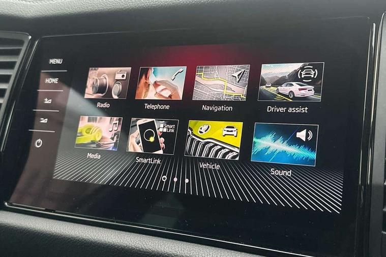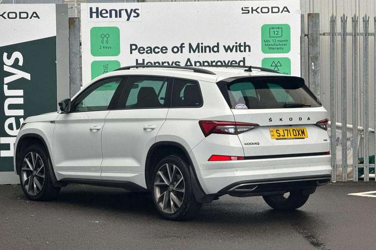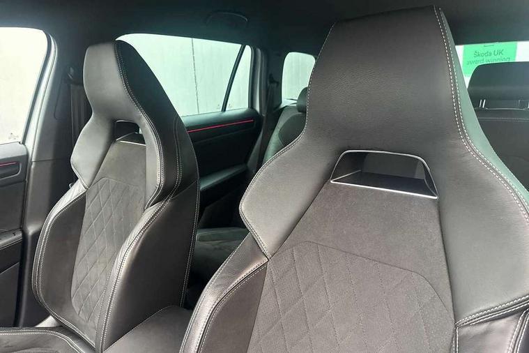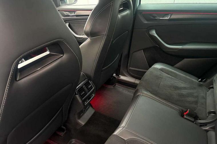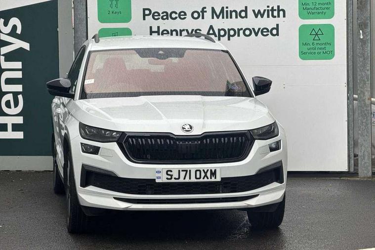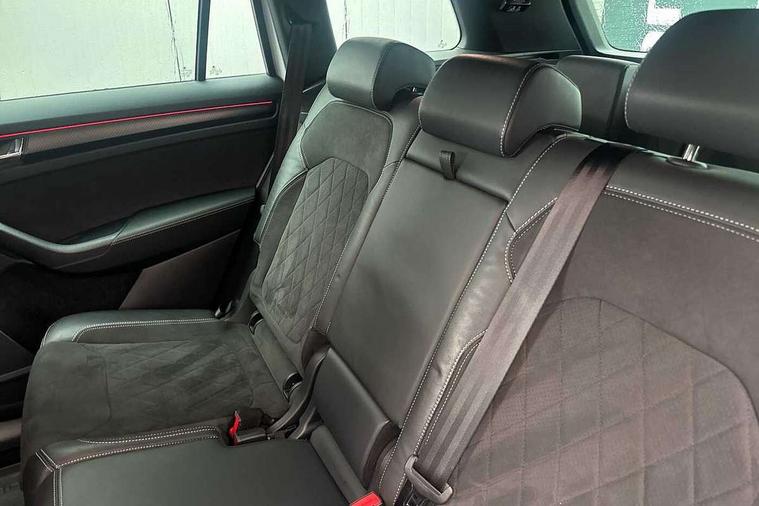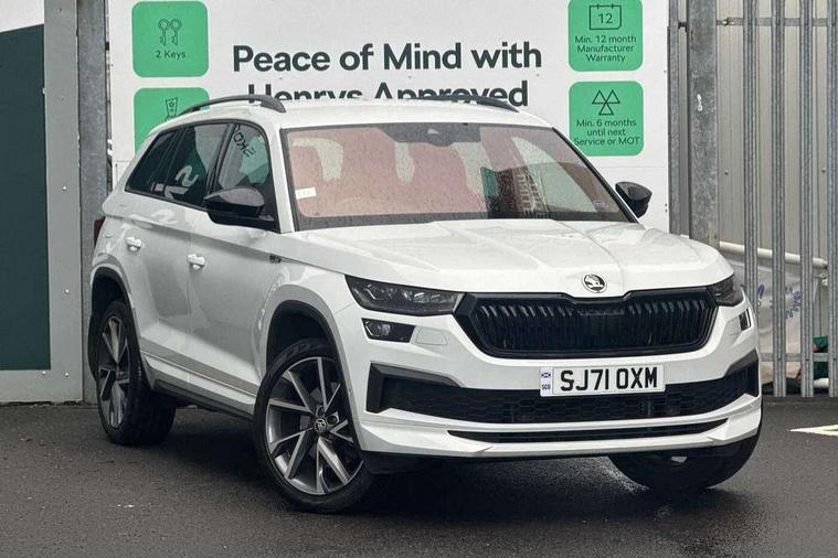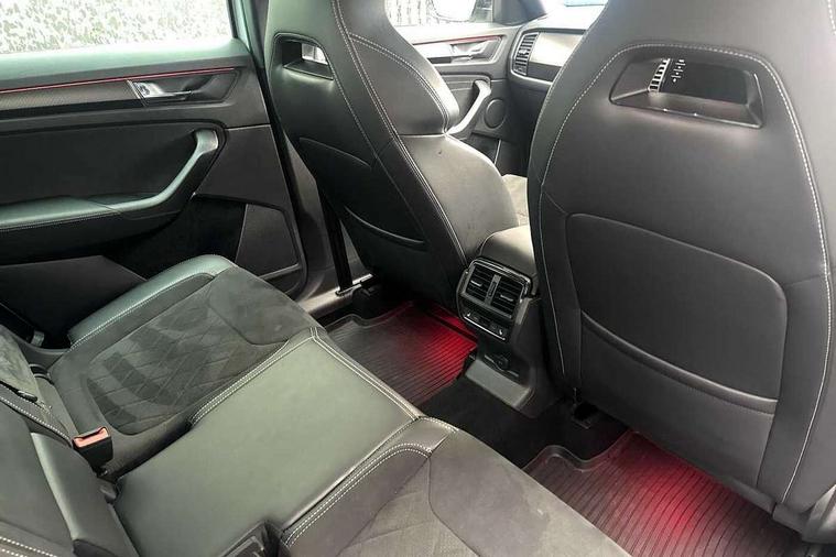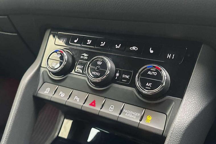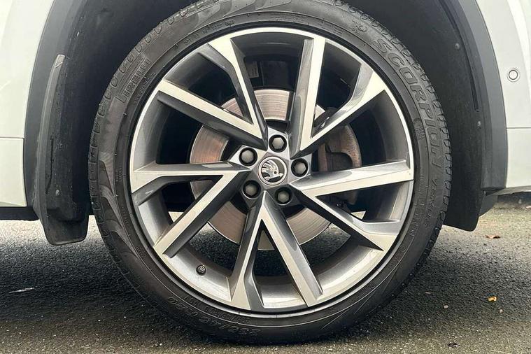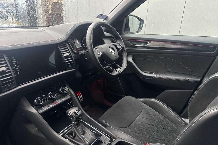 Bluetooth system, Columbus satellite navigation with 9.2" touchscreen, integrated Wi-Fi, web radio, E-call, ECO Stop/start function, Exterior temperature indicator, Progressive steering, Rear view camera, Smartlink wireless for apple carplay and wired for android auto, Speed limiter, Tailgate unlocking from outside, USB C Port x 2 in front centre console, Wireless charging, 8 Speakers, DAB Digital radio, Aero front windscreen wipers with intermittent function, Aero rear window wiper, Auto dimming rear view mirror, Black roof rails, Black sports styling including front grille and window surrounds, Black wheel arch surrounds, Body colour bumpers, Body colour door handles, Electric adjustable/heated/folding door mirrors, driver side auto dimming with boarding sports and memory function, Electric front and rear windows, Extended rear spoiler with finlets in gloss black, Front fog lights, Full LED matrix headlights with AFS (adaptive front light system), cornering function and AWL (all weather lighting system), Gloss black door mirrors, Headlight washers, Heated rear window, Invisible tailpipe, LED daytime running lights, LED rear fog light, LED third brake light in rear spoiler, Light assistant (coming/leaving home/tunnel light), Off-road style lower front bumper element, Privacy glass, Rain and light sensors, Rear diffuser, Rear LED lights (high functionality) with welcome effect and dynamic indicators, Rear side wing doors, Safety reflectors on front and rear doors, Sportline badge on front fender, Sports front and rear bumpers including lower rear chrome strip, Tailgate lettering in Black, Window control switches with black trim, Without engine designation, 12V socket in boot, 2 rails with 2 hooks, 2 seat bench in 3rd row, 3 seat bench in 2nd row, 4 foldable roof handles with rear coat hooks, 60:40 foldable rear seat with sliding adjustment and backrest angle adjustment, Aluminium pedals, Black roof headlining, Bottle holders in door panel in the 1.5 litre front and 1 litre rear, Cargo storage compartments, Chrome headlight control button, Chrome interior door handles, Coat hooks on B pillar, Covered storage compartment on driver side, Decorative door sills in the front and rear, Front centre armrest with storage compartment, cup holder and 12V socket, Front courtesy lights, Gear shift lever with chrome frame and black gloss insert, Grey stitching in front and rear armrests and door armrests + door inserts, Height adjustable front headrests, Illuminated and cooled glovebox, Illuminated luggage compartment, Isofix child seat fittings in outer rear seats with top tether, Manually adjustable steering column, Microsuede door panels, Net programme in boot (1x horizontal Net, 2x vertical Nets), Overhead glasses storage compartment, Pollen filter, Rear centre armrest with cupholders, Single front passenger seat, Sliding trunk cover, Small Bags on the inner sides of the front backrests, Sports seats, Sunvisors with illuminated vanity mirrors, Three rear height adjustable headrests, Ticket holder on A Pillar, Umbrella in door panel, Variable boot floor, LED Interior light pack - Kodiaq, Auto door release and activation of warning lights in the event of an accident, Child locks on rear doors, Driver and front passenger airbag with knee airbag and front passenger airbag deactivation, Electronic parking brake with hill start assist, Emergency rear braking signal, ESC (incl. ABS+MSR+ASR+EDS+HBA+DSR+RBS+MKB), Front assist with autonomous emergency braking, Front side airbags with curtain airbags, Fuel cut off safety device, Height adjustable front 3 point seatbelts + pretensioners, Hill hold control, Rear disc brakes, Safety vest holder in door, Seat belt reminder for all seats, Three point rear seat belts, Two tone horn, Tyre pressure monitor, Alarm with interior monitoring and tilt sensor with safe function, Anti-theft wheel bolts, Immobiliser, Keyless entry and start system (KESSY), Remote central locking with 2 keys, Black air vent surround, Carbon finish dashboard and door inserts, Grey stitching in dashboard, 20" Vega Anthracite alloy wheels, Temporary spare wheel (space saver),