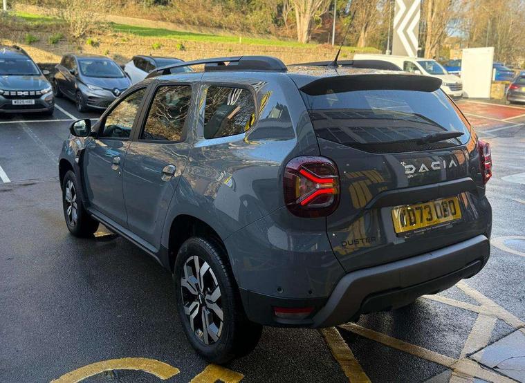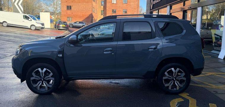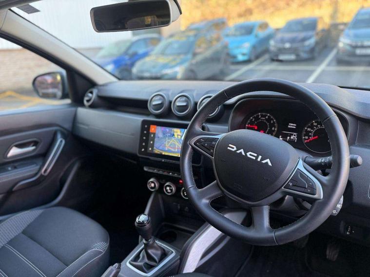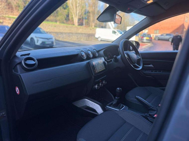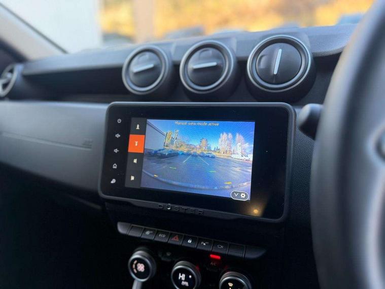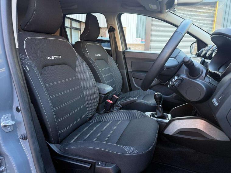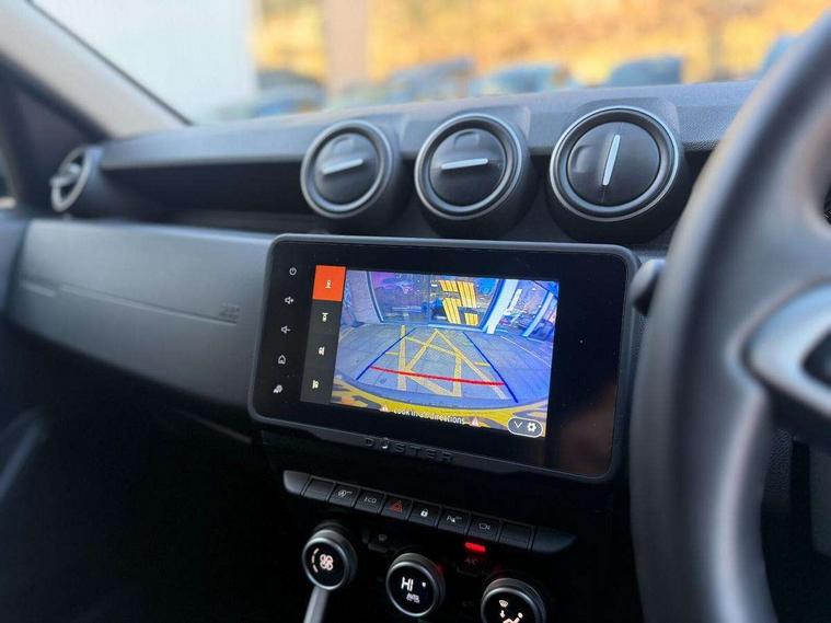 Blind spot warning, Cruise control and speed limiter, eCall emergency system, Eco mode, Electric power assisted steering, Multi view camera, On board computer, odometer, trip computer, average fuel consumption, average speed, service indicator, outside temperature gauge, Rear parking sensors, Rev counter, Reversing camera, Stop/start system, 8" Media Navigation with wireless smartphone replication, Dacia plug and radio/MP3/USB/bluetooth/DAB/steering wheel control, 3 speed windscreen wipers, Acoustic windshield, Automatic front wipers, Black side sills, Black/satin chrome tailgate trim with Duster inscription in black background and lettering, Body coloured door handles, Chrome front grille with hot stamping, Chrome logo surround on steering wheel, Dark glass on lateral rear windows, Daytime running lights, Drivers window one touch up/down, Dusk sensor, Electric adjustable/heated door mirrors, Electric folding door mirrors, Electric front windows, Electric rear windows, Front and rear body coloured bumpers, Front door sill protection strip, Front fog lights, Grey quartz longitudinal roof bars with Duster inscription, Heated rear window, High level third rear brake light, Modular roof bars, Rain sensor, Rear side wing doors, Rear spoiler, Rear wash/wipe, Satin chrome door mirrors, Underbody protection skid plates, Y shaped LED headlights with rear LED lights, 3 rear height adjustable headrests, 3 seat bench in 2nd row, 60/40 split folding rear seat, Automatic air conditioning, Backlighted steering wheel buttons, Boot light, Driver seat lumbar adjustment, Fabric decorative insert on door panels, Fabric upholstery, Front head restraints, Front passenger reading light, Gear shift indicator, Glovebox light, Heated seats, Height adjustable driver seat, Height adjustable front and rear headrests, Height and depth adjustable steering wheel, High centre console with driver armrest, Isofix points for child seats in both outer rear seats, Map pocket on front seat backs, Passenger sunvisor with vanity mirror, Rear passenger reading light, Satin chrome gear lever cap insert, Satin chrome interior door handles, Satin chrome lower steering wheel insert, Single front passenger seat, Soft feel leather steering wheel, 3x3 point rear seatbelts, ABS and Emergency brake assist, ASR traction control with Electronic stability control, Child locks on rear doors, Door open visual and audible warning, Driver airbag, Driver and passenger seatbelt not fastened - visual and audible warning, EBD - Electronic brakeforce distribution, Front passenger airbag, Front passenger airbag deactivation, Front seatbelt pretensioners, Front side airbags, Height adjustable front seatbelts, Hill start assist, Tyre pressure monitor, Keyless entry, Remote central locking, Thatcham approved engine immobiliser, Charcoal grey central console surround, Matt black central console fascia, Matt black decorative insert on rear door panels, Piano black decorative insert on front door panels, Satin chrome air vent surround, Satin chrome instrument dial surrounds, 17" Alloy wheels,