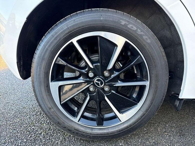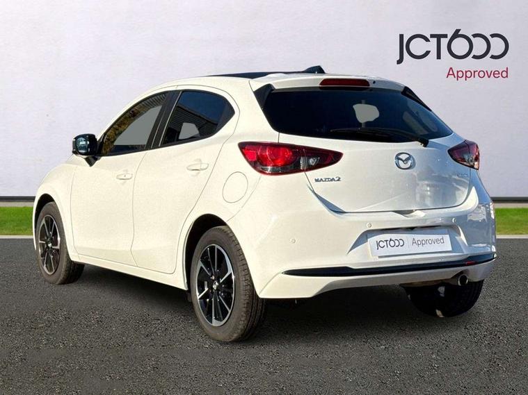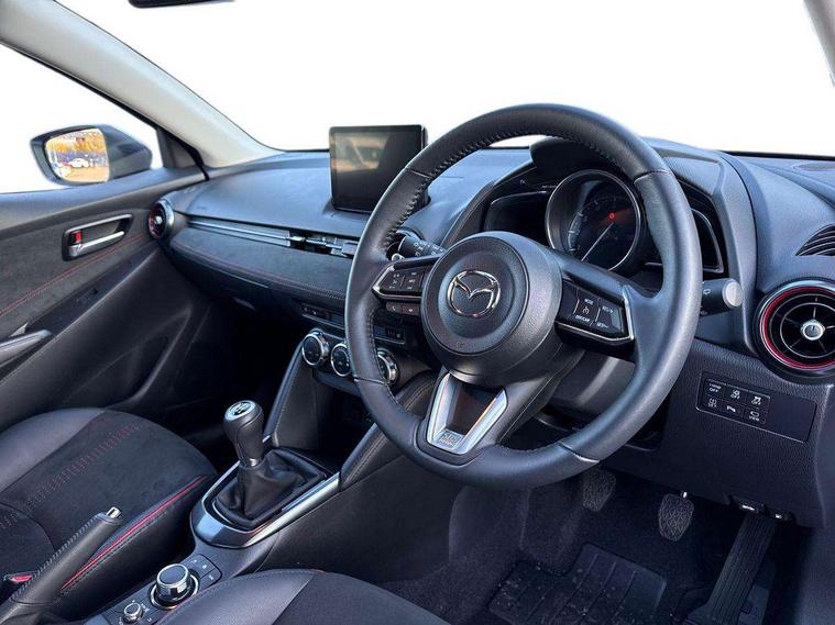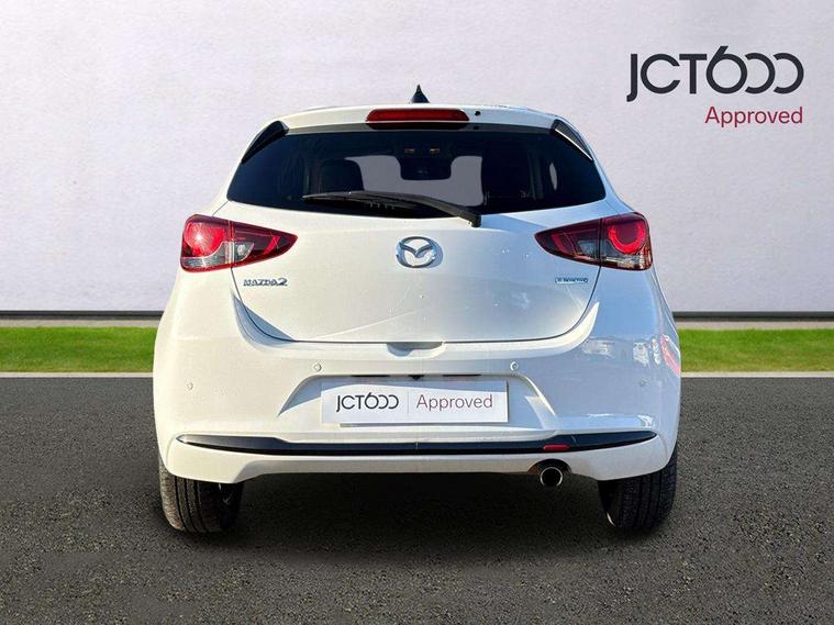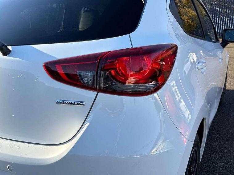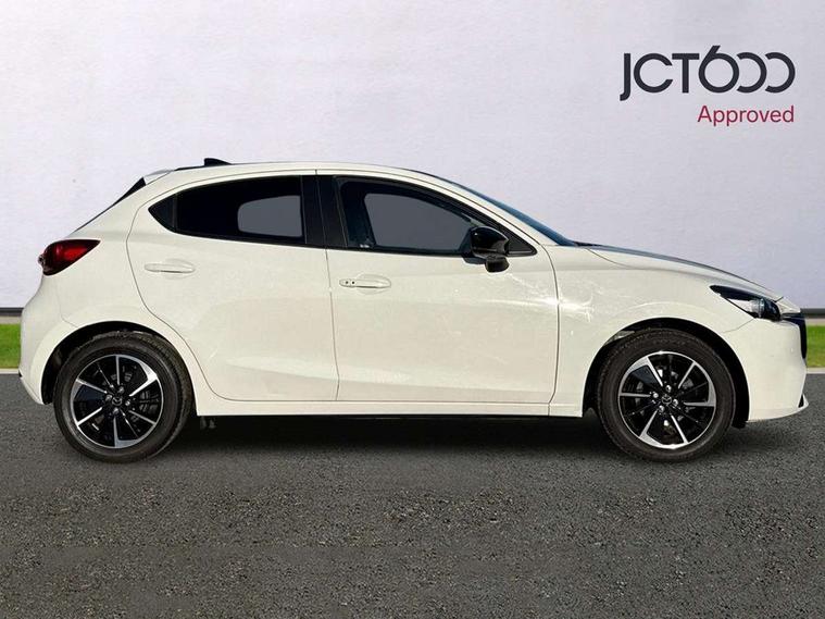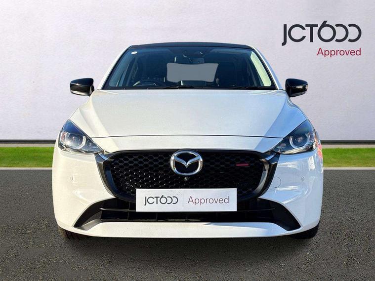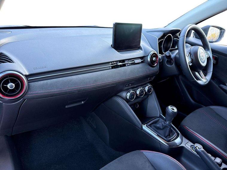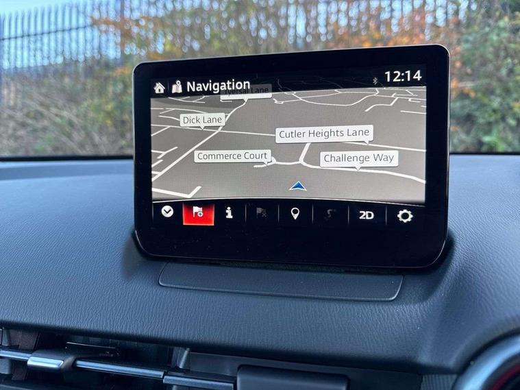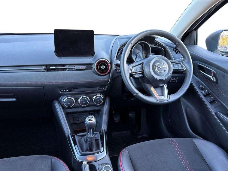 Adjustable speed limiter, Analogue rev counter, Cruise control, Digital instrument cluster, Digital speed display meter, E-call, Emergency stop signalling system, Engine start/stop button, Integrated bluetooth, Lane departure warning system, Lane keep assist, Mazda connect with 8" colour touch screen, Navigation system, PAS, Service indicator, Tailgate, Trip computer, Wireless Apple CarPlay and wired Android Auto, i-stop, Mazda M hybrid, AM/FM/DAB radio with 6 speakers with USB and AUX inputs, Multimedia Commander including separate volume dial, Steering wheel mounted audio/bluetooth controls, Auto dimming rear view mirror, Auto headlight levelling, Black carbon effect roof, Black door mirrors, Black Shark-fin antenna, Body coloured front bumper with black lower bezel, Body coloured rear bumper with black lower mouldings and red accent, Chrome exhaust tailpipes, Coming/leaving home lighting function, Dusk sensing headlights, Electric adjustable/heated/folding door mirrors, Electric front/rear windows with one touch auto up/down for driver's window, Front honeycomb grill with red accent, Gloss black finish signature wing, Heated rear window, LED indicator lights, LED third brake light, Privacy glass, Rain sensing front wipers with adjustable sensitivity and speed, Rear side wing doors, Rear wiper, Signature LED daytime running lights, 3 seat bench in 2nd row, 60/40 split rear seats, Black/red air vent accents, Climate control air conditioning, Driver, Front passenger and two rear grab handles with coathooks, Drivers seat manual slide recline and height adjustment, Drivers/front passengers covered vanity mirrors and drivers ticket holder, Front centre storage with two cupholders, Front head restraints, Front passenger and driver door pockets, Front passenger seat manual slide, recline and height adjust, Front passenger seatback pockets, Gear shift indicator, Glovebox, Heated front seats with 3 stage setting, Heated leather steering wheel, Interior courtesy light with integrated spotlight, ISOFIX child seat anchorage points attached on outer rear seats, Leather gear knob, Leather handbrake, Leather/Cloth upholstery, Luggage compartment light, Single front passenger seat, Three height adjustable rear head restraints, Tilt/telescopic adjustable steering wheel, Driver Assistance pack - Mazda 2, 2x3 point front seatbelts with pre-tensioners, 3 point seatbelts on all rear seats, Anti-lock braking system (ABS), Collision mitigation braking system, Dynamic stability control + Traction control, ESP, Front and rear curtain airbags, Front driver, passenger and rear seat seatbelt warning, Front dual stage driver and single stage front passenger airbags, Front side airbags, Front smart city brake support, G-Vectoring control plus, Hill launch assist, Manual child lock in rear doors, Passenger airbag cut-off switch, Tyre pressure monitoring system, Deadlocking system, Power door locks, Remote central locking, Smart keyless entry, Thatcham accredited alarm and immobiliser, Black soft touch dashboard panel with red stitching colour coordination, 16" Black metallic machined alloy wheels, Emergency tyre repair kit,