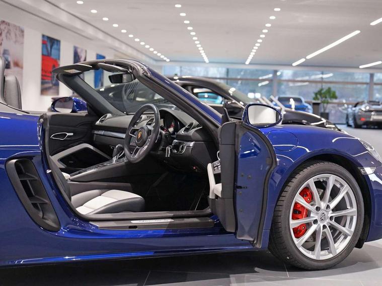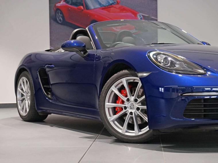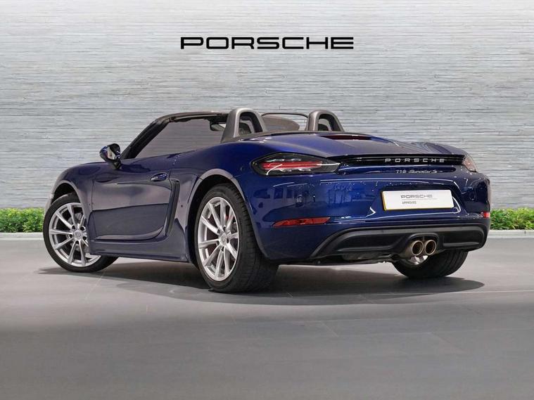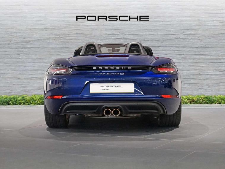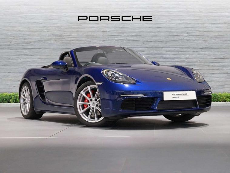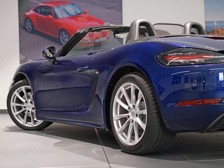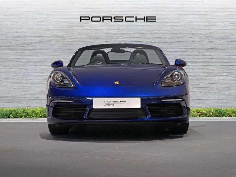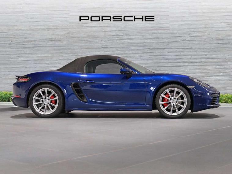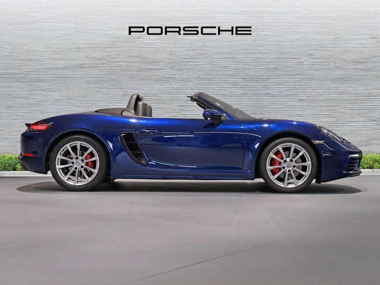 Auto start and stop system, Digital displays for vehicle speed, chosen gear, odometer, trip odometer and clock, eCall emergency call system, Instrument cluster with central rev counter and high-resolution 4.6 inch colour display, Porsche Communication Management (PCM) including online navigation module, mobile phone preparation, audio interfaces and voice control system, 3-way catalytic converters and on-board diagnostics for monitoring emission control system and coated particulate filter, 4 valves per cylinder, 64 litre fuel tank, Aluminium block and cylinder heads, Direct fuel injection (DFI), Gasoline particulate filter, Integrated dry-sump lubrication with an on-demand oil pump, Porsche Doppelkupplung (PDK), Porsche Stability Management (PSM) with ABS, advanced brake functions, Rear wheel drive, Turbocharger with variable turbine geometry (VTG) and intercooler, Two seater vehicle with mid mounted engine, VarioCam Plus variable valve timing and switchable valve lift, Water cooled with thermal management, DAB Digital radio, Integrated 4G/LTE compatible SIM including data for the Porsche Connect Services, Integrated compatible SIM including Porsche Connect Services, Navigation incl porsche + Apple Carplay, connect module, wireless internet access, carfinder, remote vehicle status, remote service and vehicle track, Wifi and music streaming, Auto deploying rear wing, Automatic headlight activation including welcome home lighting, Automatically extending rear boot spoiler, Body colour bumpers, Body colour door handles, Electrically adjustable heated exterior mirrors on door waist rails, aspherical on driver's side, Fully automatic fabric hood, electrically operated/heatable rigid glass rear screen, operable approx 31 mph and convenient operation by key remote, Green tinted heat insulating glass, Grey top tinted windscreen, Heated rear windscreen, Intelligent lightweight body in Aluminium/Steel composite construction, LED 3rd brake light, Net wind deflector, Power windows with one touch operation and door seal protection, Rain sensor, Rear boot, Separate auxiliary lights in the front end with LED indicators and position lights, Twin tract sports exhaust system with central twin tailpipe in stainless steel, Windscreen washer system with two wiper speeds and washer jets, 12V sockets in passenger footwell and centre console storage compartment, 718 logo on gear lever, Additional smooth finish leather with door panel armrest and centre console main storage compartment, Adjustable fan with air recirculation and defroster functions, Ascending centre console with uncovered storage compartment and closed storage compartment, Clothes hooks on front seat backrests, Footwell illumination, Front and rear luggage compartments, Front headrests, Heated seats, Hood lining in black fabric, LED reading lights, orientation, ignition lock, additionally luggage compartment and glove compartment lighting, Lockable glovebox, Seat centres in race tex, side bolsters and headrests in leather, Single front passenger seat, Smooth finish leather on steering wheel rim, gear lever and door handles, SPORT button to activate dynamic driving settings for engine, transmission (with PDK), Storage compartments in each doors, Two individual cup holders (Passenger side, integrated into dashboard trim strip), 3 point automatic seatbelts, ASR, Electrically controlled parking brake, Front and rear 4 piston aluminium monobloc fixed calipers, discs internally vented and cross drilled, front/rear disc diameter, brake calipers in red, Front and rear lightweight spring strut axle, Front seatbelt pretensioners + load limiters, Full size driver and passenger airbags, Passenger airbag deactivate switch, Porsche side impact protection doors with thorax airbag in outer backrest side bolster and head airbag for driver/passenger in door panel, Tyre pressure monitoring system, Alarm system with interior surveillance, Anti-theft wheel bolts, Dashcam prep, Engine immobiliser with in key transponder, central locking and remote control, Tyre repair kit,