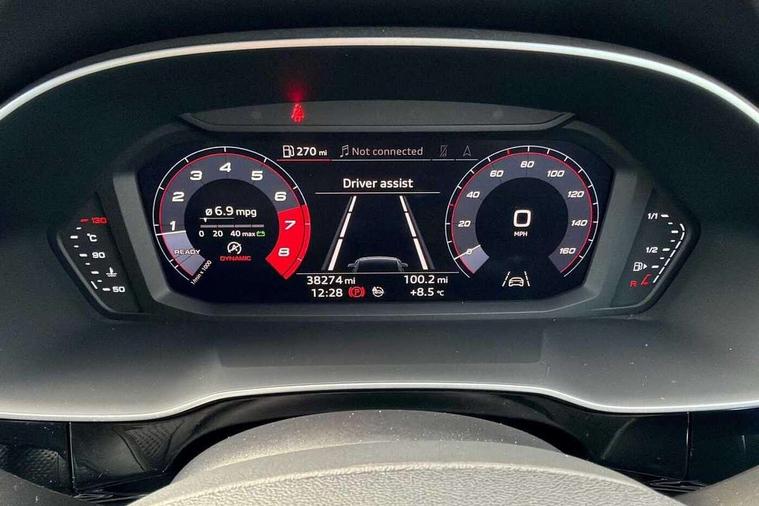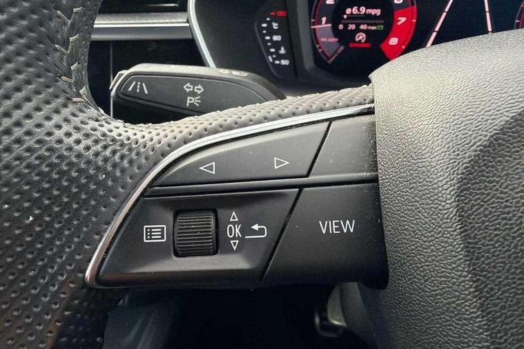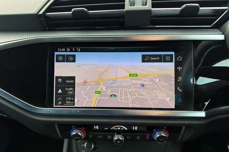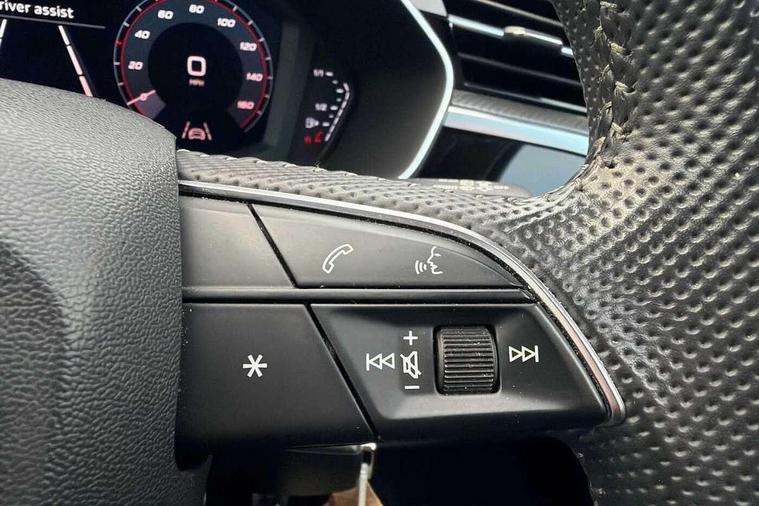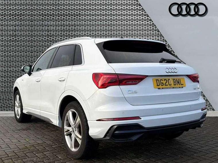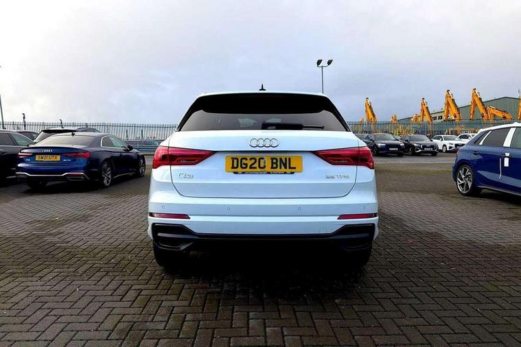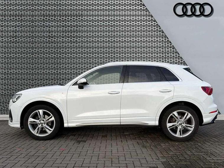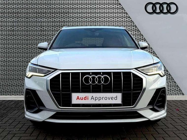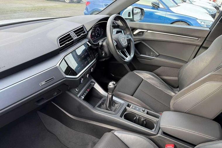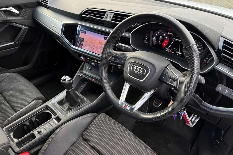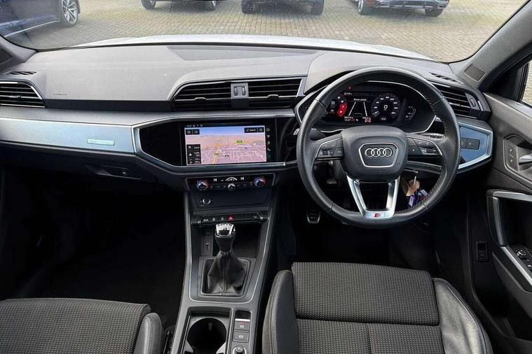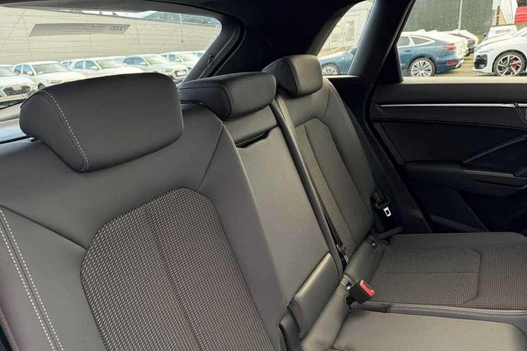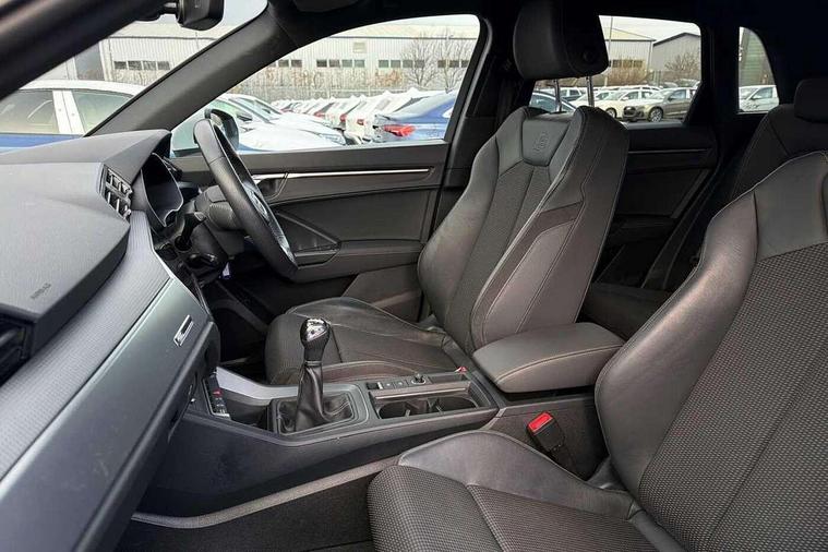 Apple CarPlay, Audi connect safety and service (e-call), Audi drive select, Audi lane departure warning, Audi side assist, Audi smartphone interface, Audi Virtual Cockpit - 10.25" display, Bluetooth interface, Camera based traffic sign recognition, Cruise control + speed limiter, MMI Navigation Plus with high resolution 10.1 inch touchscreen colour display, Power opening/closing tailgate, Progressive steering, Rear parking sensors, Service interval indicator, Start stop system with recuperation, Voice control system with natural language interaction, Sports suspension, 1 x USB type C and 1 USB type A charging points, 6 speakers, DAB digital radio module, Acoustic windscreen, Aluminium roof rails, Aluminium window trim, Auto dimming frameless rear view mirror, Body coloured bumpers, Electrically folding, adjustable and heated door mirrors with integrated LED side indicators and kerb view function for passenger side, Front and rear electric windows, Front fog lights, Front side air inlets in matt platinum grey, Front spoiler blade in matt platinum grey, Grille vertical bars in aluminium silver/Matt, High gloss black finish B and C pillars, LED headlights with LED daytime running lights and dynamic rear indicator, LED rear lights, Privacy glass, Rain and light sensors, Rear diffuser strip in matt titanium black, S Line badge on wings, S Line front and rear bumpers, Side skirt insert in matt Platinium grey, Silver chrome grille surround, Titanium black radiator grille, 12V socket in rear centre console, 40:20:40 split folding rear bench seat, 60:40 forwards/backwards position and backrest angle, Adjustable rear seat bench/backrest with centre armrest and cupholder, Aluminium door sill trims, Black cloth headlining, Dual zone electronic climate control, Front and rear black floor mats with contrast stitching in rock grey, Front and rear headrests, Front and rear roof module including reading lights, Front centre armrest with storage compartment and angle adjustment, Glove compartment lighting, Height and reach adjustable steering wheel, Illuminated door sill trims with S logo, ISOFIX child seat mounting and Top Tether with front passenger airbag deactivation, Luggage compartment light, Manual front seats with height adjustment, Perforated leather gearknob, Stainless steel luggage compartment sill finisher, Stainless steel pedals, Non smoking pack - Q3, 3x3 point rear seatbelts, 6 airbags - Driver, front passenger, curtain and side windows, Electrically operated child locks on rear doors, Electromechanical parking brake, Electronic stabilisation control including ABS, ASR and EDL, Hill descent control, Hill hold assist, Pre sense basic, Seatbelt monitoring, Tyre pressure warning, Warning triangle and first aid kit, Anti theft alarm, Anti theft wheel bolts, Audi pre-sense front with pedestrain and cyclist recognition, Remote central locking, Dark matt brushed aluminium inlay, Leatherette door armrest, MMI touch colour display in gloss black with aluminium surround,