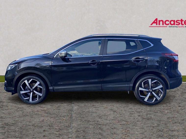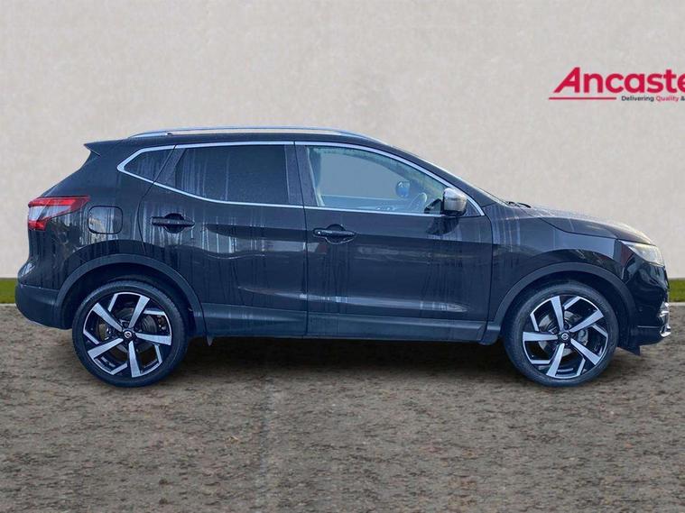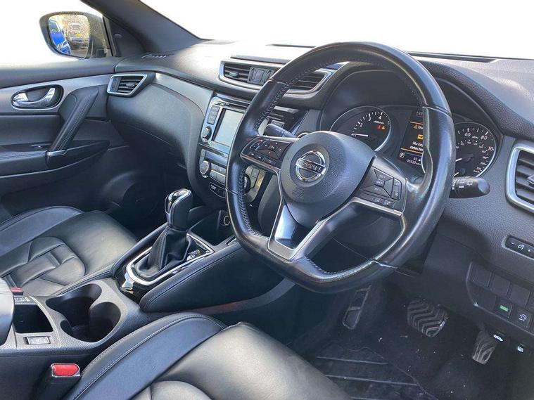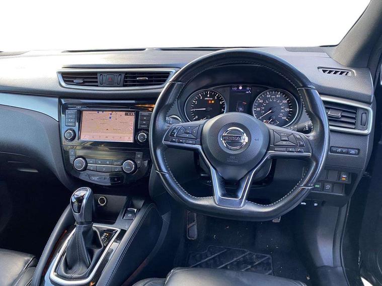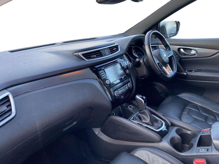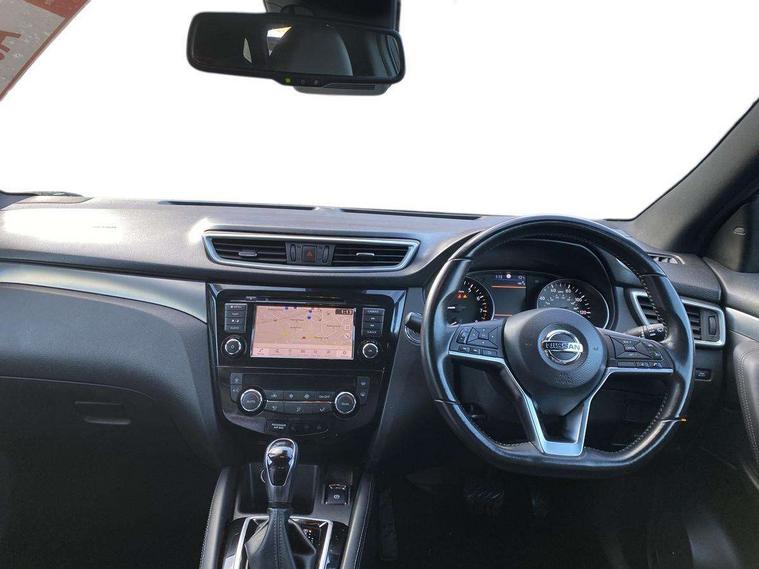 Advanced drive assist display 5'' TFT coloured screen, Android Auto, Apple CarPlay preparation, Bluetooth connectivity, Cruise control + speed limiter, Electric speed sensitive power steering, Front parking sensors, Intelligent around view monitor, Intelligent parking assist, Lane departure warning system, Nissan connect evo 7" touchscreen navigation and entertainment system, Normal or sport selectable steering, Outside temperature sensor, Push button starter, Rear parking sensors, Rear view camera, Service interval indicator, Smartphone integration, Stop/start system, Tomtom connected services, Traffic sign recognition, Trip computer, Voice control system, Nissan chassis control (intelligent ride control, intelligent trace control, intelligent engine brake), AM/FM radio, CD audio system, Aux-in socket, Bose premium 8 speaker system, DAB Digital radio, Steering wheel mounted audio controls, USB port, Anti dazzle rear view mirror, Auto wipers, Body colour bumpers, Body coloured door handles, Chrome window surround, Daytime running lights dip function when turn signal applied, Electric folding door mirrors, Electric front and rear windows with one touch illuminated window controls, Electric front/rear windows, Electrically adjustable door mirrors, Front fog lights, Gloss silver door mirror caps, Heated door mirrors, High beam assist, Intelligent auto headlights, LED indicators in door mirrors, Matt silver roof rails, Panoramic sunroof with one touch shade, Privacy glass, Rear roof spoiler, Rear wiper with reverse link, Shark fin antenna, Underbody vortex generators, 2 X front 12v power sockets, 3 height adjustable rear headrests, 60/40 split folding rear seat, Ambient lighting in centre console, Boot lighting, Centre console storage box/armrest, Chrome interior door handles, Configurable luggage board system, Dark headlining, Dual zone climate control, Electric 4-way lumbar support for drivers seat, Electrically adjustable driver seat, Electrically adjustable passenger seat, Front and rear door pockets with bottle holders, Front and rear seat belt pre-tensioners with load limiters, Height adjustable front headrests, Individual rear seat reading lights, Leather D shaped steering wheel, Leather gear lever, Leather knee pad, Manual lumbar support on passenger seat, Map reading lamp, Memory for drivers seat/door mirrors, Monoform front seats with plastic backboard, One touch electric shade, Parcel shelf stow function under luggage board, Pollen filter, Rear armrest with 2 cupholders, Synthetic leather wrapped door handle with contrasting stitching, Tilt/telescopic adjustable steering wheel, Heat package - Qashqai, LED pack - Qashqai, Safety shield plus pack - Qashqai, 6 airbags - Driver, front passenger, curtain and side airbags, ABS, ESP, EBD and brake assist, Auto hold function, Child locks on rear doors, Electronic parking brake, Front and rear seat belt warning, Front passenger airbag deactivation, Height adjustable front seatbelts, Hill start assist, Intelligent emergency braking with pedestrian recognition, Three 3 point rear seatbelts, Tyre pressure monitoring system, Anti-theft immobiliser, Intelligent Key, Remote central locking, Thatcham Cat.1 alarm, Carbon graphite dash trim, Tyre puncture repair kit,