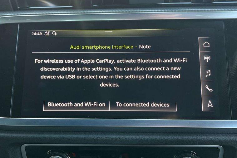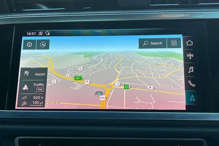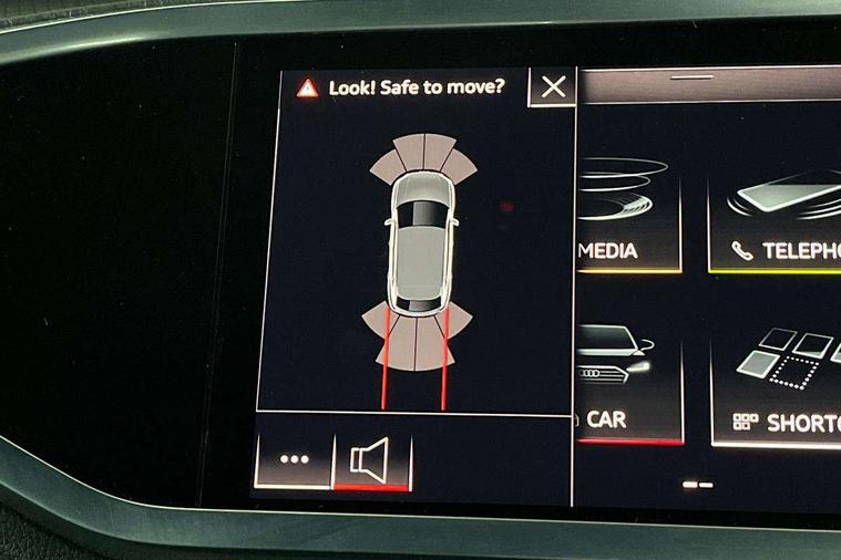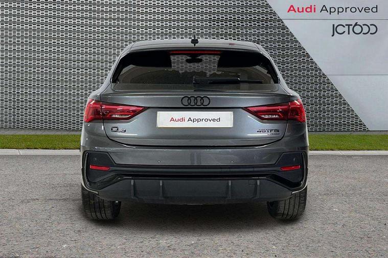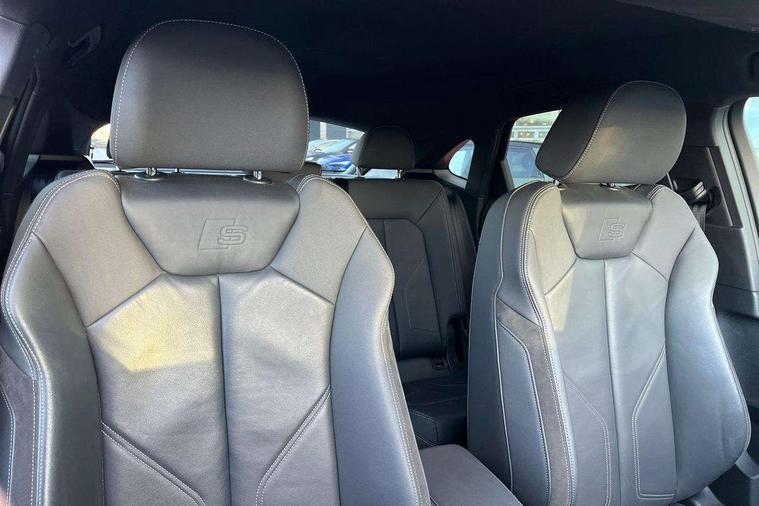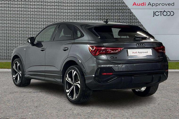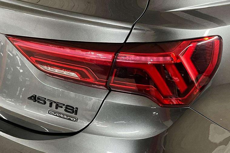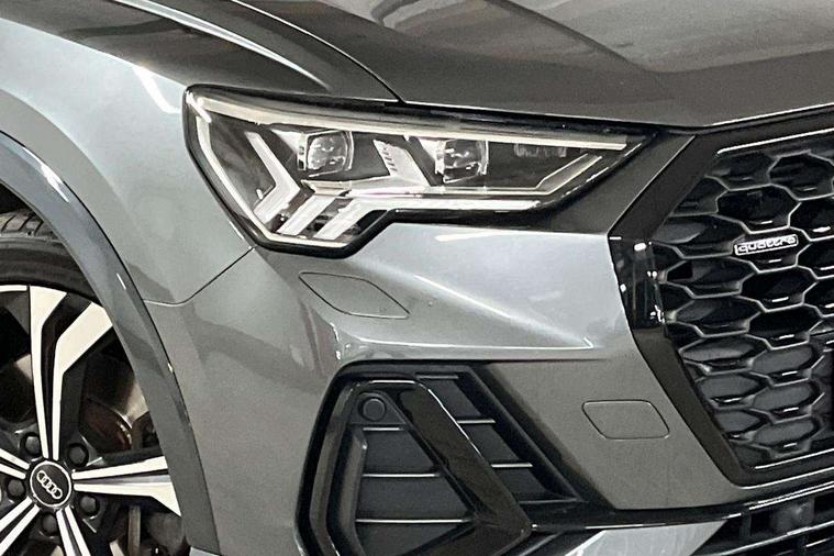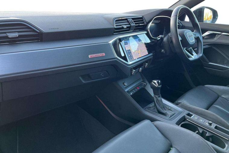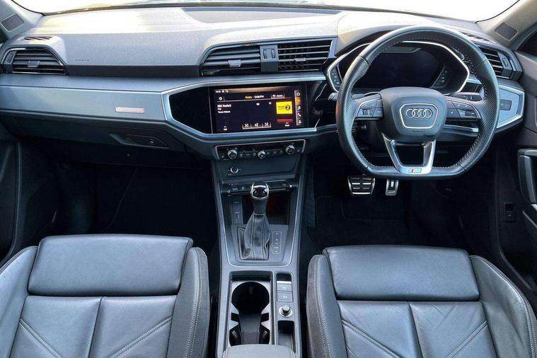 Audi connect safety and service (e-call), Audi drive select, Audi lane departure warning, Audi side assist, Audi smartphone interface, Audi virtual cockpit plus, Bluetooth interface, Camera based traffic sign recognition, MMI Navigation Plus with high resolution 10.1 inch touchscreen colour display, Power operated tailgate, Progressive steering, Service interval indicator, Start stop system with recuperation, Voice control system with natural language interaction, Sports suspension, 1 x USB type C and 1 USB type A charging points, 6 passive loudspeakers, DAB digital radio module, Acoustic windscreen, Audi Beam uses LEDs to project the Audi Sport logo, Auto dimming frameless rear view mirror, Diffuser grille in grained matt black, Diffuser trim in selenite silver, Electrically folding, adjustable and heated door mirrors with integrated LED side indicators and kerb view function for passenger side, Front and rear electric windows, Front fog lights, Front underbody protection in manhattan grey paint finish, Headlight washers, High gloss black finish B and C pillars, Matrix LED headlights with LED rear lights and dynamic front and rear indicator, Privacy glass dark tinted rear and rear-side windows (from B-pillar backwards), Rain and light sensors, Rear underbody protection in matt black, 12V socket in rear centre console, 3 spoke flat bottomed high multi-function leather sport steering wheel with gearshift paddles, 4 way electric lumbar support for driver and front passenger, 40:20:40 folding with manual adjustment for 60:40 forwards/backwards position and backrest angle, Adjustable rear seat bench/backrest with centre armrest and cupholder, Black cloth headlining, Dual zone climate control, Electrically adjustable front seats, Front and rear black floor mats with contrast stitching, Front and rear headrests, Front and rear roof module including reading lights, Front centre armrest, Glove compartment lighting, Heated front seats, Illuminated door sill trims with S logo, ISOFIX child seat mounting and Top Tether with front passenger airbag deactivation, Luggage compartment light, Perforated leather gearknob, Stainless steel luggage compartment sill finisher, Stainless steel pedals, Black styling pack - Q3, Multi coloured extended ambient interior lighting pack - Q3, Non smoking pack - Q3, 3x3 point rear seatbelts, 6 airbags - Driver, front passenger, curtain and side windows, Audi pre-sense front with pedestrain and cyclist recognition, Electrically operated child locks on rear doors, Electromechanical parking brake, Electronic stabilisation control including ABS, ASR and EDL, Hill descent control, Hill hold assist, Pre sense basic, Seatbelt monitoring, Tyre pressure warning, Warning triangle and first aid kit, Anti theft alarm, Anti theft wheel bolts, Remote central locking, Dark matt brushed aluminium inlay, Detail dashboard around MMI touch colour display in glass look, black with surround in aluminium look, Leatherette door armrest,