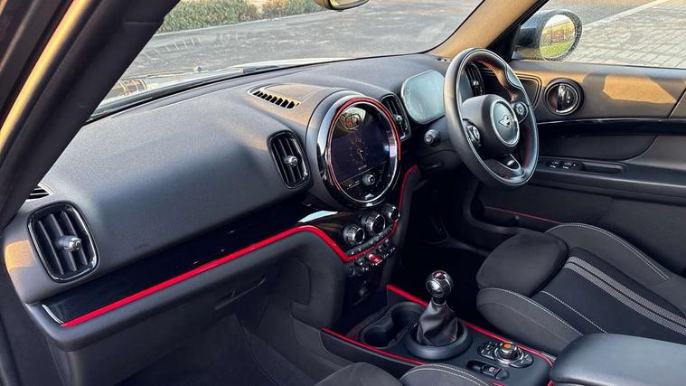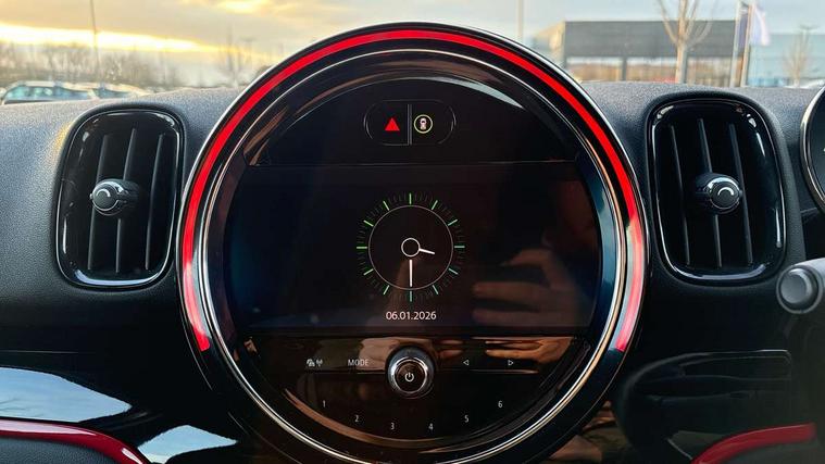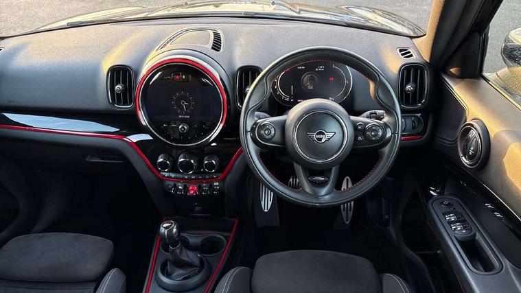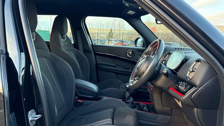 Active Guard incl speed limiting and lane departure functions with auto steering, and front collision warning with brake intervention, Automatic start/stop function with brake energy recuperation, Digital cockpit, Electro-mechanical speed dependant steering assistance, Instrument cluster, MINI Driving Modes - centre toggle switch to control driving setting (sport, mid and green), Mini E-call, MINI TeleServices, On board computer, Rear parking distance control, Double Vanos system, Fully variable valve control, High precision injection, Performance Control, FM tuner and DAB digital radio, Bonnet scoop, Chrome border honeycomb structure radiator grille with S badge, Chrome fuel filler cap, Day time driving lights, Dynamic brake lights, Electric windows, Heated rear window, Heated windscreen washer jets, John Cooper Works - aerodynamic kit (front and rear apron, spoiler), front and rear sport bumpers and part-painted side sills with door sill finishers, John Cooper Works Logo, John Cooper Works rear spoiler, LED fog lights, LED Headlights, Metal door sill strips with Cooper S imprint, Model logo, Model logo on Tailgate, Rain sensor with auto headlights, Rear fog lights, Rear window wiper, Side scuttle panel with integrated indicator, Split rear doors, Sun/heat protection glass, Twin exhaust tailpipe, White indicator lenses, 12V Accessory socket in centre console, 360L luggage compartment capacity, 4 lashing eyes in luggage compartment, 40:20:40 split folding rear seats, Anthracite headlining with grab handles and clothes hooks, Chrome interior highlights, Colour line - Carbon black, Cupholders, English handbook, Front headrests, Glove compartment, Height and length steering column adjustment, Interior lighting with 12 basic colours selectable via toggle switch in roof, Isofix rear child seat preparation, John Cooper Works perforated leather steering wheel with contrast stitching in chilli red and John Cooper Works logo, Leather gearshift lever and handbrake gaiters, LED reading lights, vanity mirror lights, front foot well light and spotlight on front seats, Manual air conditioning, Multifunction steering wheel, Passenger seat height adjuster, Rear headrests, Storage compartments in doors, Sunvisors with vanity mirrors, Tool kit, Excitement pack - Countryman, Navigation pack - Countryman, 2 tone horn, 3 point seatbelts on all seats, 6 Airbags - front, side, head and seat belt tensioners, Anti-lock braking system (ABS), DSC - Dynamic Stability Control, Electronic handbrake, Front and rear disc brakes, Hill start assist, Tyre pressure monitoring system, Alarm system with tilt sensor, monitoring doors, bonnet interior and tailgate, Auto drive away locking, Deadlocking function, Electronic vehicle immobiliser, Locking wheel bolts, Start/stop toggle with keyless go, Piano black JCW interior trim,