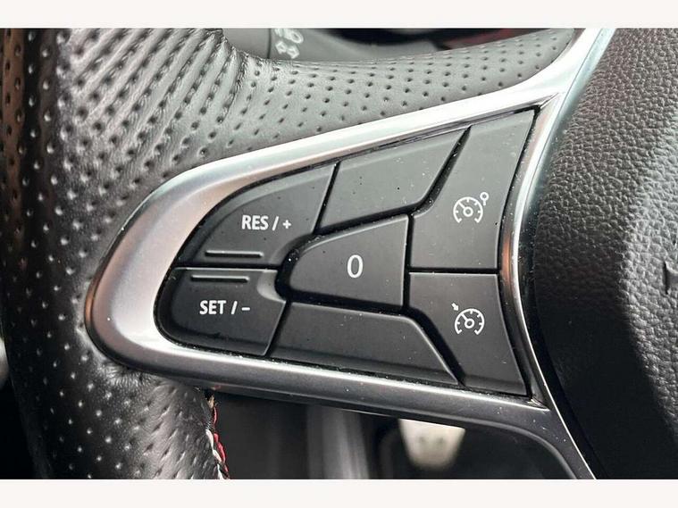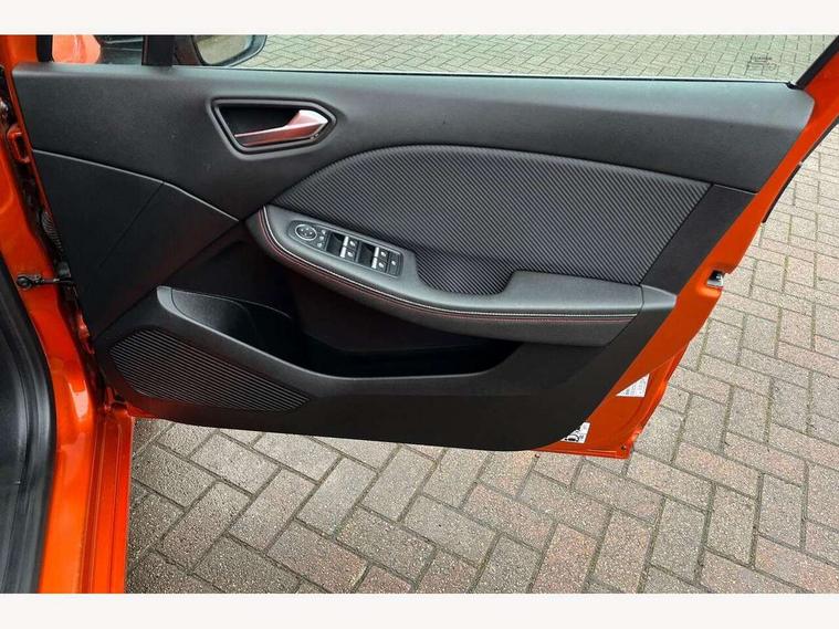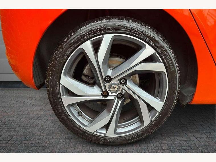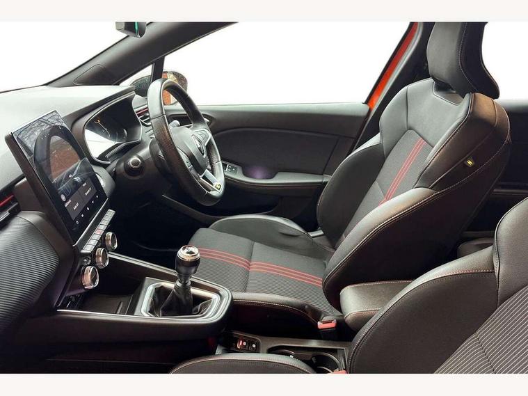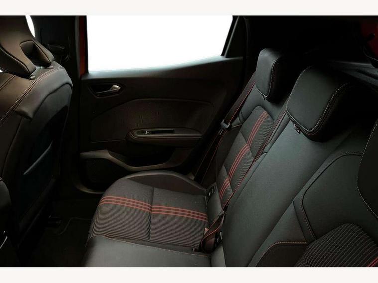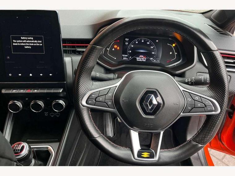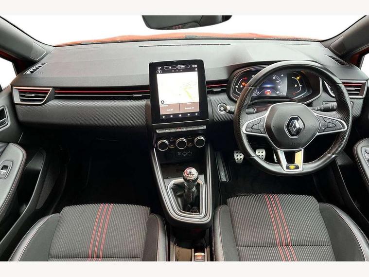 7" TFT colour instrumental display, Cruise control + speed limiter, E-call, Easy link 9.3" screen with nav, 4x20W amp, DAB double tuner, 2xUSB, 1xJack/Bluetooth, and smartphone integration plus - Apple CarPlay/Android Auto, Eco mode driving function, Gear change indicator, Lane departure warning system, Lane keep assist, Over speed prevention, Rear parking sensors, Traffic sign recognition, Trip computer, Variable assistance electric PAS, Automatic headlights + automatic windscreen wipers, Body colour door handles, Body colour door mirrors, Body coloured bumpers, Body coloured rear spoiler, Chrome exhaust tailpipe, Chrome front grille, Chrome window surround, Drivers one touch window with anti-pinch feature, Electric adjustable/heated/folding door mirrors, Electric front windows, Electric rear windows, Exterior rear hidden door handles, Extra tinted glass on rear windows + tailgate, Frameless auto dimming interior rear view mirror, Full C-shape LED front and rear signature lighting, Full LED front and rear headlamps integrating daytime running lights at the front and rear, Gun Metal insert on lower side doors with Clio embossing, LED front fog lights, LED Roof light, Rear fog lights, Rear wiper, RS Line badging, RS Line exterior styling, RS Line side marker chrome, RS Line sports front bumper, RS Line sports lower grill, RS marker chrome gun metal grey sport rear bumper with chrome oval exhaust pipe, Shark fin antenna, Variable speed on front windscreen wipers, 12V Accessory socket, 3 rear height adjustable headrests, 6.2L front glovebox, 60/40 split rear seats, Air recirculation control, Auto climate control, Black headlining, Dark roof lining and aluminimum pedal set, Driver's seat height adjustment, Front cupholders, Front decor strip in red, Front door storage bin, Height adjustable front headrests, Height adjustable passenger seat, Height/reach adjust steering wheel, Isofix system on outer rear seats, Leather steering wheel, Multi function steering wheel, Multisense including ambient lighting and selectable drive modes, Pollen filter, RS branded top grain leather steering wheel, RS Line cloth upholstery, RS Line Interior trim including airvent stripe and gearshifter in red, System for Restraint and Protection SRP-front seats, Parking Pack - Clio, Storage pack - Clio, 3 point seatbelts on all rear seats, ABS+EBD+Brake assist, Automatic emergency braking system, Curtain airbags, Distance warning alert, Driver and passenger front and side airbag deactivation, Driver/Front Passenger airbags, ESC - Electronic Stability Control + traction control, Front side airbags(head+thorax), Height adjustable driver's seatbelt, Hill start assist, Seatbelt warning, Tyre pressure warning, Central door locking, Deadlocking system, Hands free key card with push button, start and stop function, Locking fuel filler cap, RAID (Renault Anti-Intruder Device) with automatic door locking, Rear side wing door and window child locking function (front driver door control panel), Remote central locking with thatcham approved immobiliser, Grey dashboard trim, 17" RS diamond cut alloy wheels,