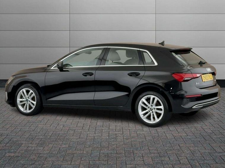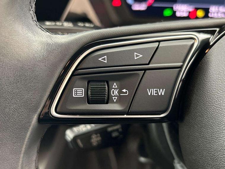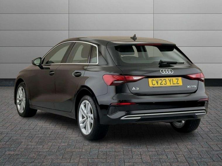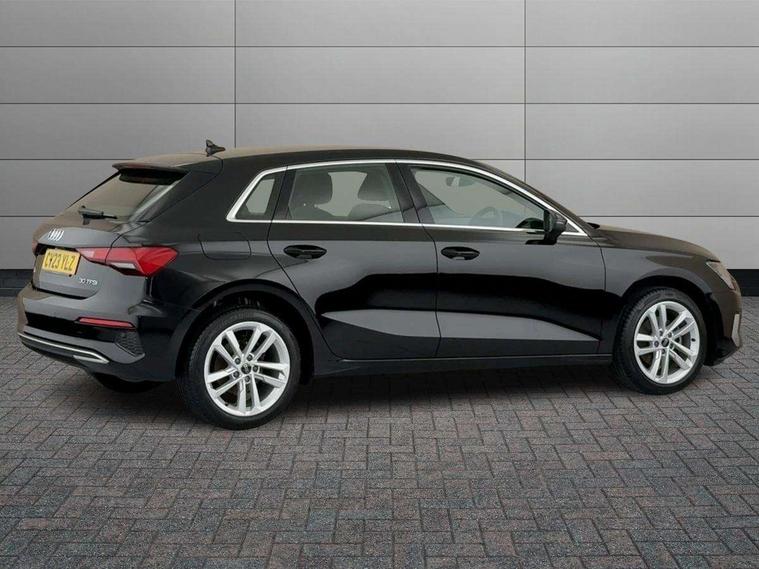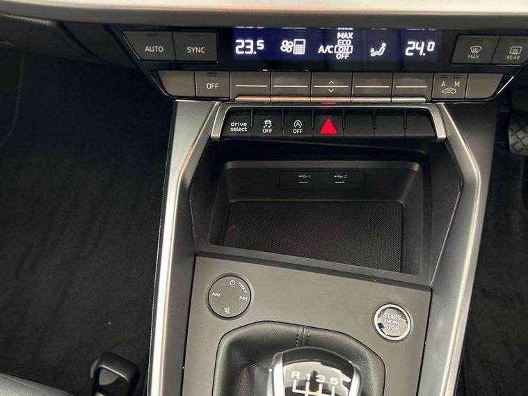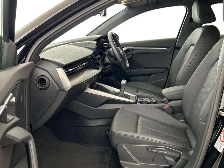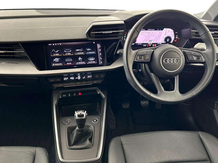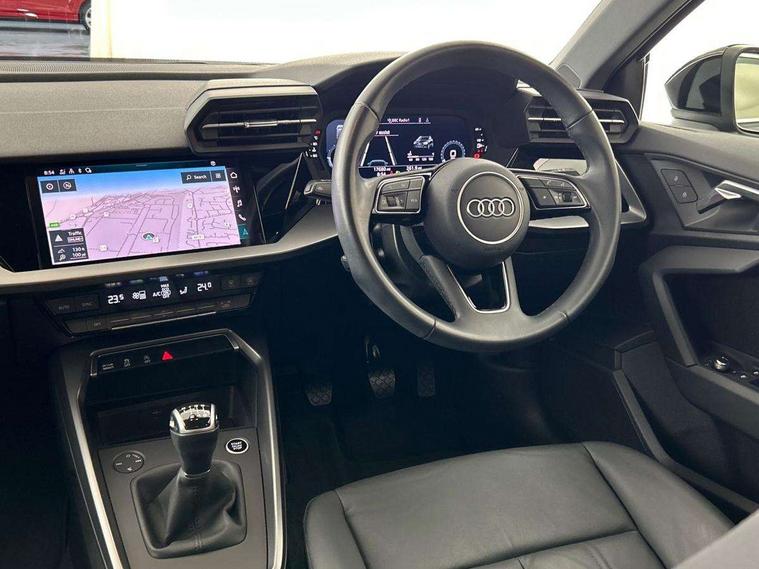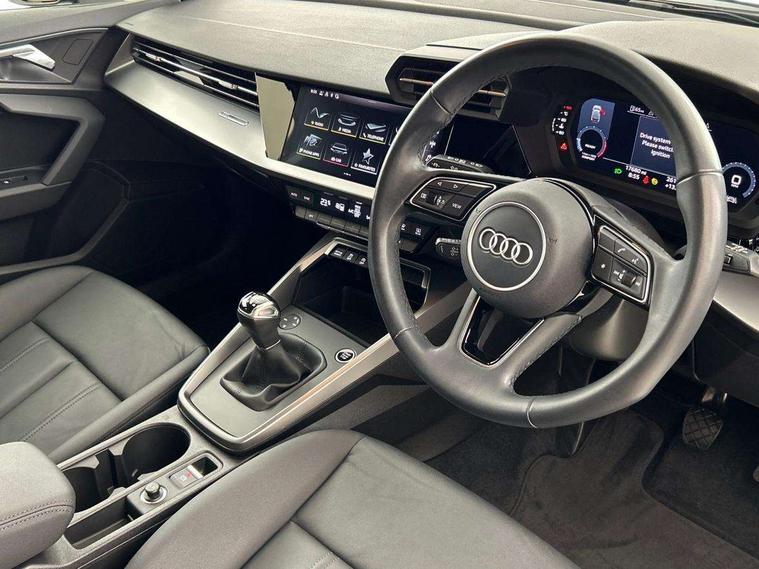Audi drive select (Auto, Comfort, Dynamic and Individual), Audi smartphone interface, Audi Virtual Cockpit - 10.25" digital and colour instrument cluster, Automatic start/stop system with recuperation, Bluetooth interface, Camera based traffic sign recognition, Collision avoidance assistant, Cruise control, e-Call (emergency call), Electromechanical power speed sensitive steering, Lane departure warning system, MMI Navigation Plus with high resolution 10.1" colour touch screen display, Rear parking sensors, Service indicator, Trip computer, Voice control system with natural language interaction, Standard suspension, 2xUSB-C connection with data and charging functions, 6 passive loudspeakers, DAB Digital radio, 3rd brake light, Acoustic glass windscreen, Aluminium window trim, Auto dimming frameless rear view mirror, Body colour exterior mirrors, Body colour roof spoiler, Electrically adjustable/heated/folding/auto dimming door mirrors with integrated LED indications + kerb view function for passenger side, Front electric windows, LED daytime running lights, LED headlights and halogen rear lights, Light and rain sensors, Rear electric windows, Rear side wing doors, Rear window, rear door windows and rear side windows in clear glass, Rear wiper, 12V socket and storage compartment in front centre console, 3 seat bench in 2nd row, 3 spoke leather multifunction steering wheel, 4 way electrically adjustable lumbar support for driver and front passenger, 60/40 split folding rear seat bench, Dual zone electronic climate control, Front and rear headrests, Front centre armrest, Front door sill trims with aluminium inlay, Front/rear floor mats, Height and reach adjustable steering wheel, Interior lighting - Front and rear roof module including reading lights, glove compartment light and right hand side, Interior lighting - glove compartment light and right hand side, Luggage compartment floor covering, Manual boot compartment lid, Manually adjustable front seats, Routine cloth upholstery with front sports seats, Seat side bolsters, Single front passenger seat, Steel grey cloth headlining, Aluminium interior elements pack - A3 Sportback, LED interior lighting pack - A3 Sportback, Sport styling pack - A3 Sportback, 3x3 point rear seat belts, Driver and front passenger airbag with passenger airbag deactivation, Electronic Stabilisation Control (ESC) including ABS, ASR and EDL, First aid kit with warning triangle and 2 safety vests, Front side airbags with head airbags and interaction airbag, Pre-sense front with pedestrian and cyclist detection, Seatbelt monitoring, Tyre pressure loss indicator, Anti theft alarm, Anti-theft wheel bolts, Electronically operated child lock, Immobiliser, Remote control central locking, Inlays with silk effect paint in platinum grey,